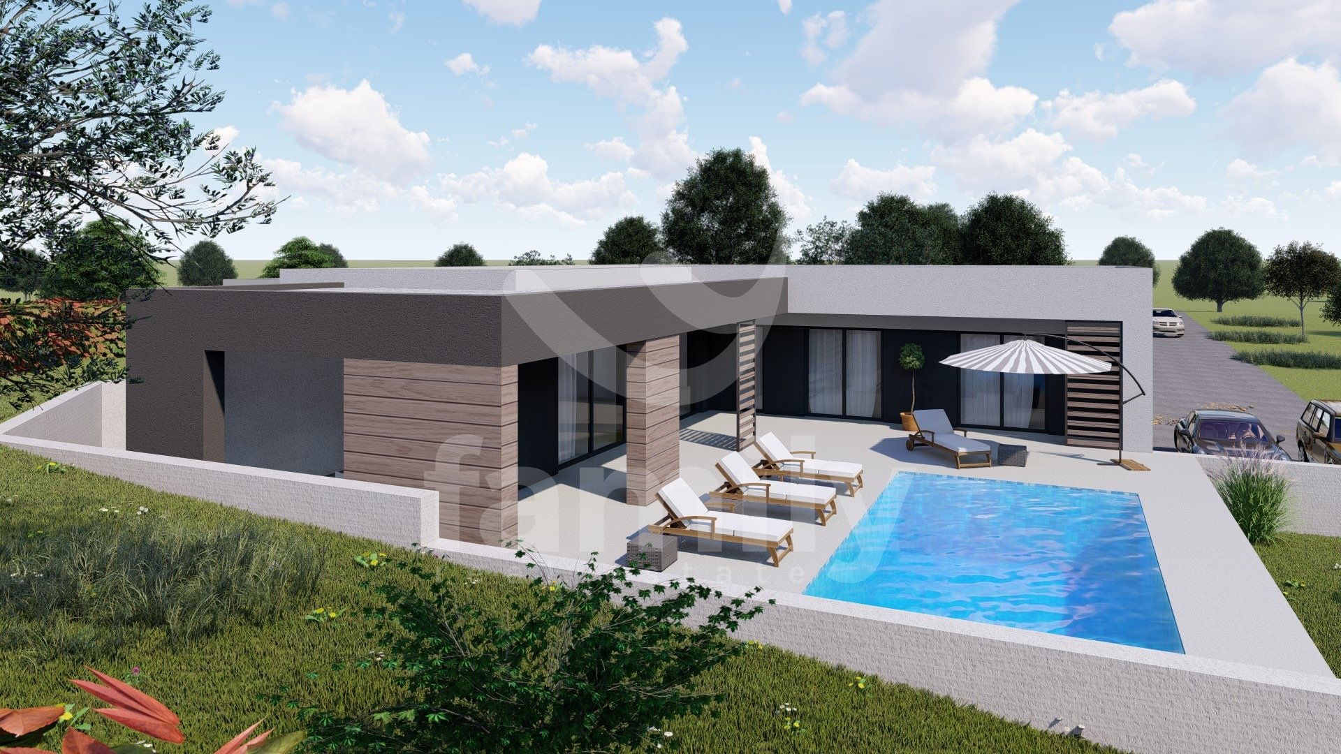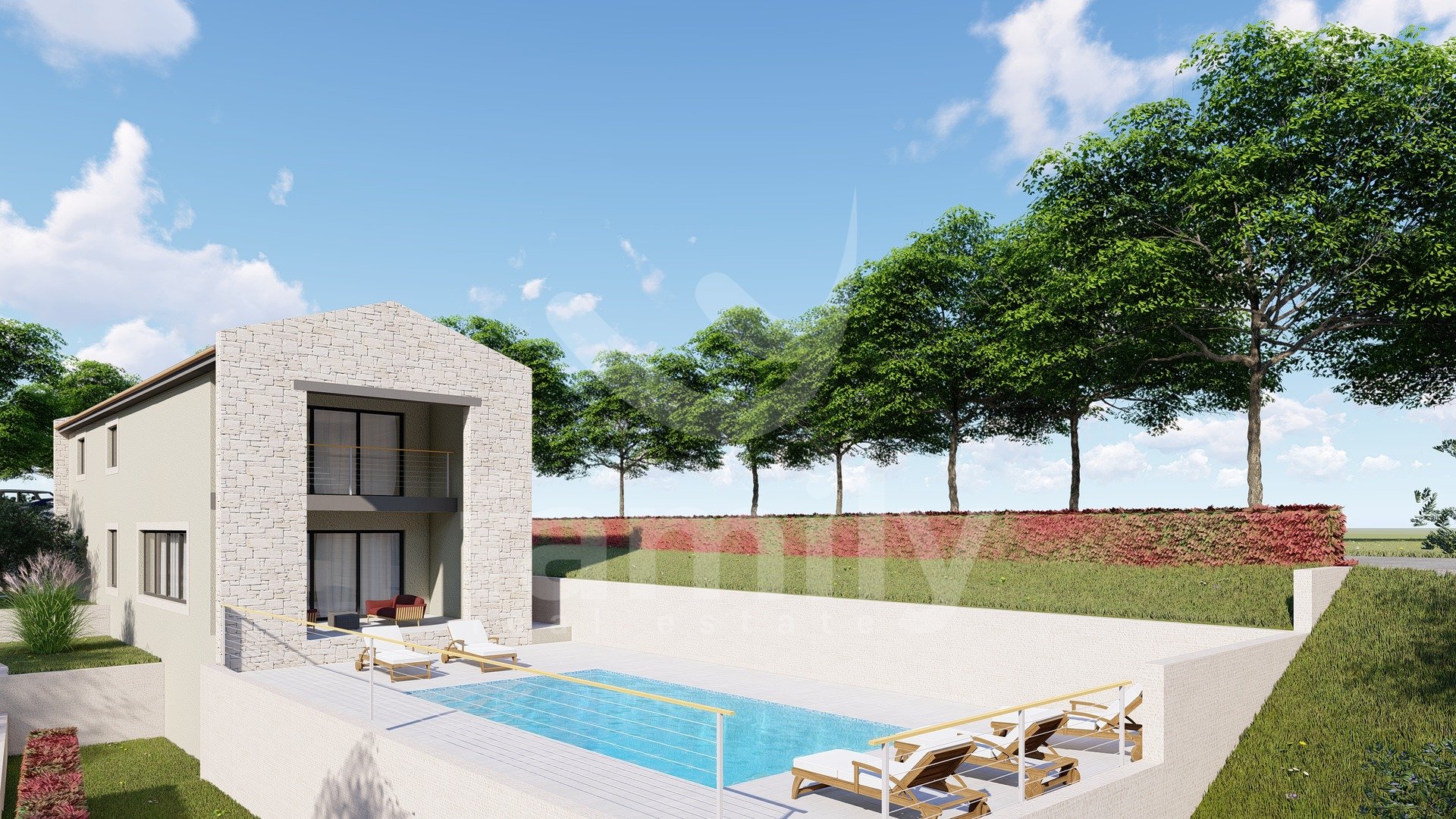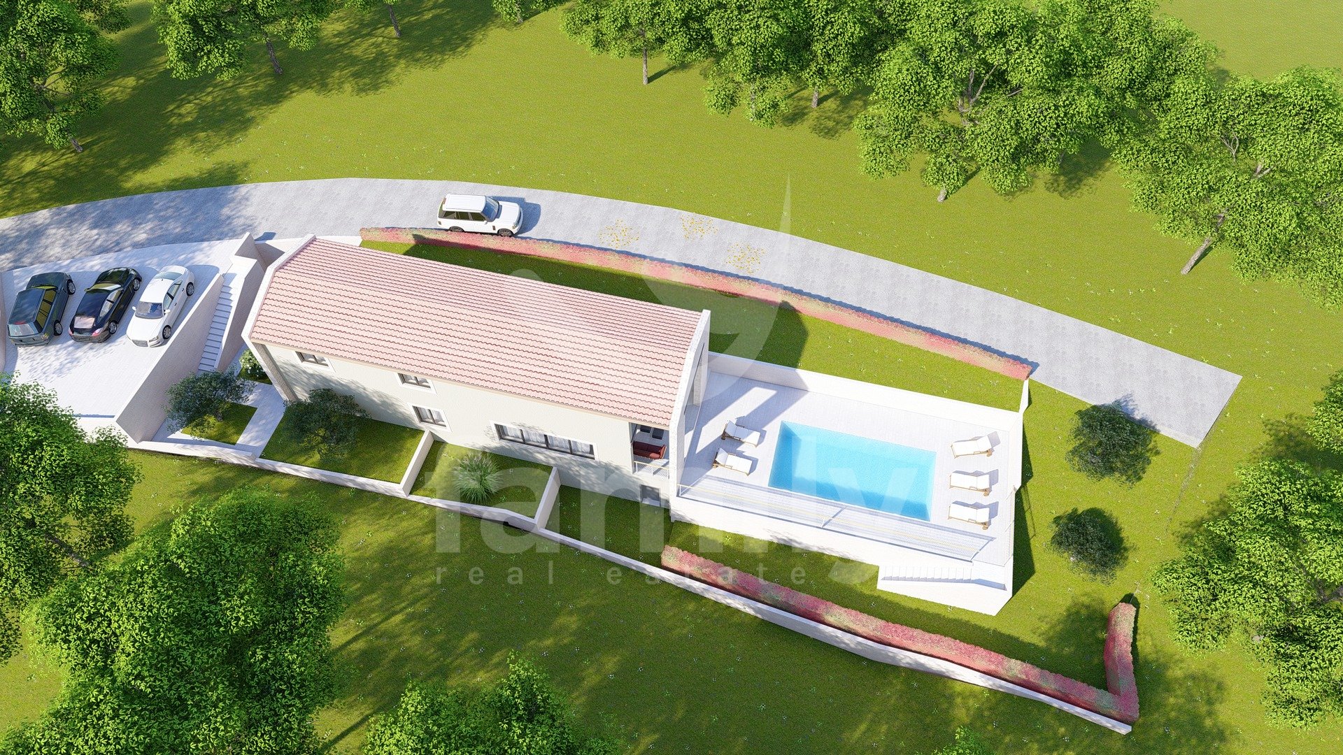 Not far from the town of Labin, in a quiet village, there is the mentioned attractive building plot for residential purposes of 877 m2. The plot has a regular rectangular shape, cascading terrain and a neat access road. All energy sources are located in the immediate vicinity and it is also surrounded by greenery and silence. A project has been prepared for the construction of a modern two-story house with a total living area of 215 m2 with a swimming pool and 3 parking spaces provided.