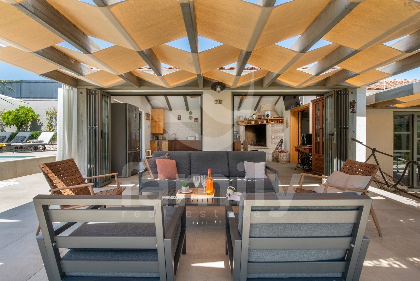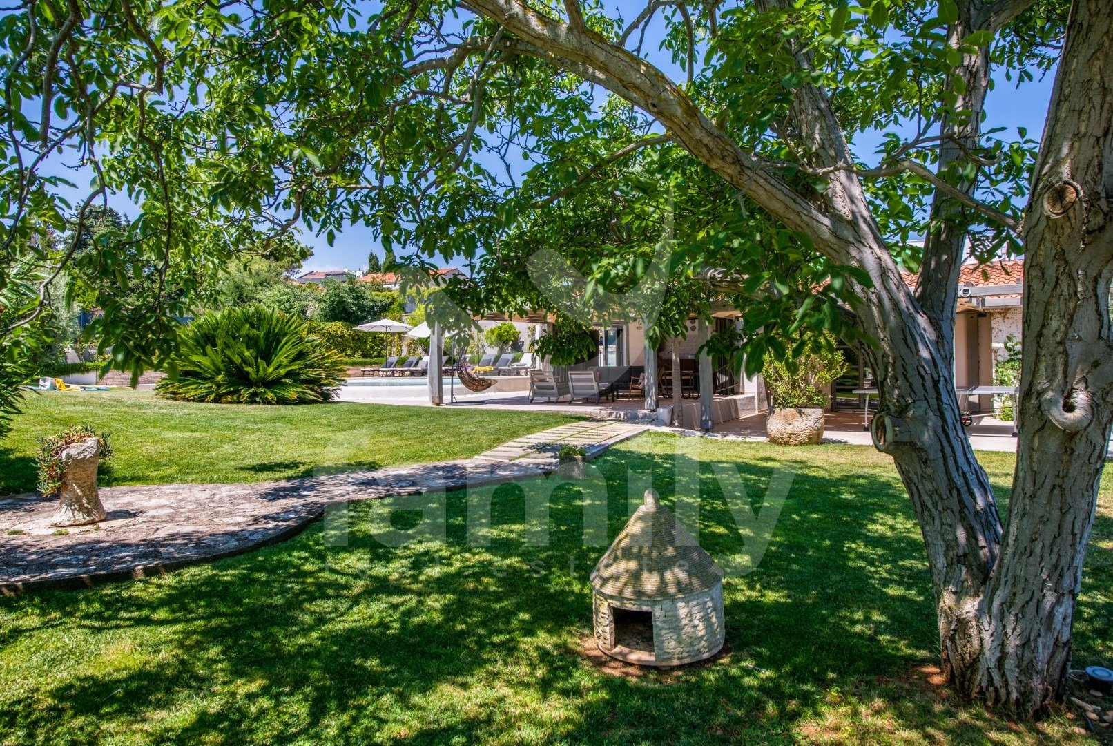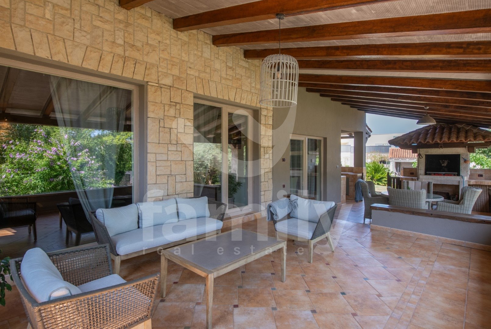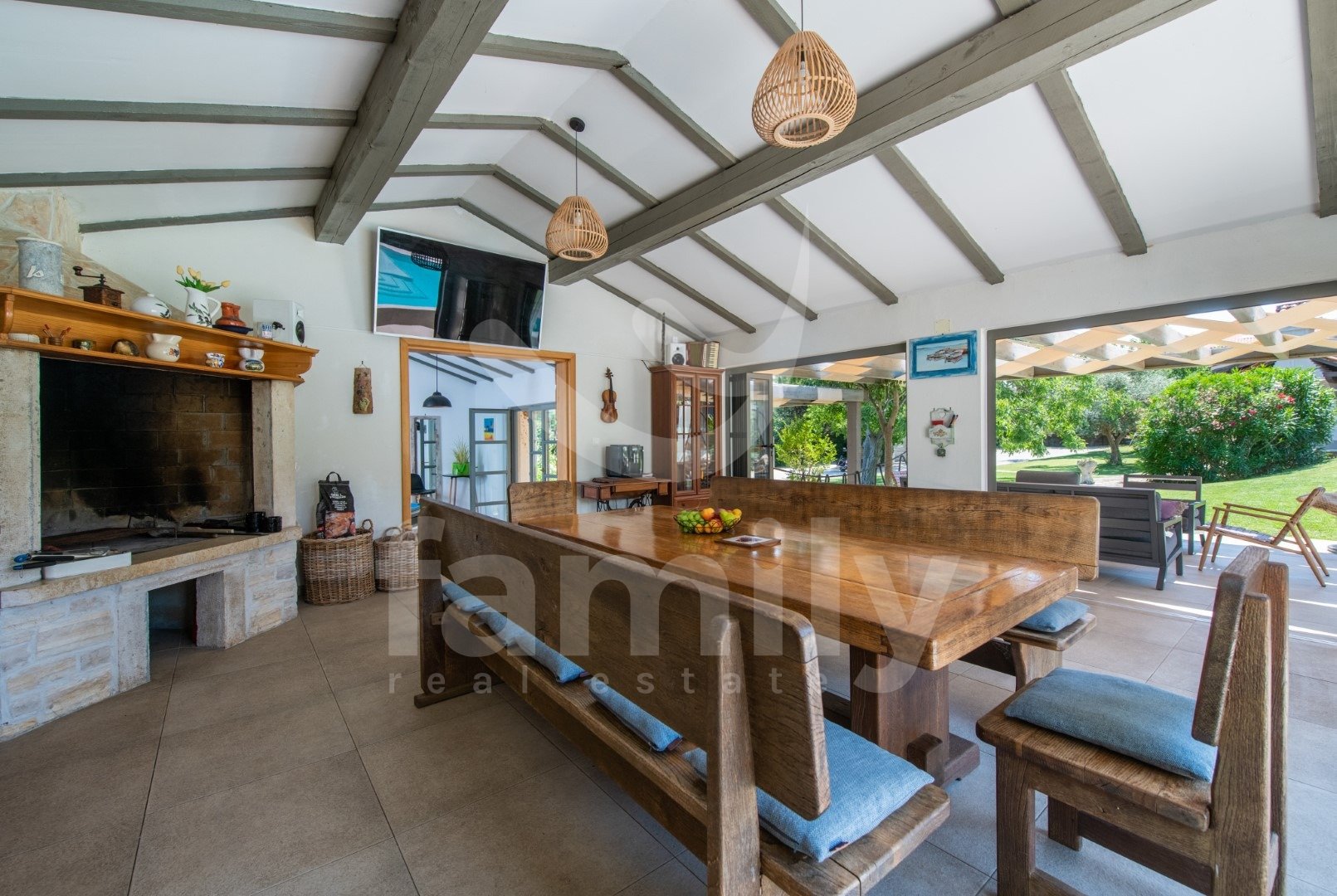 Der angelegte Garten bietet einen privaten Swimmingpool mit Liegewiese, eine überdachte Terrasse, eine 70 m² große, voll ausgestattete Taverne mit Kamin zum geselligen Beisammensein sowie ausreichend Platz zum Entspannen und Erholen. Die mediterrane, bewässerte Vegetation schafft eine friedliche Atmosphäre und macht diese Villa zu einer wahren Oase der Ruhe – ideal für Familien oder zur Ferienvermietung.