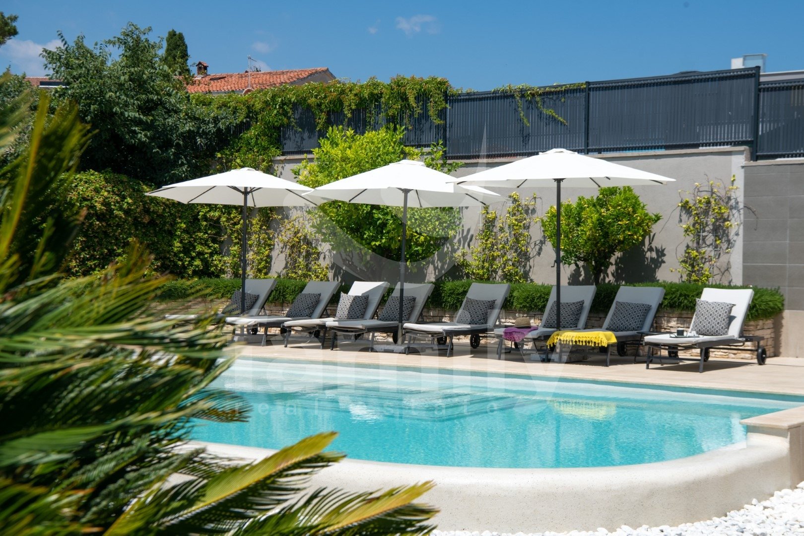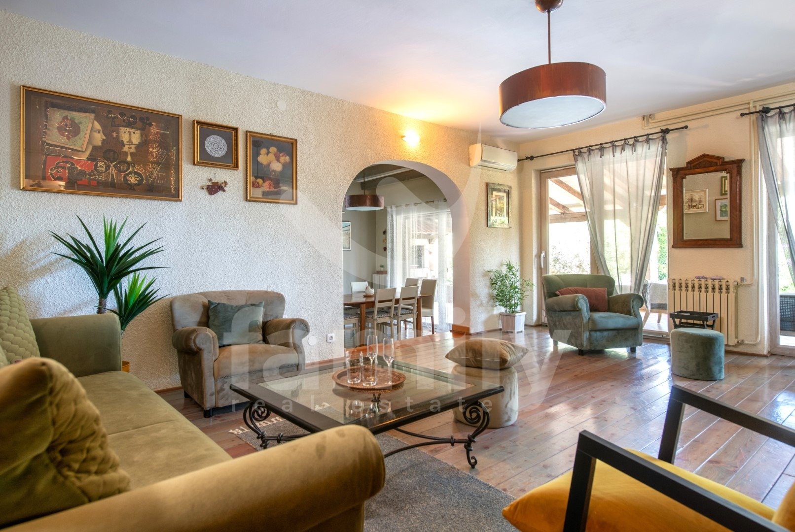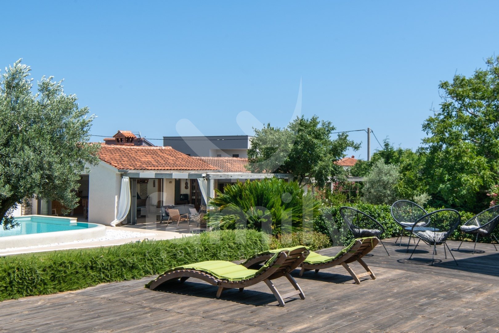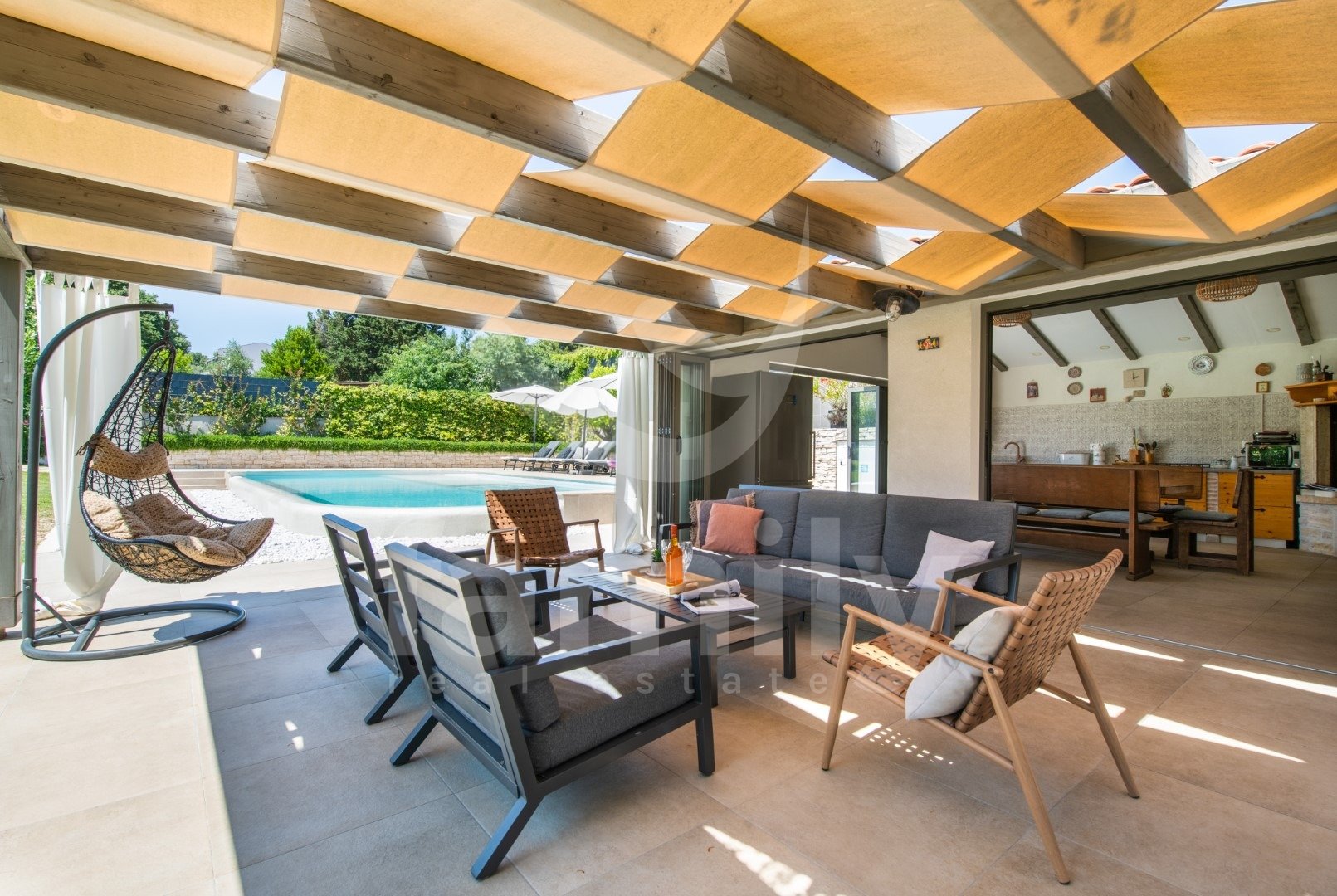 Diese komfortable Villa in Ližnjan mit 450 m² Wohnfläche in Meeresnähe bietet die perfekte Kombination aus Eleganz, Funktionalität und absoluter Privatsphäre. In ruhiger Lage auf einem 2368 m² großen Grundstück gelegen, bietet sie ideale Bedingungen zum Entspannen und Genießen das ganze Jahr über. Dank großer Glasflächen, die Innen- und Außenbereich miteinander verbinden, ist der großzügige Innenraum lichtdurchflutet. Die Villa verfügt über ein modern gestaltetes Erdgeschoss mit einem offenen Wohnbereich und Zugang zu einer überdachten Terrasse, einer voll ausgestatteten Küche mit Essbereich sowie zwei komfortablen Schlafzimmern und einem Badezimmer, die höchsten Wohnkomfort bieten. Jedes Zimmer wurde sorgfältig gestaltet, um ein großzügiges und behagliches Wohngefühl zu vermitteln.