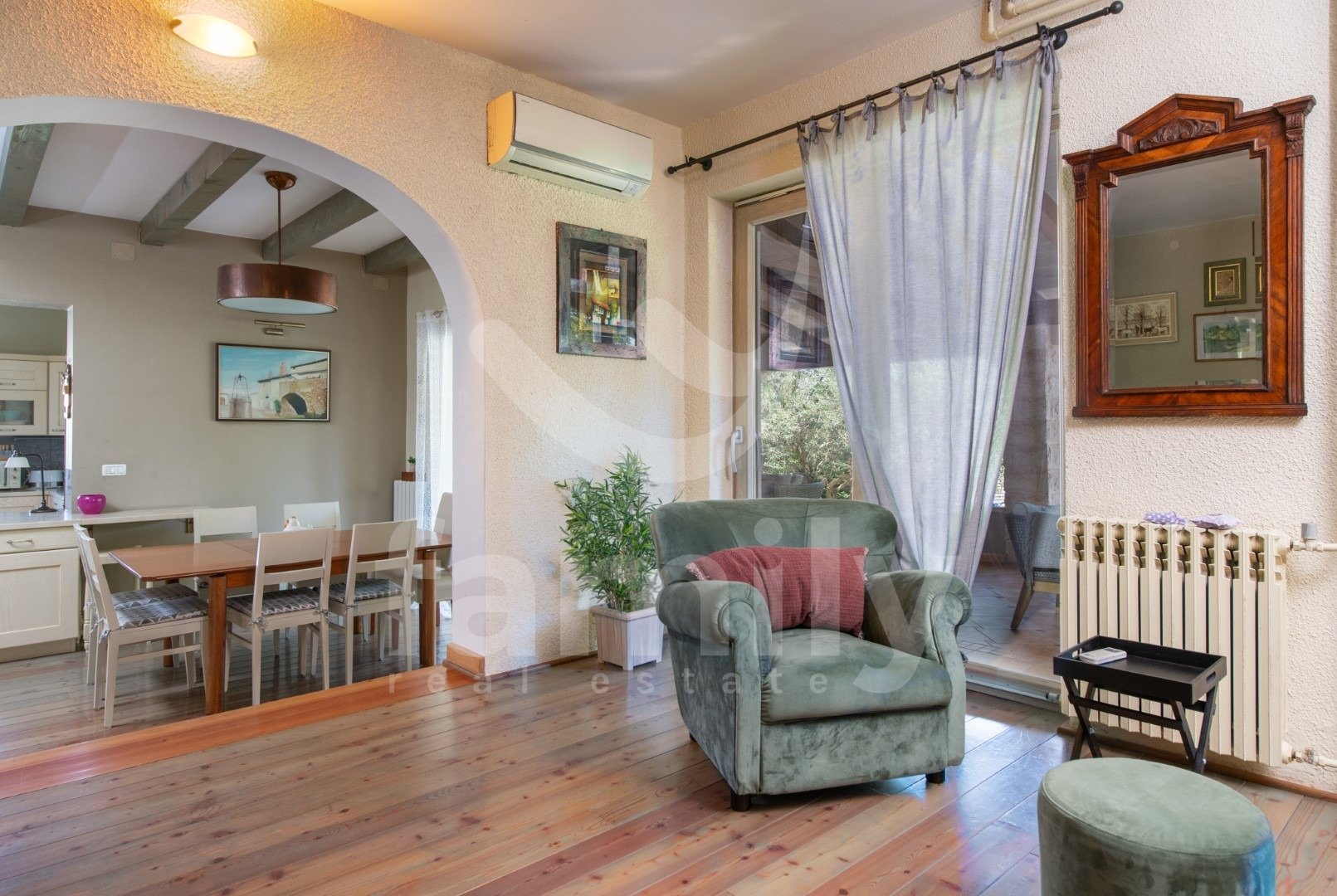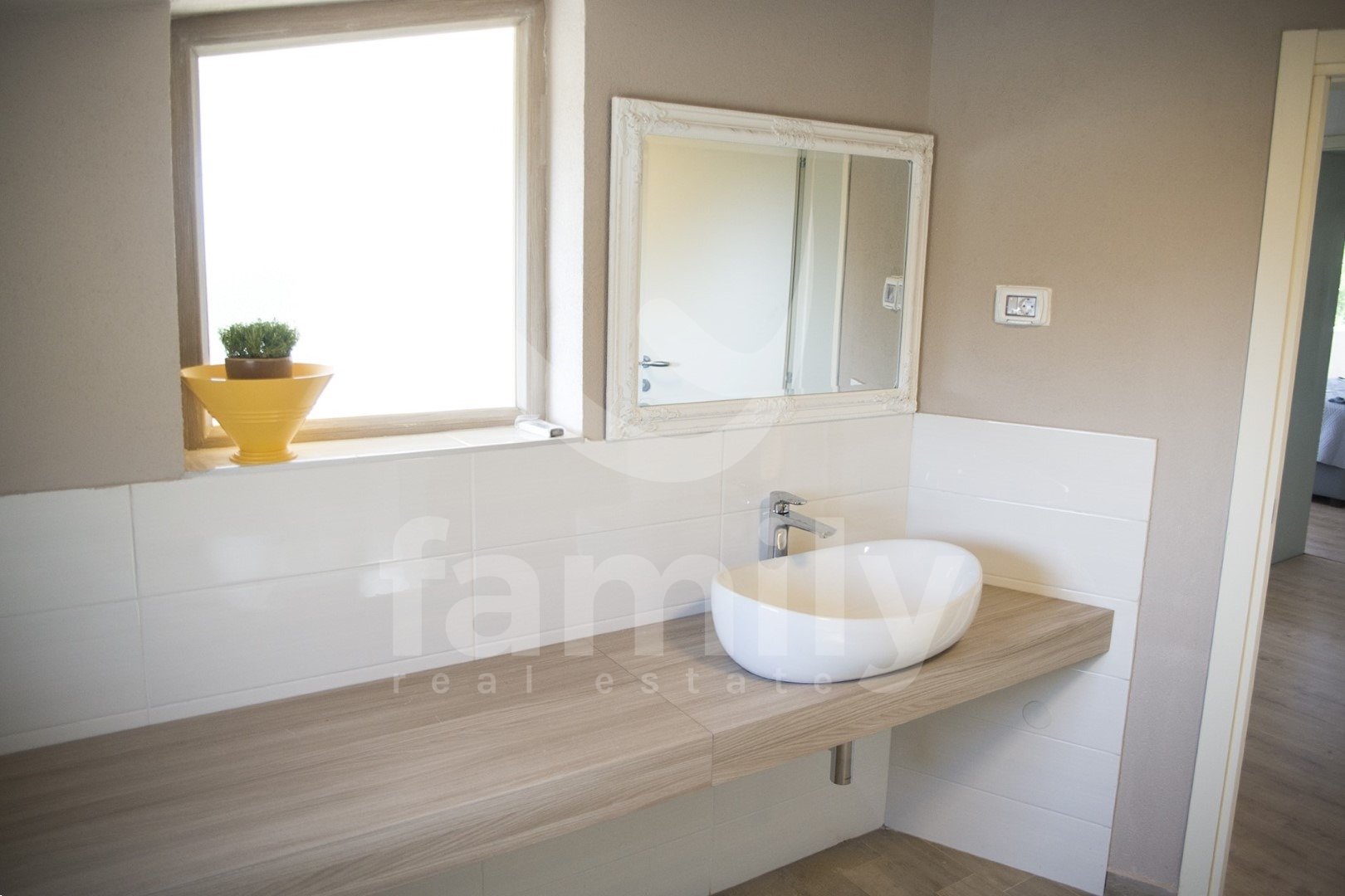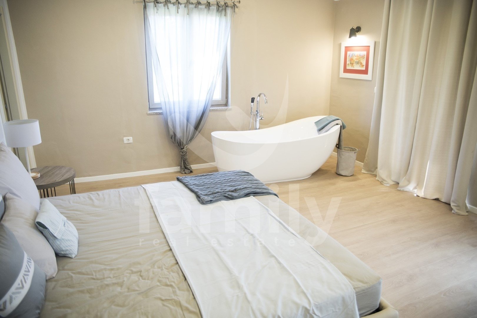 Eine moderne Treppe führt in den ersten Stock, wo sich die Schlafzimmer, Badezimmer und Terrassen mit Blick auf den traumhaften Innenhof mit beheiztem Pool befinden. Das Haus ist mit PVC-Fenstern und -Türen mit Rollläden ausgestattet. Küche und Badezimmer sind mit hochwertigen Keramikfliesen belegt, während Wohnzimmer und Schlafzimmer mit Lärchenparkett und Laminat ausgelegt sind. Die Heizung erfolgt zentral über elektrische Heizkörper, und Klimaanlagen sind im gesamten Haus installiert. Das Dachgeschoss und das zweite Obergeschoss sind ebenfalls nutzbar. Die Villa wird möbliert verkauft.