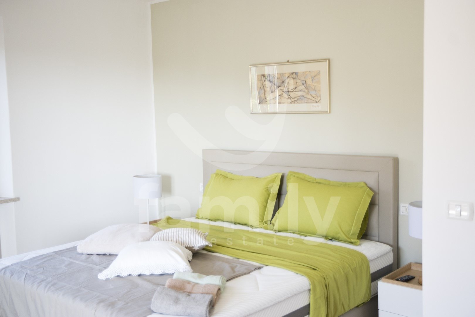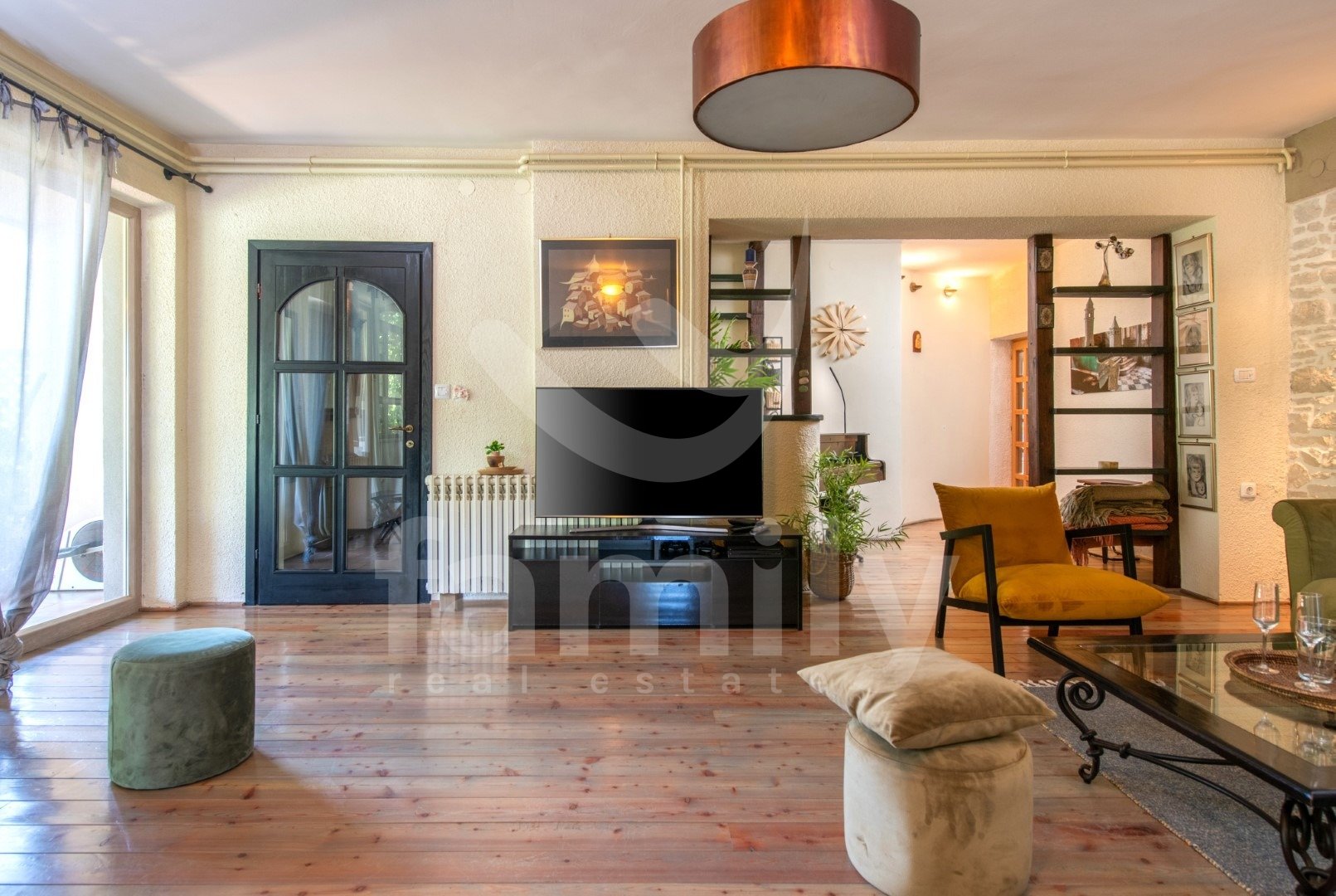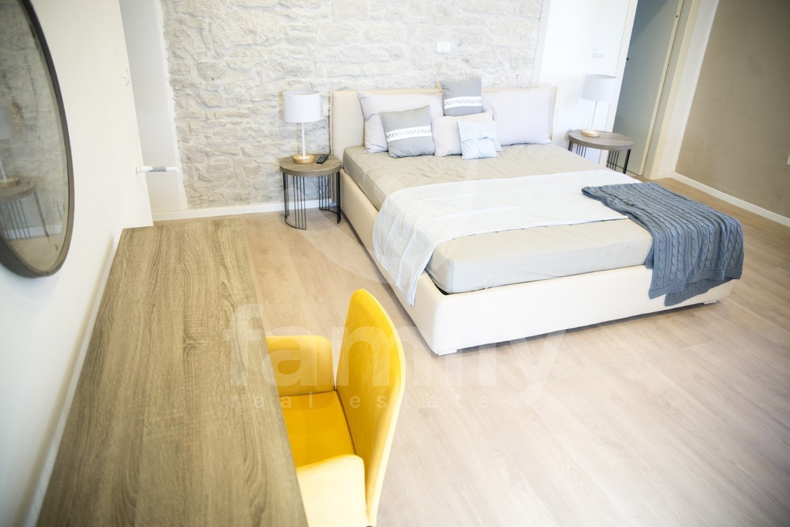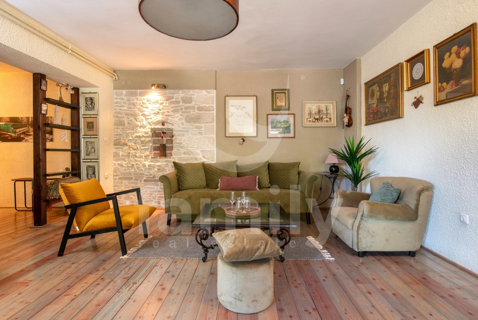 Eine moderne Treppe führt in den ersten Stock, wo sich die Schlafzimmer, Badezimmer und Terrassen mit Blick auf den traumhaften Innenhof mit beheiztem Pool befinden. Das Haus ist mit PVC-Fenstern und -Türen mit Rollläden ausgestattet. Küche und Badezimmer sind mit hochwertigen Keramikfliesen belegt, während Wohnzimmer und Schlafzimmer mit Lärchenparkett und Laminat ausgelegt sind. Die Heizung erfolgt zentral über elektrische Heizkörper, und Klimaanlagen sind im gesamten Haus installiert. Das Dachgeschoss und das zweite Obergeschoss sind ebenfalls nutzbar. Die Villa wird möbliert verkauft.