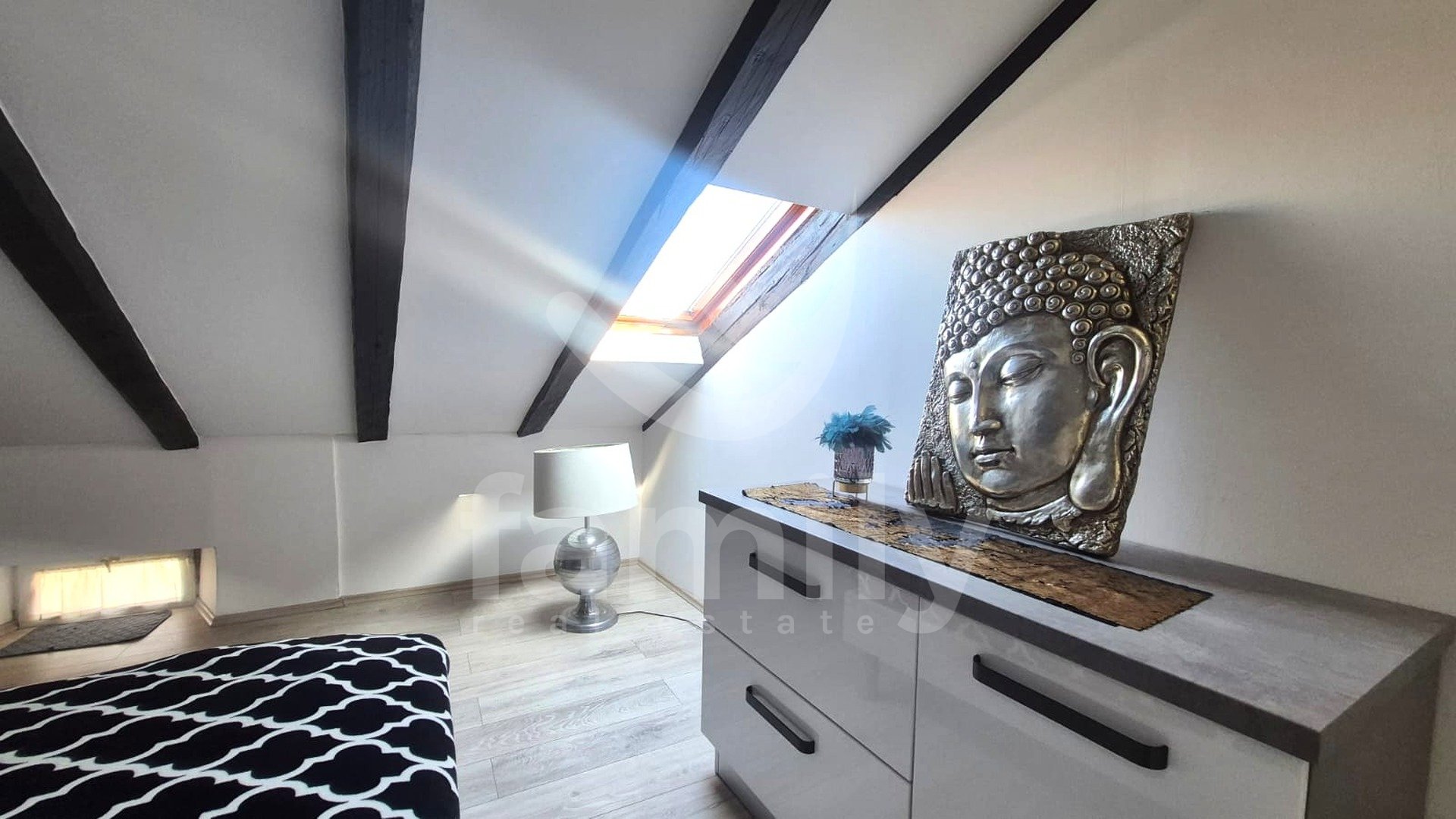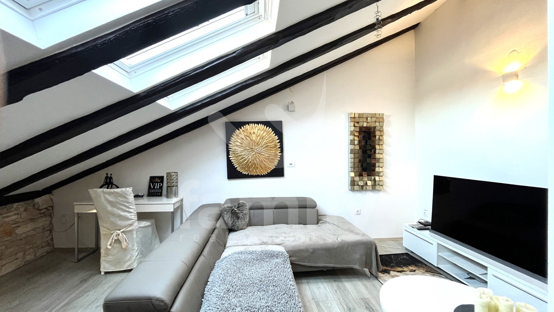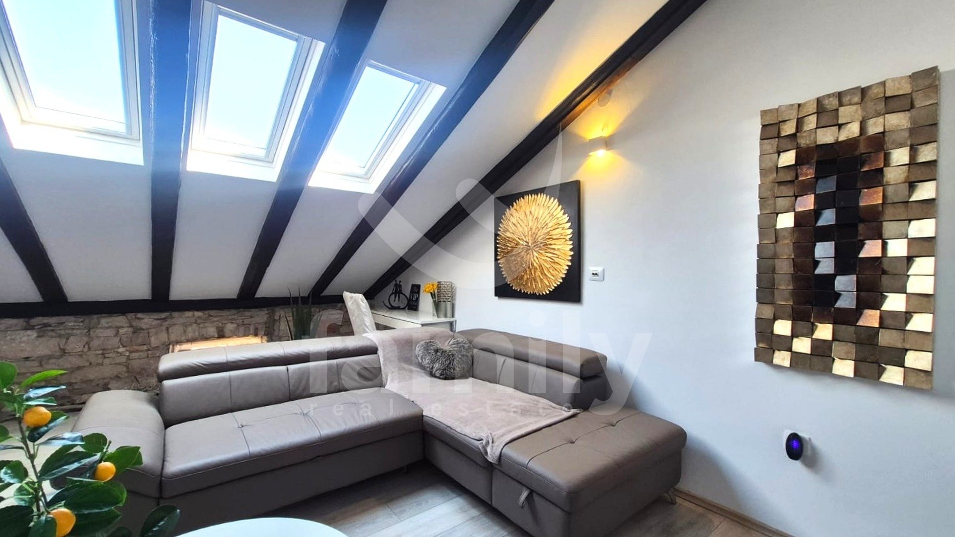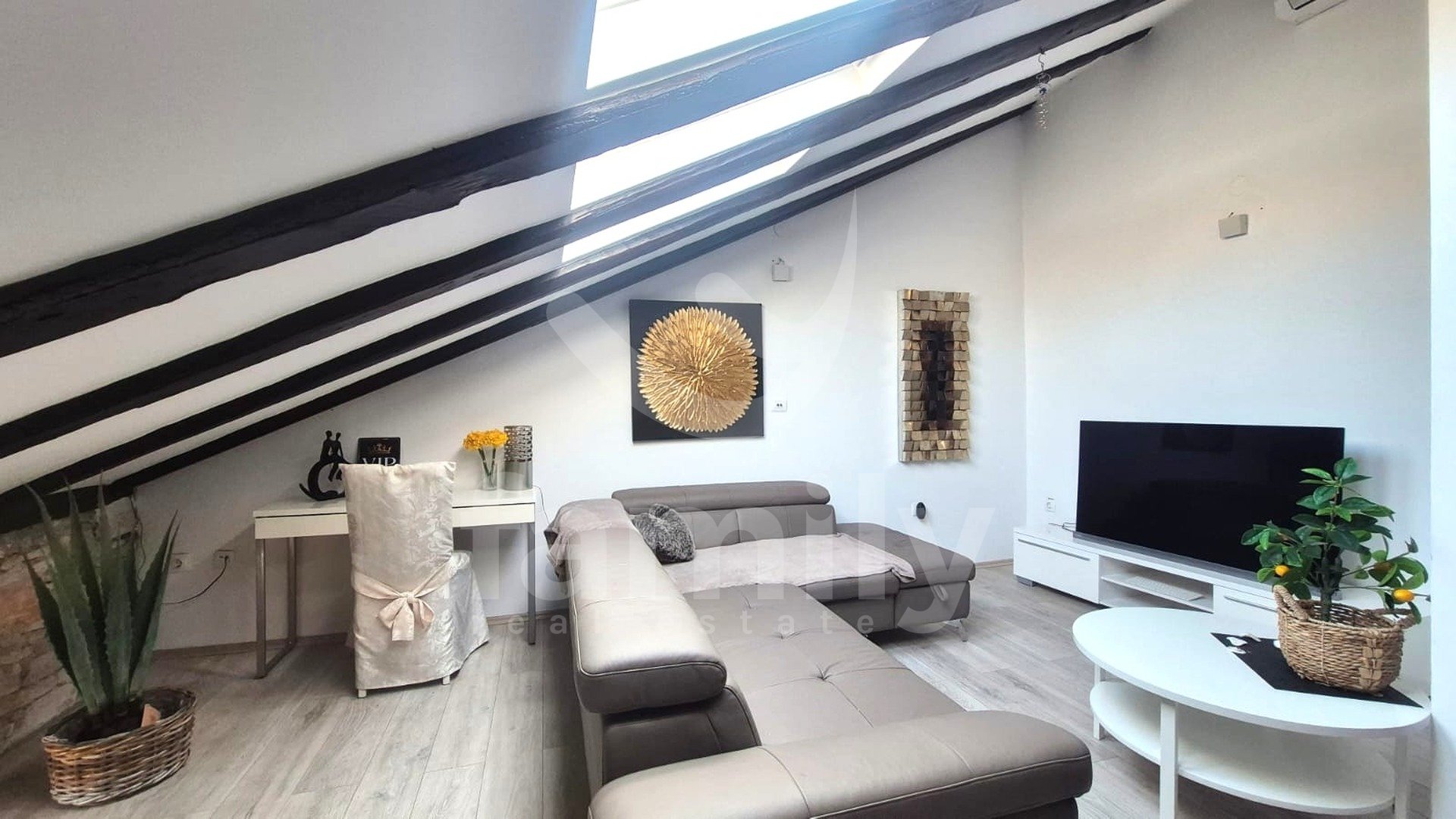 Nadomak samoga centra grada Pule smješten je ovaj atraktivni prostrani stan 62 m2 na trećem katu stambene zgrade. Stan se nalazi u potkrovlju i sastoji se od: ulaznog hodnika, kupatila, dnevnog boravka, kuhinje s blagavaonicom, jednom spavaćom sobom i zatvorene terase. Stan se prodaje uređen i namješten. Za grijanje se koristi peć na drva, a za hlađenje se koriste tri jedinice klima uređaja od kojih je u svakoj sobi po jedna. U svim sobama je položen laminat. Postoji mogućnost da se dnevni boravak prenamjeni u još jednu spavaću sobu. U dvorištu zgrade nalazi se privatni parking.