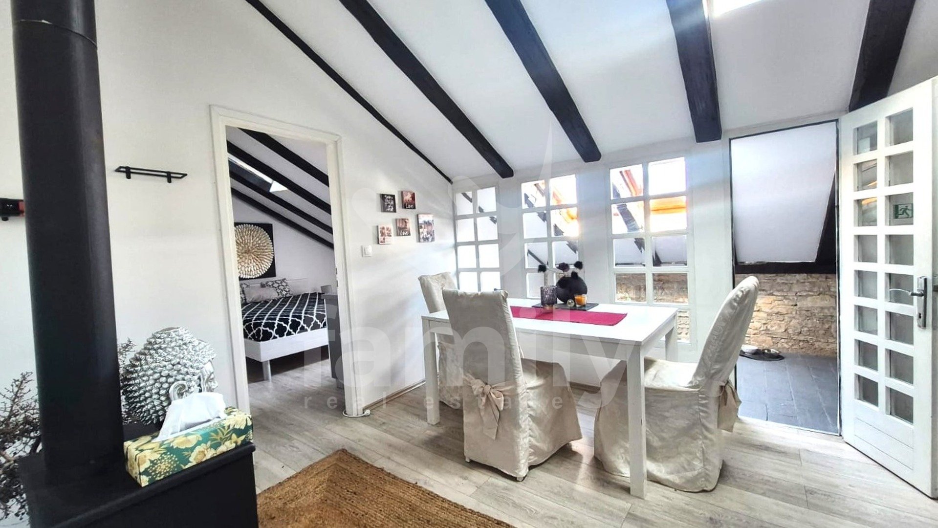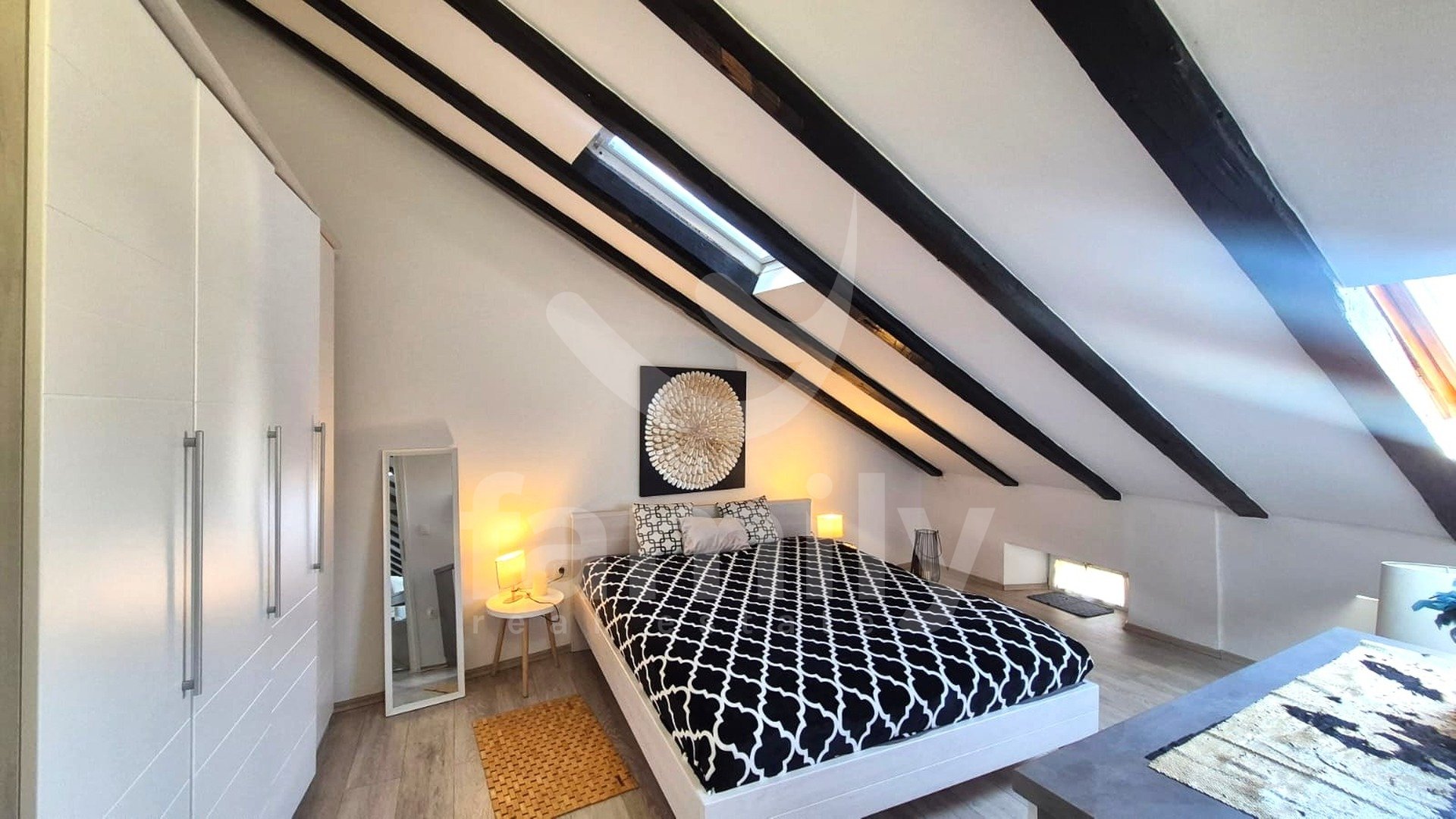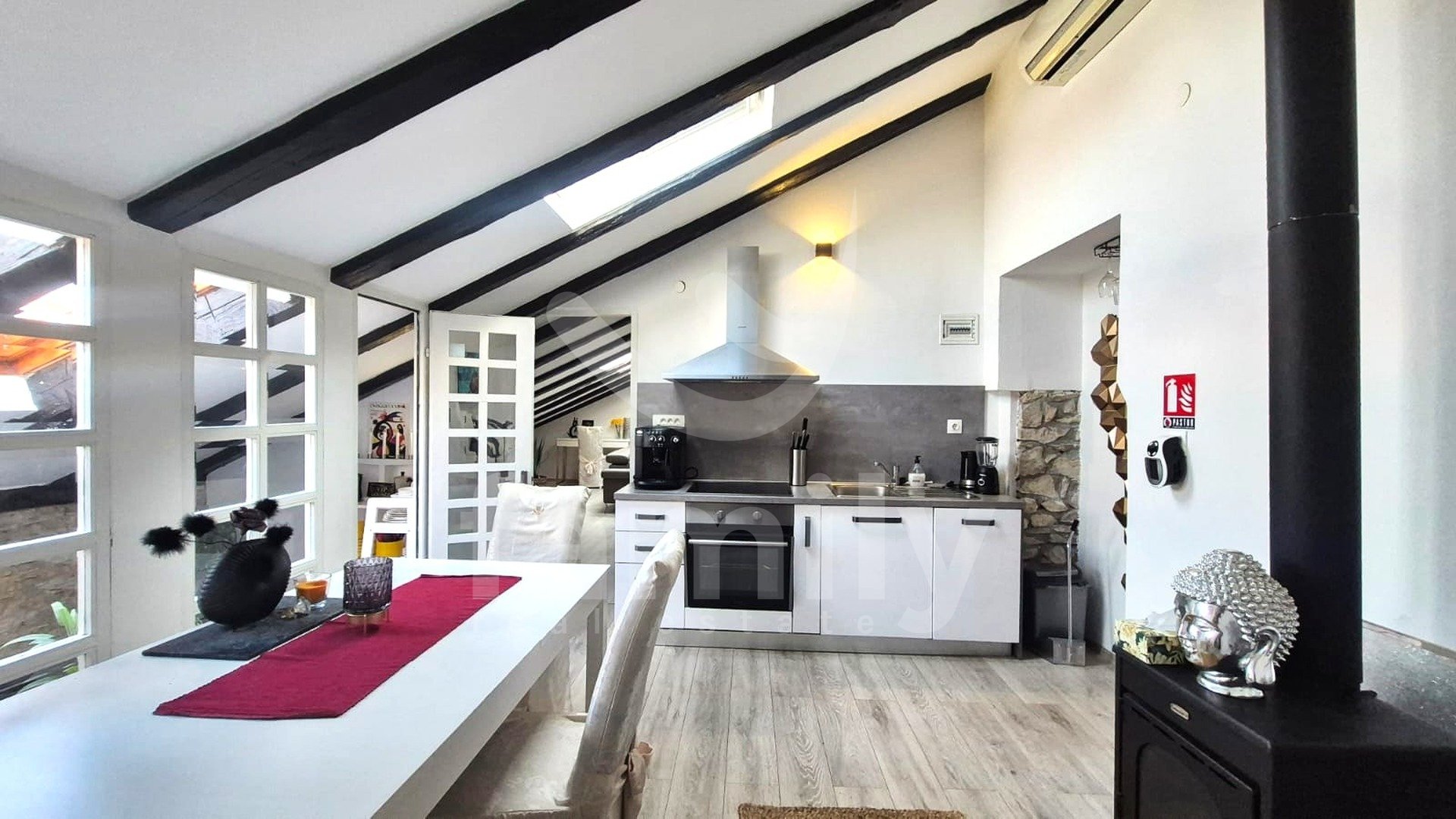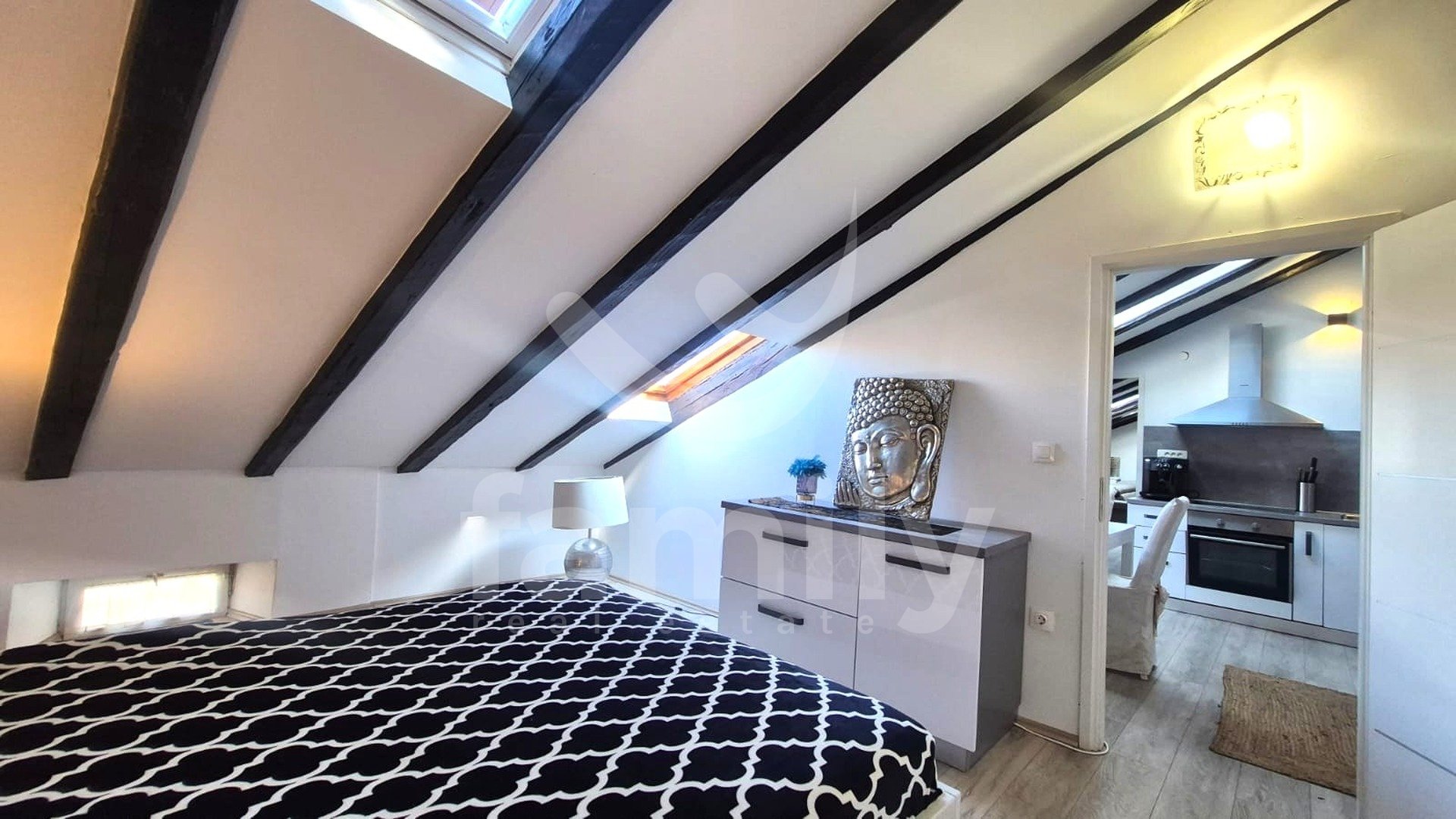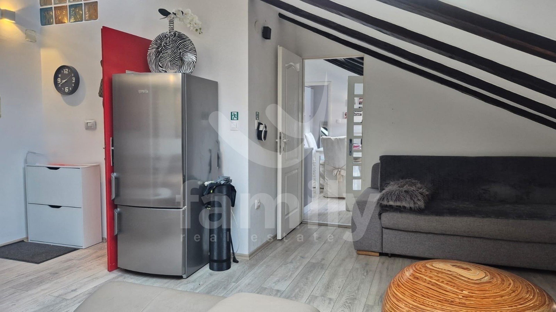 Nadomak samoga centra grada Pule smješten je ovaj atraktivni prostrani stan 62 m2 na trećem katu stambene zgrade. Stan se nalazi u potkrovlju i sastoji se od: ulaznog hodnika, kupatila, dnevnog boravka, kuhinje s blagavaonicom, jednom spavaćom sobom i zatvorene terase. Stan se prodaje uređen i namješten. Za grijanje se koristi peć na drva, a za hlađenje se koriste tri jedinice klima uređaja od kojih je u svakoj sobi po jedna. U svim sobama je položen laminat. Postoji mogućnost da se dnevni boravak prenamjeni u još jednu spavaću sobu. U dvorištu zgrade nalazi se privatni parking.