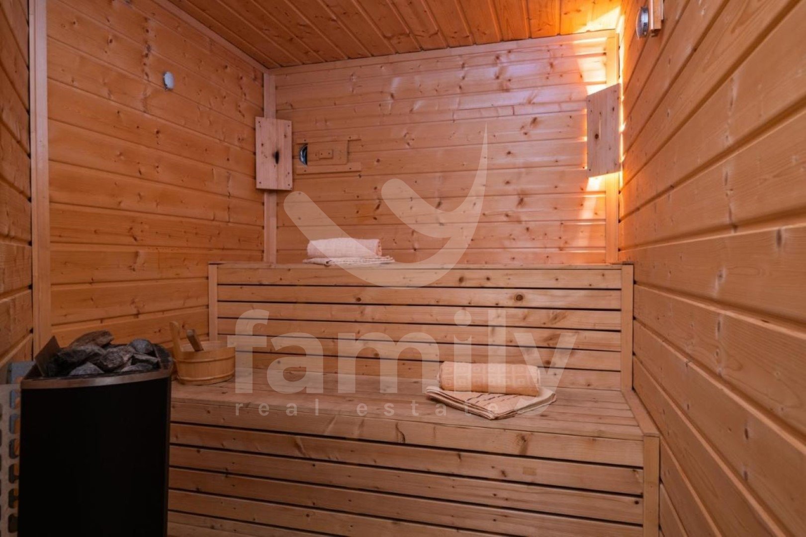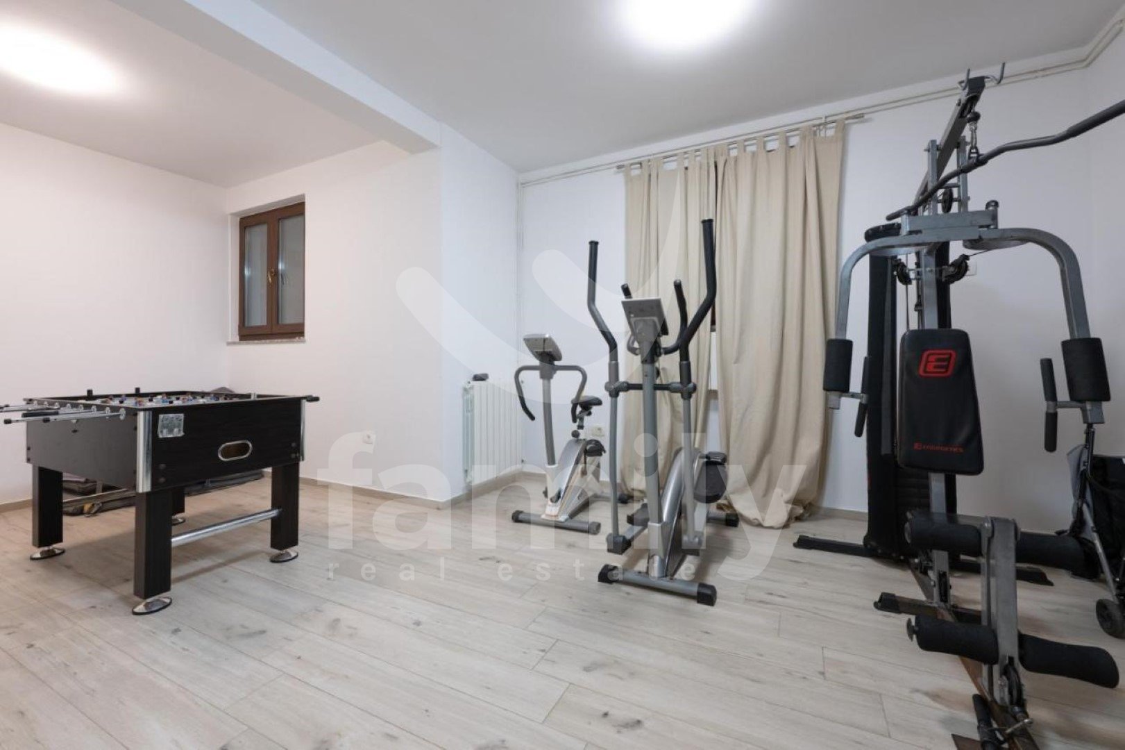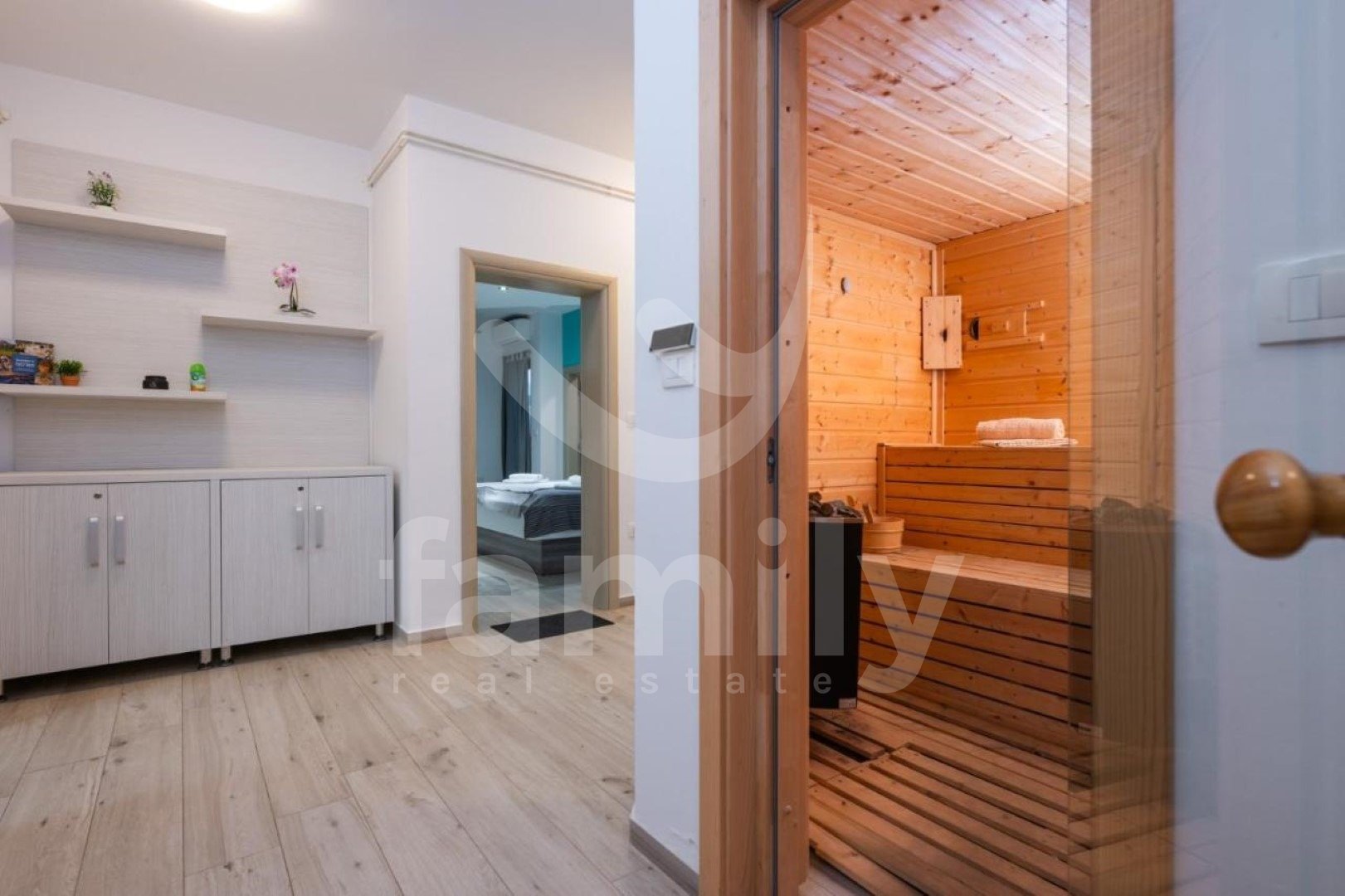 Il piano terra è composto da due comode camere da letto, ciascuna con bagno privato e accesso diretto alla terrazza. Al piano terra si trovano anche una sauna, una palestra, un tavolo da biliardo e una lavanderia.