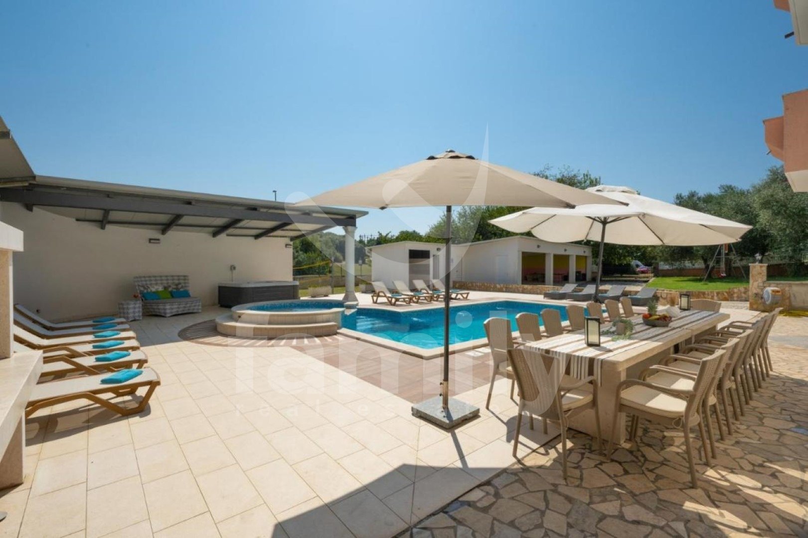 Il cortile della villa offre vari servizi, come una piscina circondata da lettini prendisole, un barbecue, un grande tavolo per le riunioni, una vasca idromassaggio nella parte coperta del cortile, 2 docce e servizi igienici, e un trampolino, altalene e uno scivolo per i più piccoli.