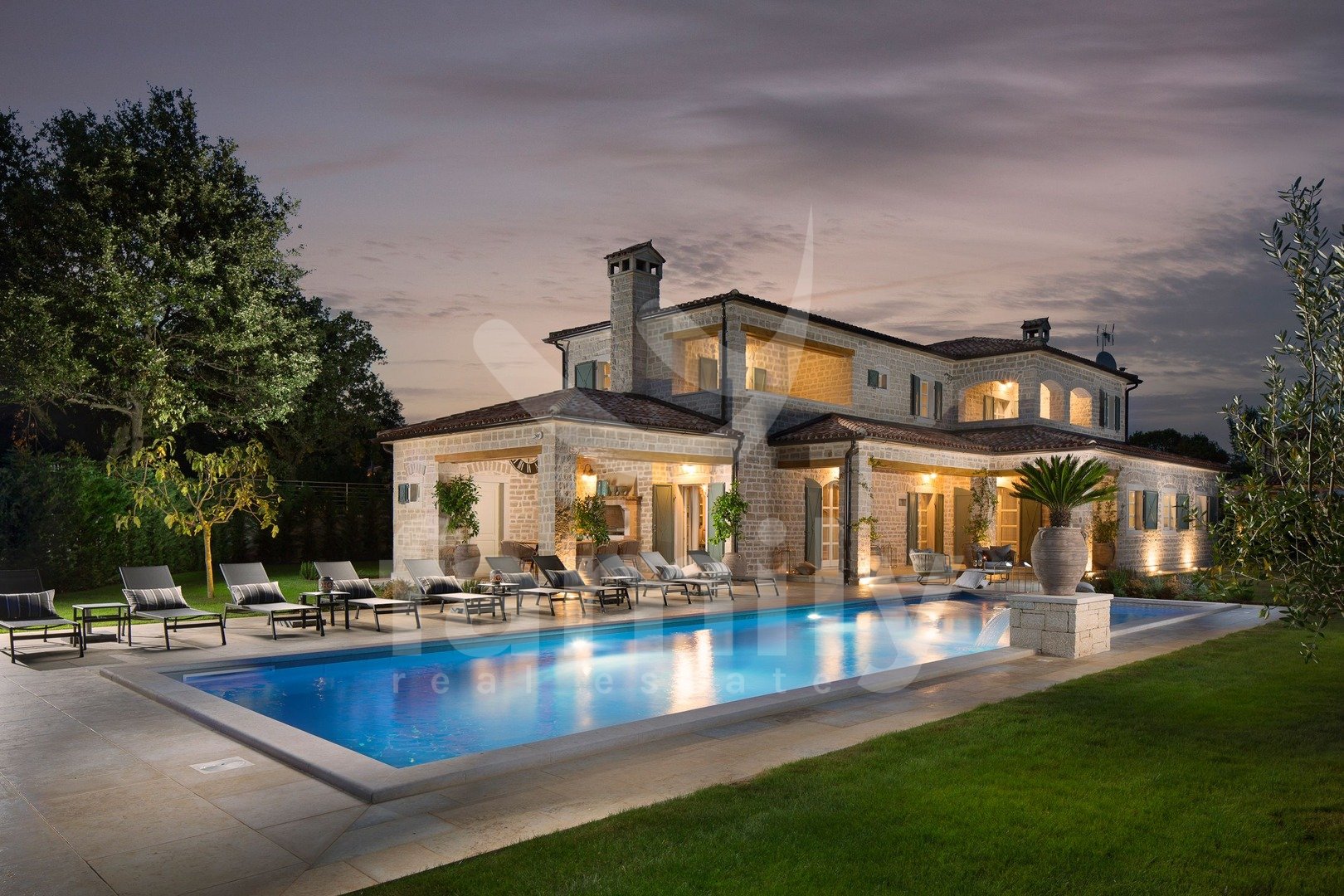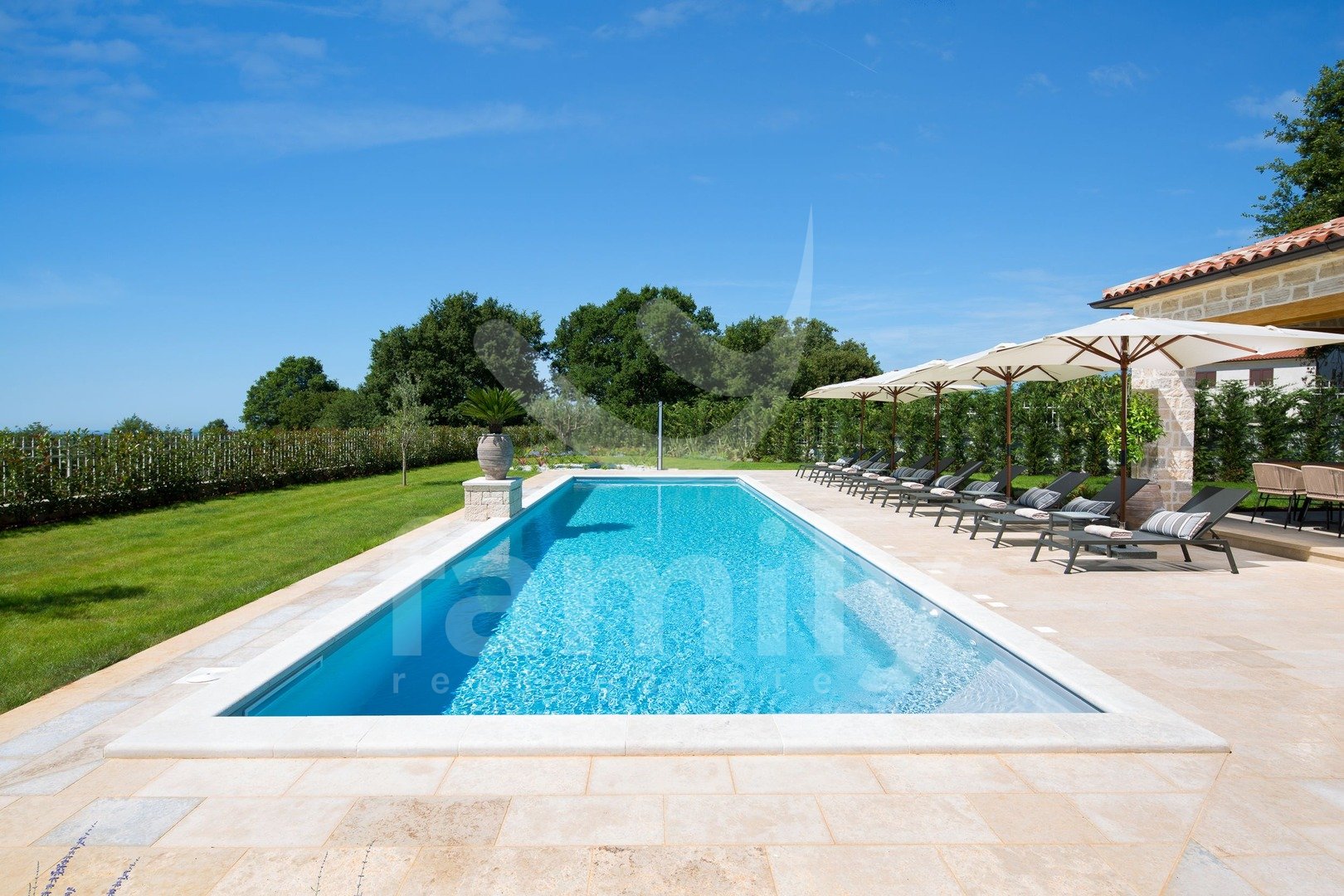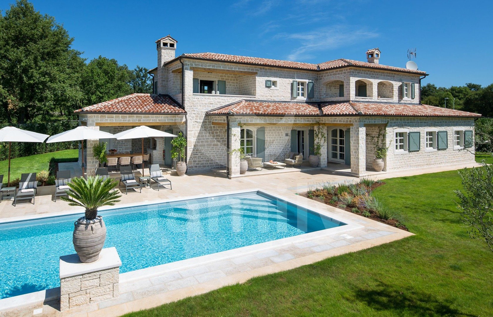 Non lontano da Canfanaro, in un piccolo villaggio, si trova questa splendida e lussuosa villa di 372 m² con un giardino di 1611 m². La villa si estende su due piani, piano terra e primo piano. Il piano terra ospita un soggiorno estremamente spazioso con camino, una sala da pranzo per un gran numero di ospiti, una cucina rustica e moderna completamente attrezzata, due camere da letto con bagno privato, mentre al primo piano si trovano altre tre camere da letto, ciascuna con il proprio bagno, due delle quali hanno accesso a una terrazza con una splendida vista sul mare e su Rovigno. Il giardino è imponente e dispone di una piscina di 67 m², una terrazza solarium, una cucina estiva, un bagno, una doccia solare e numerosi posti auto. Oltre a tutto quanto sopra, la proprietà comprende anche campi sportivi per pallamano, basket e calcio, un campo da pallavolo, due campi da tennis, una pista da bowling, un'area fitness all'aperto, un parco giochi per bambini e un orto ecologico con ingredienti freschi e genuini.