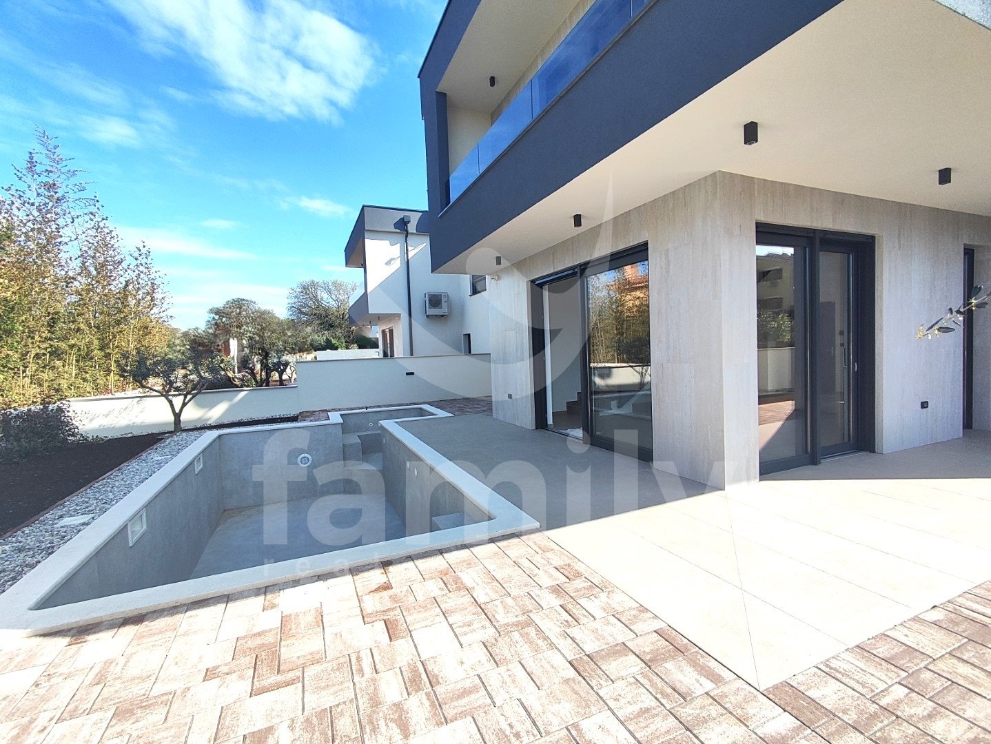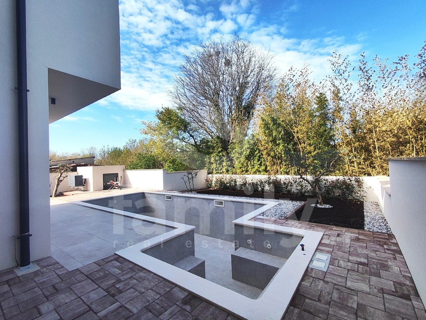 Il cortile è costituito da una parte pavimentata e da una parte con una piccola area verde e piante decorative, per una superficie totale di 298 m²; un passaggio conduce alla piscina, che è piuttosto nascosta dalle proprietà vicine e garantisce la massima privacy. La piscina ha una superficie totale di 30 m² ed è dotata di un sistema di riscaldamento e di una sala macchine in una zona separata dalla piscina. Nell'area esterna è presente anche una doccia esterna, realizzata appositamente all'interno di un unico ambiente, in modo da avere letteralmente una porta da chiudere e isolarsi da ogni vista, come se ci si trovasse in un bagno. L'area verde intorno alla piscina e diversi ulivi ornamentali, dove si trova una zona relax, rendono questo spazio davvero speciale e piacevole da vivere.