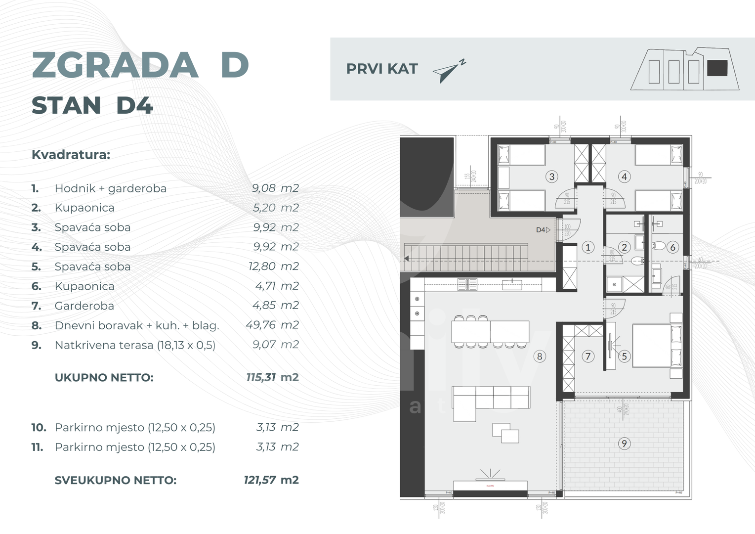 A Fasana, in una posizione eccellente, vicino al centro di Fasana e alle prime spiagge ben curate, inizierà presto la costruzione di quattro edifici per un totale di 23 unità abitative. La costruzione stessa sarà di alta qualità, lussuosa e unica, realizzata da un investitore di comprovata esperienza. Questo appartamento moderno e di alta qualità sarà situato al primo piano dell'edificio, con una superficie di 121,57 m² e due posti auto coperti. Sarà composto da un corridoio con guardaroba, tre luminose camere da letto, due bagni, un soggiorno molto spazioso con una superficie impressionante di 49,76 m² di open space con cucina e sala da pranzo e accesso a una terrazza coperta di 9,07 m². Nell'ambito del progetto è prevista anche una piscina comune di 85 m². Tutti gli edifici sono dotati di porte d'ingresso antieffrazione con elevato isolamento acustico e maggiore resistenza al fuoco, riscaldamento a pavimento nei bagni con possibilità di pagamento extra per gli altri locali, serramenti in PVC a tre strati di tipo francese su tutte le aperture esterne con persiane e zanzariere, nonché piastrelle in ceramica di alta qualità in tutto l'edificio con possibilità di scelta dei materiali in base alle proprie preferenze. Anche il sistema di riscaldamento e raffreddamento sarà regolato tramite l'unità di aria condizionata.