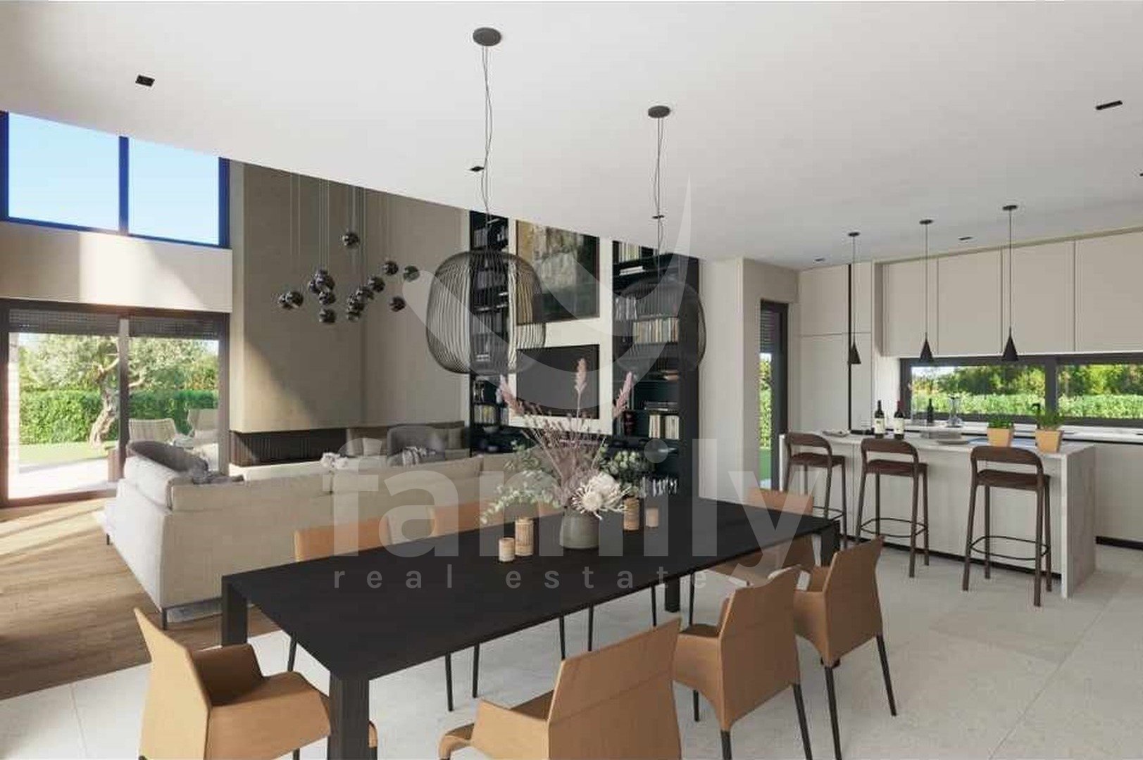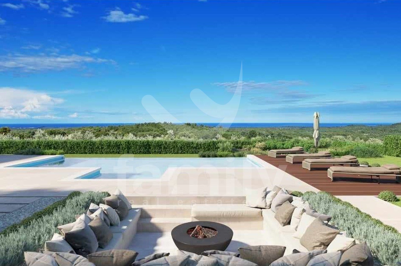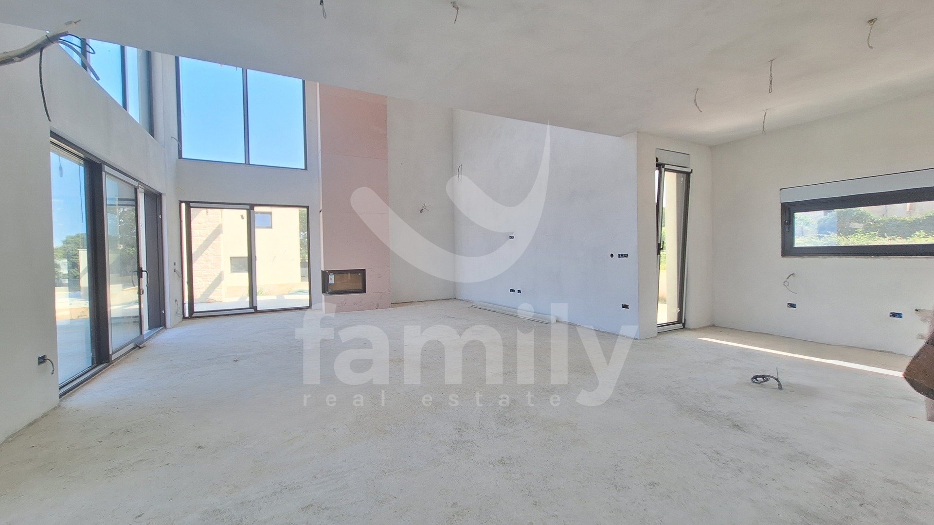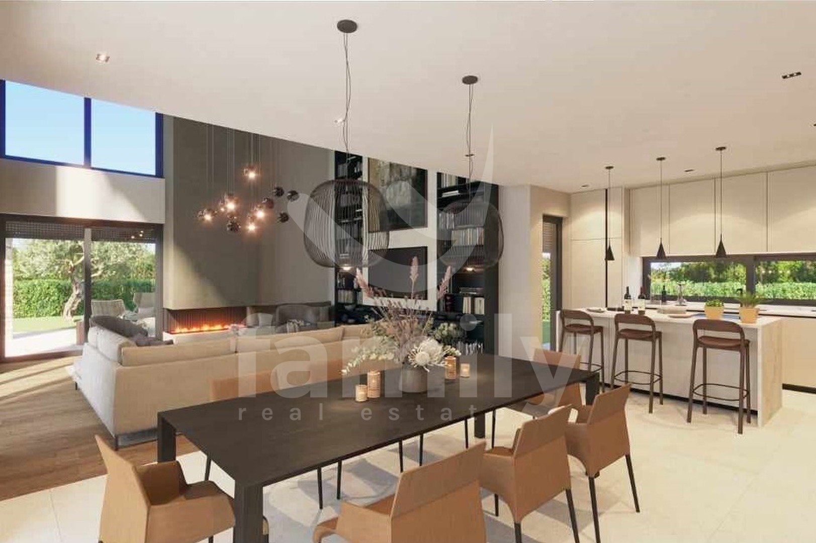 Al piano terra si trova una zona giorno open space che unisce un soggiorno con camino bifacciale, una sala da pranzo e una cucina con accesso a una terrazza coperta, una camera da letto con bagno privato e accesso a una terrazza coperta, un bagno per gli ospiti e un locale tecnico. Una scala interna conduce al primo piano, dove si trovano tre camere da letto con bagno privato e due terrazze coperte. Il riscaldamento e il raffrescamento sono garantiti da un impianto di riscaldamento a pavimento e da condizionatori Mitsubishi. Nella costruzione di questa splendida villa sono stati utilizzati materiali ed elettrodomestici di alta qualità. Il giardino è curato, decorato con piante ornamentali e recintato. Il parcheggio è privato e anch'esso recintato. La videosorveglianza è ad alta risoluzione ed è installato un sistema di allarme. Completa armonia è garantita da una cucina estiva coperta con servizi igienici e ripostiglio, e da una piscina a sfioro di 60 m² con zona prendisole, accanto alla quale è elegantemente integrata una vasca idromassaggio con camino aperto.