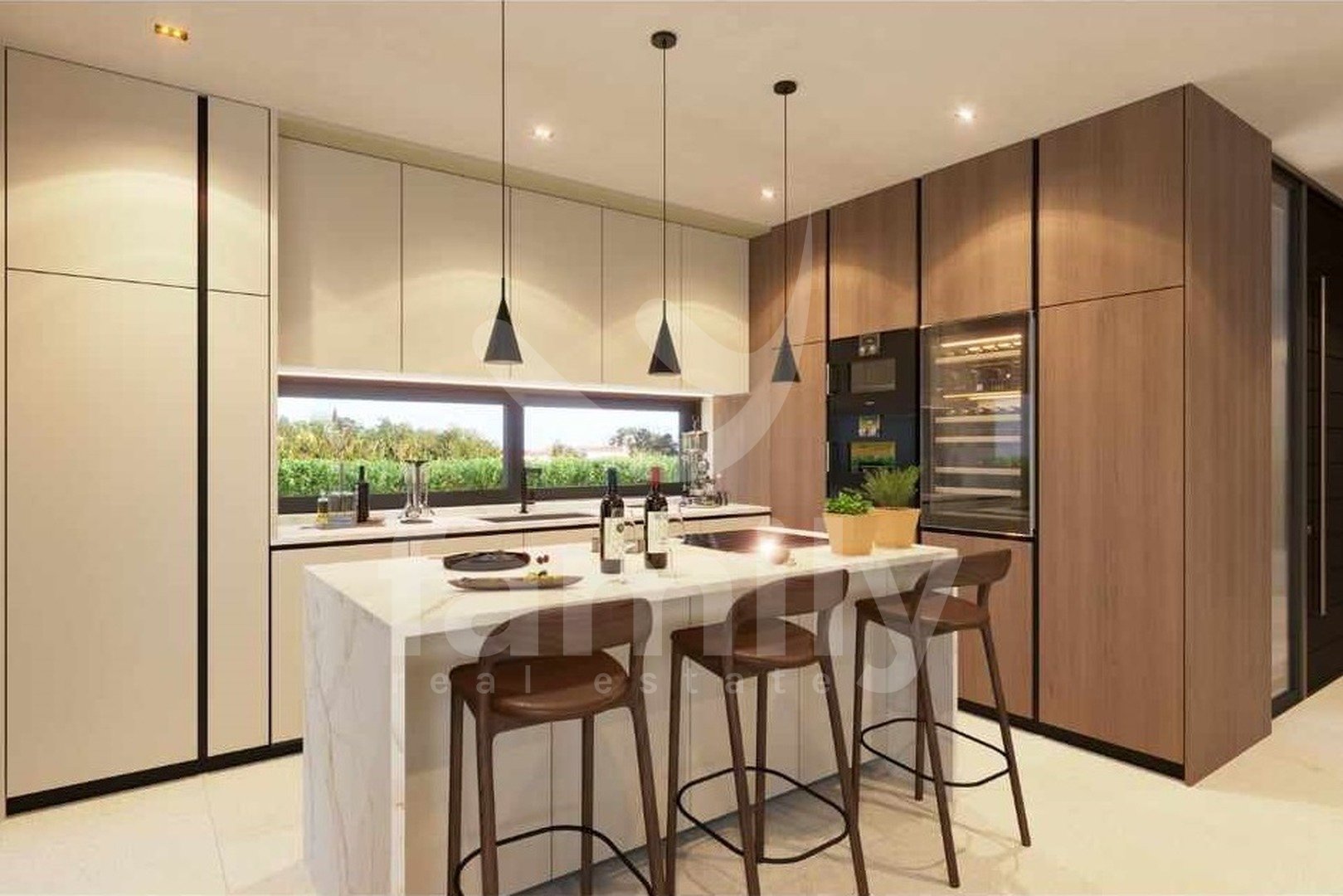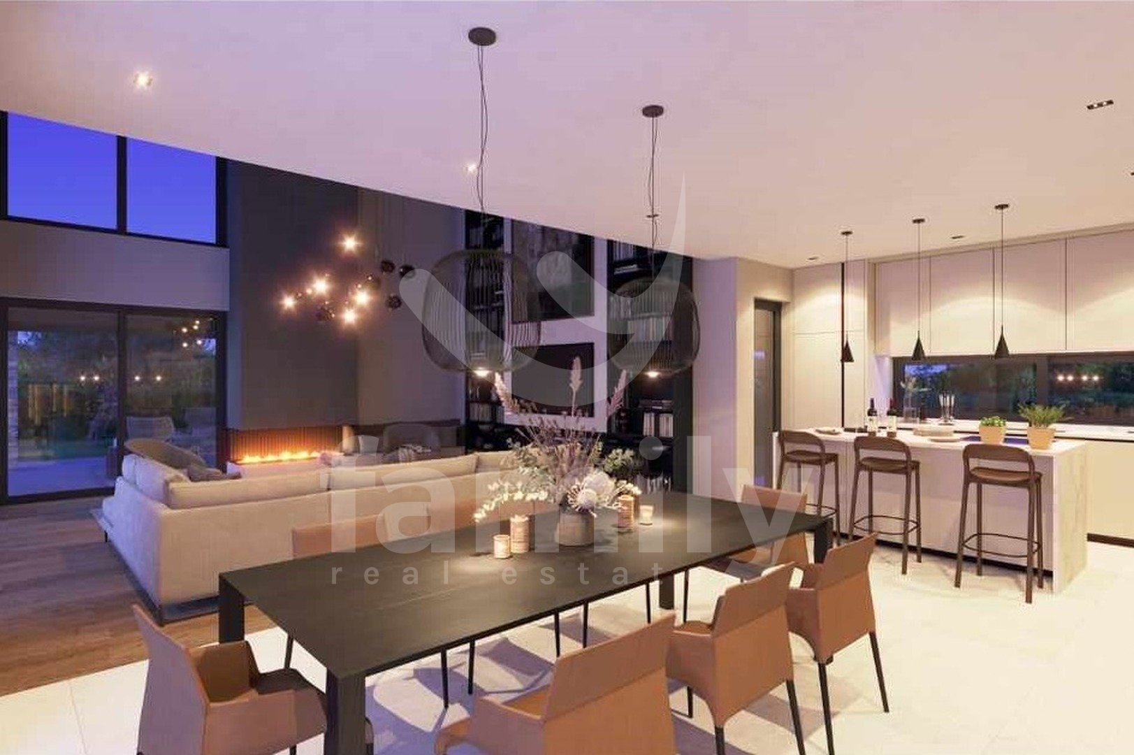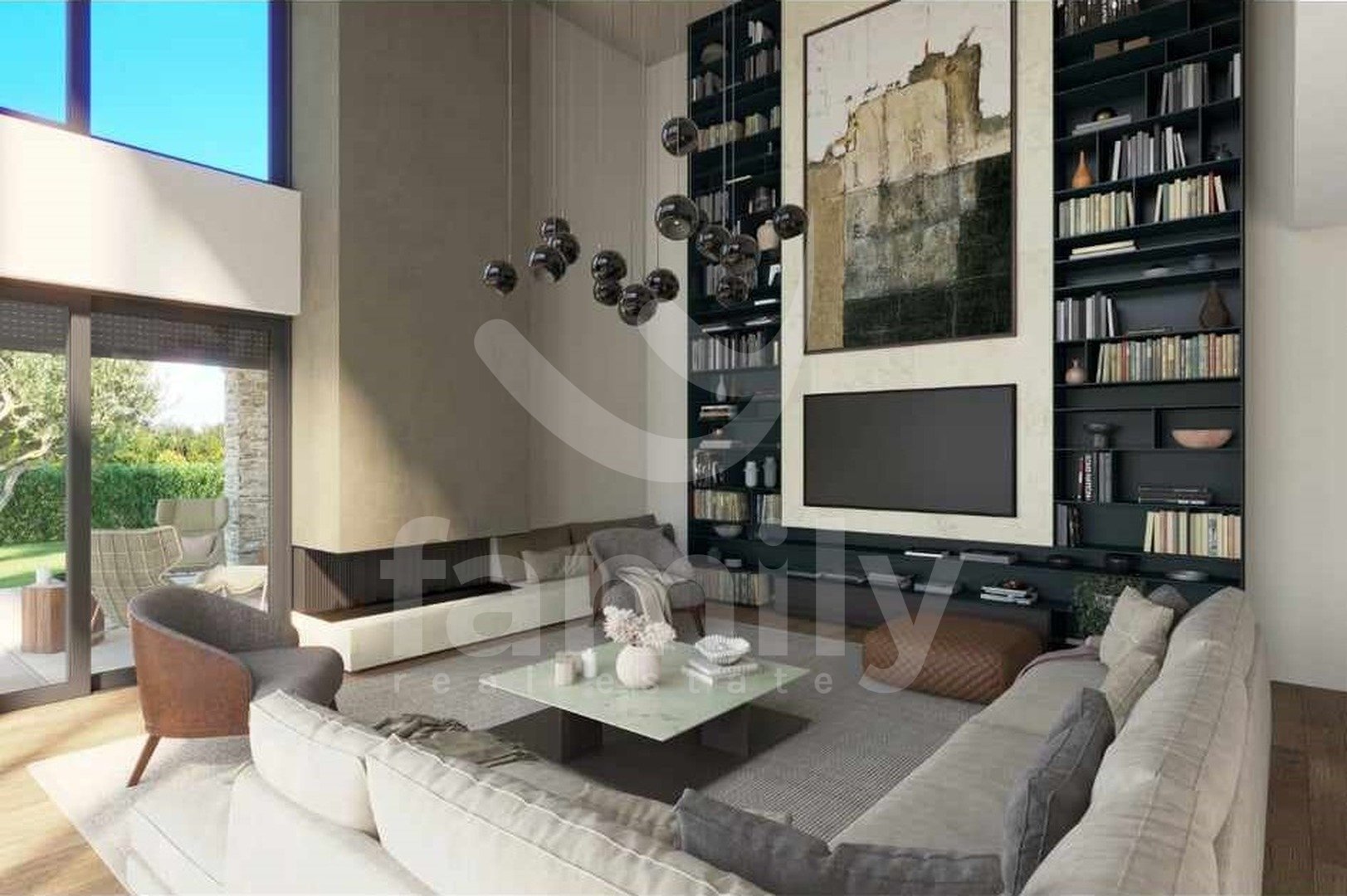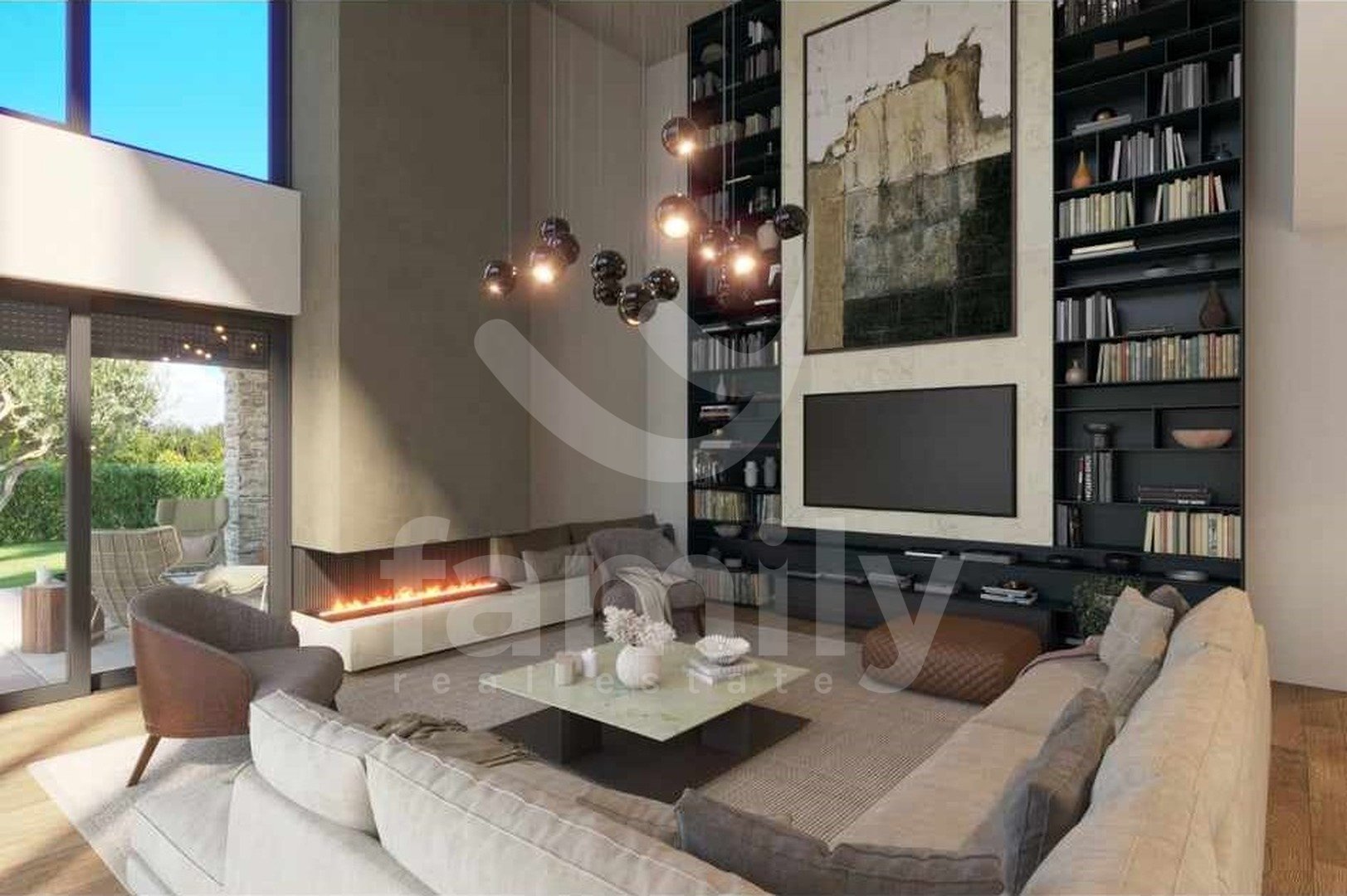 Al piano terra si trova una zona giorno open space che unisce un soggiorno con camino bifacciale, una sala da pranzo e una cucina con accesso a una terrazza coperta, una camera da letto con bagno privato e accesso a una terrazza coperta, un bagno per gli ospiti e un locale tecnico. Una scala interna conduce al primo piano, dove si trovano tre camere da letto con bagno privato e due terrazze coperte. Il riscaldamento e il raffrescamento sono garantiti da un impianto di riscaldamento a pavimento e da condizionatori Mitsubishi. Nella costruzione di questa splendida villa sono stati utilizzati materiali ed elettrodomestici di alta qualità. Il giardino è curato, decorato con piante ornamentali e recintato. Il parcheggio è privato e anch'esso recintato. La videosorveglianza è ad alta risoluzione ed è installato un sistema di allarme. Completa armonia è garantita da una cucina estiva coperta con servizi igienici e ripostiglio, e da una piscina a sfioro di 60 m² con zona prendisole, accanto alla quale è elegantemente integrata una vasca idromassaggio con camino aperto.