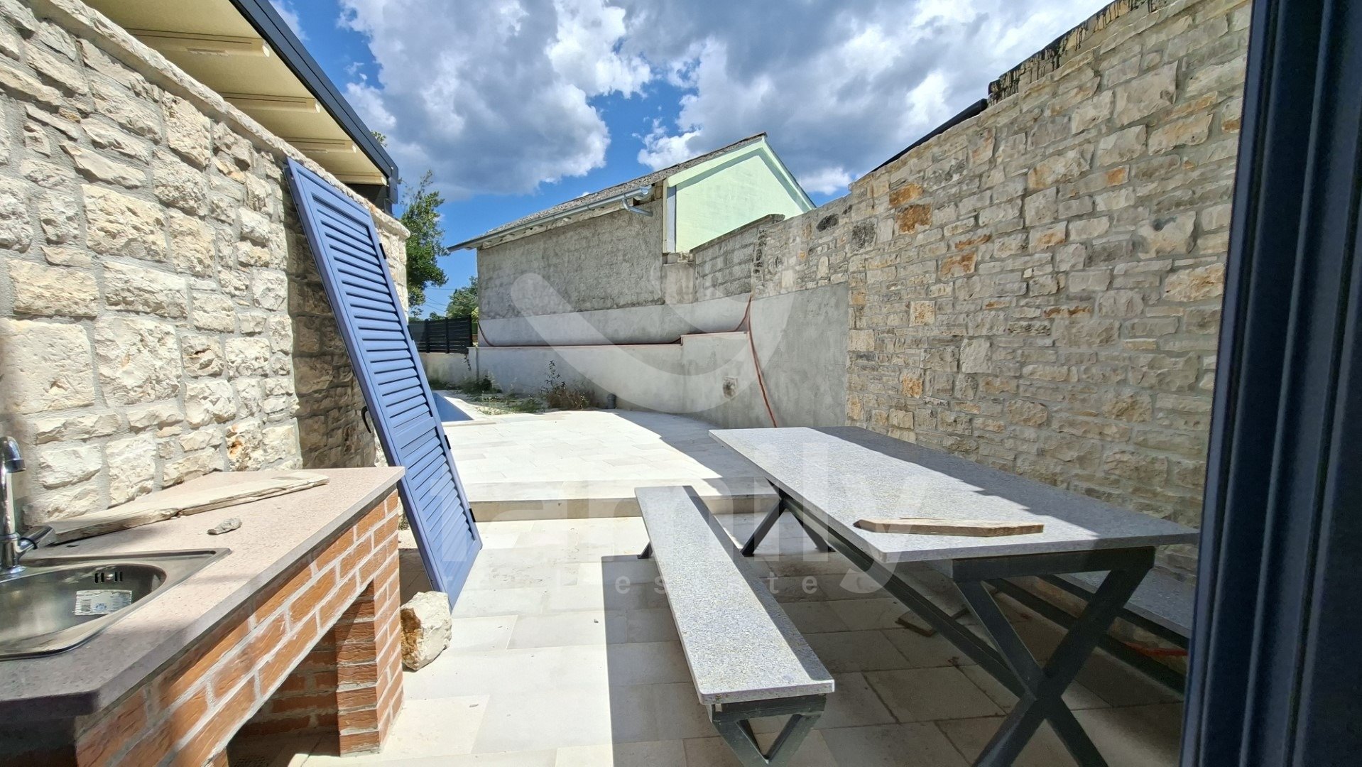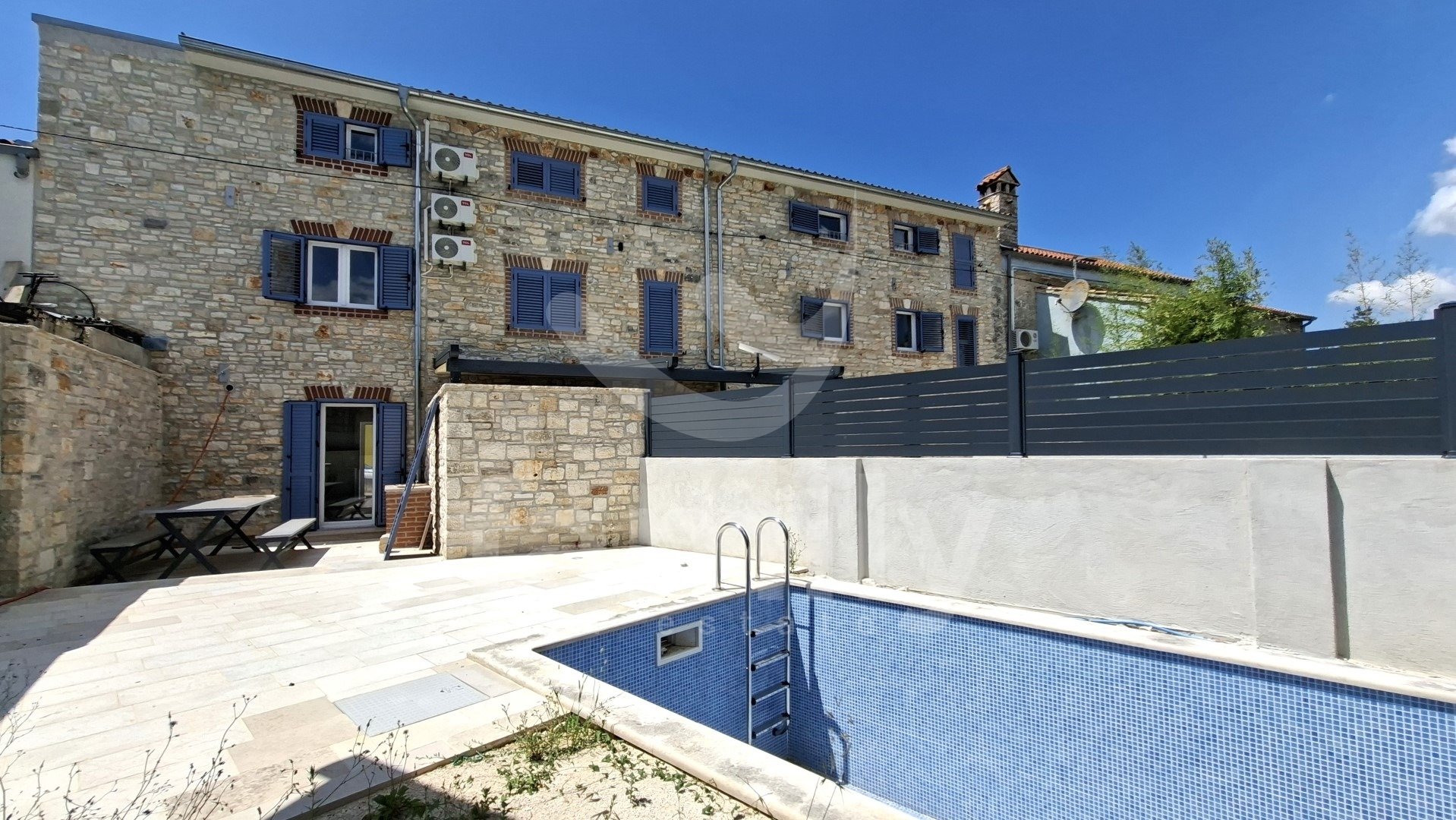 In questa splendida e pittoresca zona di un piccolo villaggio, si trova questa splendida casa in pietra di nuova costruzione, distribuita su tre piani, per una superficie totale di 100 m². Si compone di un piano terra e due piani superiori. Il piano terra della casa è composto da un bagno, un soggiorno con cucina open space con accesso a un'ampia terrazza con un comodo tavolo da pranzo, una piscina e una zona prendisole. I pavimenti sono rivestiti in laminato. Una scala in legno di pregio conduce al primo piano, che comprende tre camere da letto e un bagno. Dal primo piano, una scala in legno conduce anche al secondo piano, che comprende tre camere da letto e un bagno. L'intera proprietà è dotata di infissi in PVC e persiane in alluminio. Nelle camere da letto è installato un pavimento in laminato, mentre il resto della casa è rivestito in ceramica di qualità. Il terreno ospita un appartamento per due persone di 24 m² e una taverna di 9 m².
