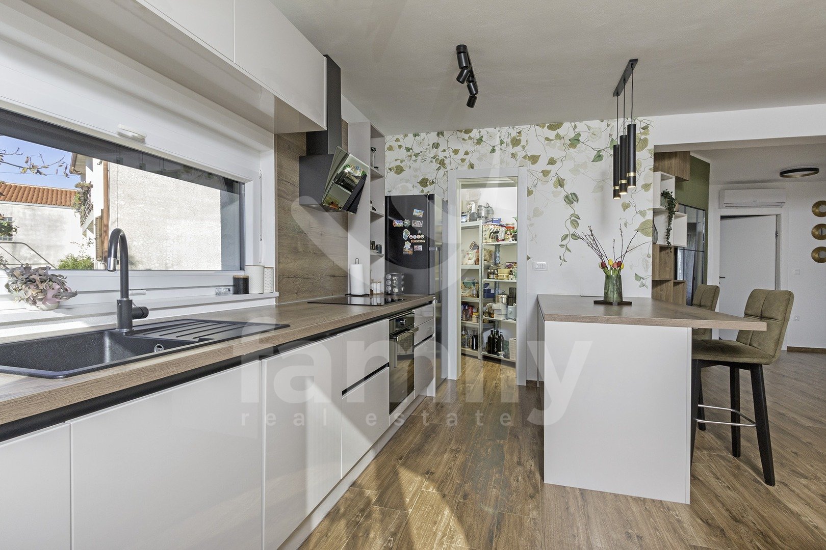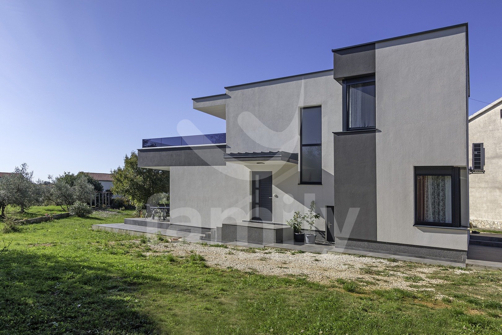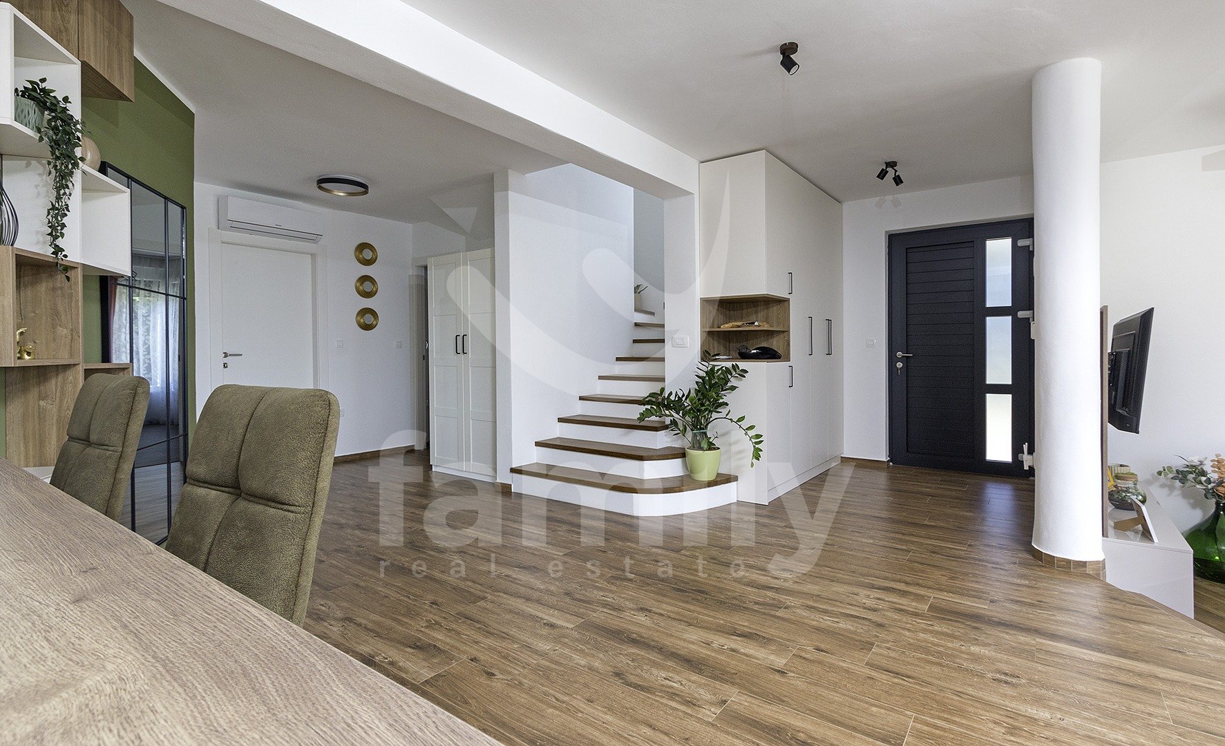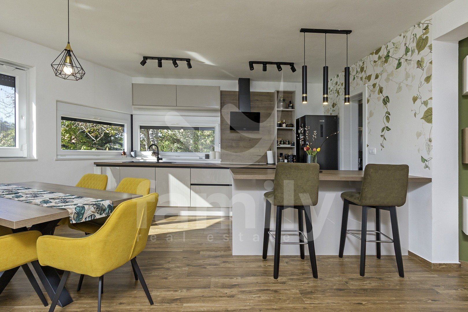 Non lontano da Marčana si trova questa casa indipendente di nuova costruzione, di alta qualità, su due piani, con garage e due ripostigli, situata su un terreno di 995 m². La superficie totale degli edifici è di 267 m², di cui 160 m² per la casa, ripostigli di circa 50 m² e 30 m² e un garage di 30 m². La casa si sviluppa su due piani, il piano terra di 90 m² e il primo piano di 70 m², ed è arredata in uno stile caldo e familiare. Il piano terra di questa proprietà di alta qualità è composto da un soggiorno open space con sala da pranzo e cucina DanKuchen, un ripostiglio, un bagno, una zona lavanderia e asciugatura, un locale caldaia e un'altra stanza che può essere utilizzata come studio o camera da letto, a seconda dei desideri del futuro proprietario. Al primo piano si trovano tre camere da letto con due bagni, ovvero una spaziosa camera da letto principale con bagno privato e cabina armadio, e due camerette con bagno in comune, e un'ampia terrazza di 20 m². La casa è dotata di finestre in PVC di alta qualità con doppi vetri, bianche all'interno e antracite all'esterno, con zanzariere e persiane, mentre il sistema di riscaldamento e raffrescamento è regolato da due condizionatori inverter e riscaldamento a pavimento installato in tutto l'edificio residenziale su una pompa di calore Fujitsu, e c'è la possibilità che, in caso di costruzione di una piscina, il suo riscaldamento possa essere collegato allo stesso sistema, mentre tutti i mobili sono realizzati su misura e di alta qualità, e gli elettrodomestici e l'elettronica sono accuratamente selezionati tra i rinomati marchi Bosch e Miele. L'immobile è dotato di un isolamento termico di 10 cm di spessore, che rappresenta un'ulteriore efficienza energetica. Il cortile è sufficientemente ampio per la costruzione di una futura piscina e al suo interno si trovano due ripostigli e un garage che necessitano di ristrutturazione e, data la loro superficie, possono essere convertiti in edifici residenziali.