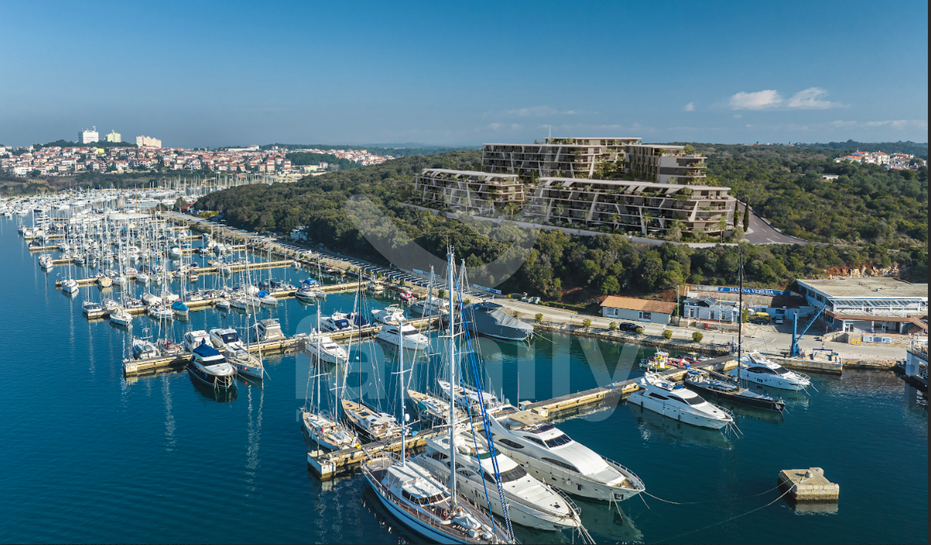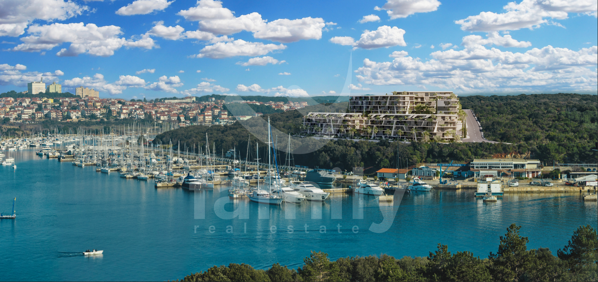 L'appartamento si trova al piano terra di un edificio moderno ed elegante dal punto di vista architettonico, nelle immediate vicinanze di Pola, in una zona tranquilla e verdeggiante del centro abitato. La superficie netta totale dell'appartamento B5 è di 51,59 m² e la disposizione è funzionale e sfruttata al massimo: