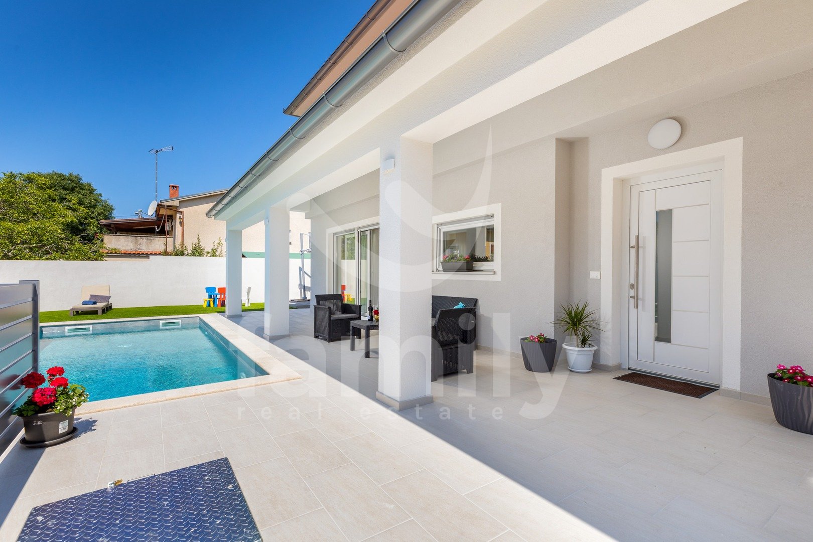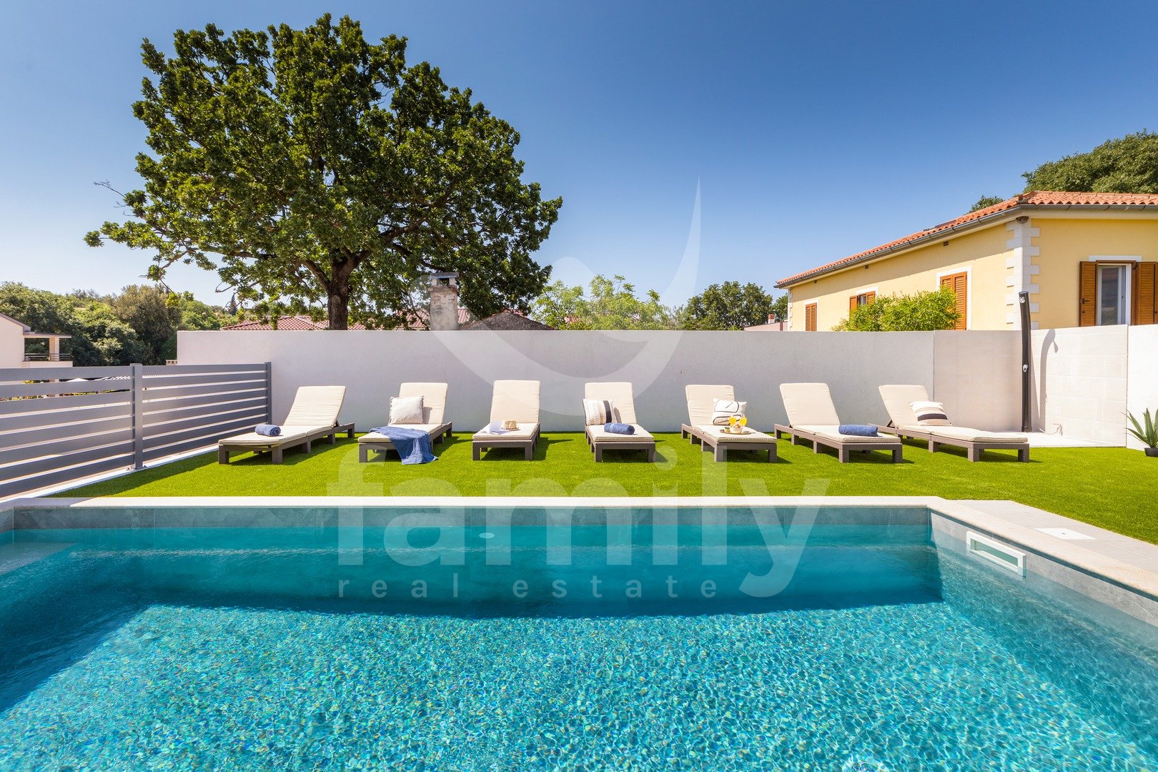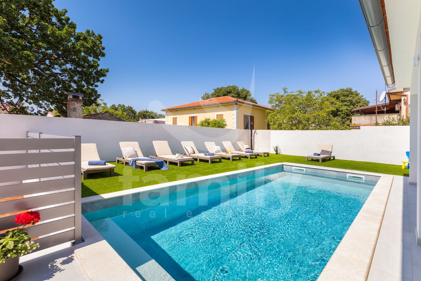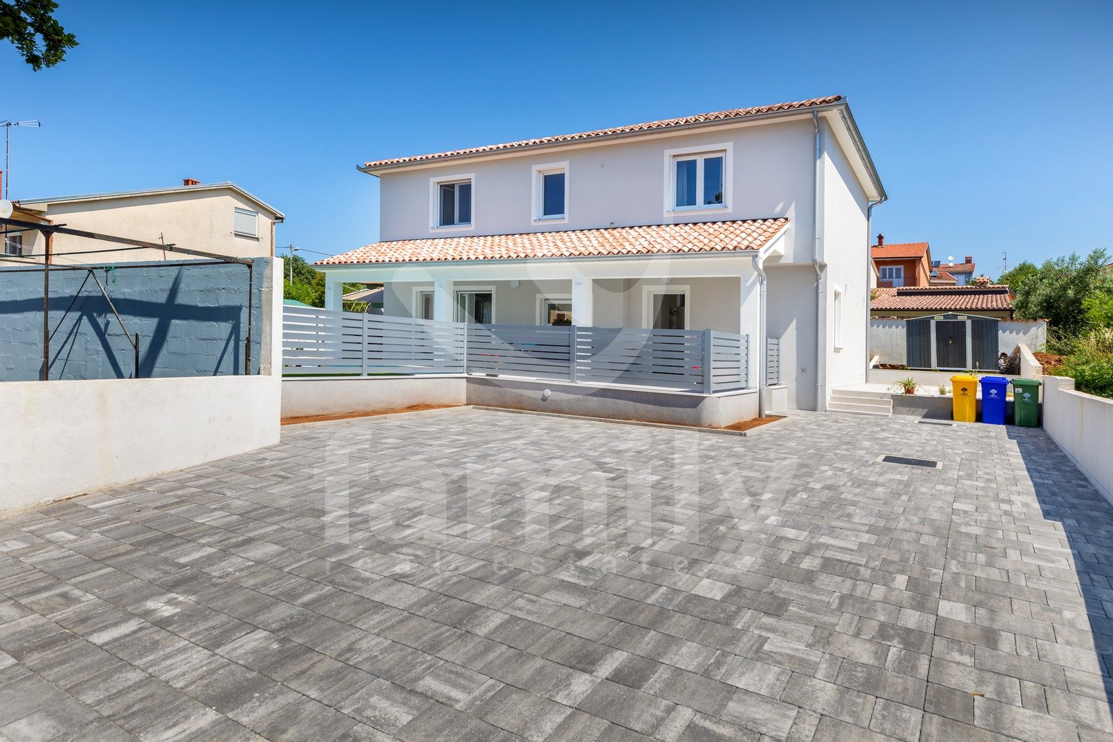 Il piano terra e il primo piano dispongono di fusibili separati per l'elettricità, così come la parte esterna della casa con piscina. Sono stati inoltre predisposti i dispositivi per l'installazione di un citofono, in caso di necessità. La villa è stata costruita di recente con materiali di alta qualità e ogni dettaglio è stato attentamente curato nella sua decorazione. Il cortile è dotato di una zona pranzo all'aperto e, al suo interno, si trovano anche un barbecue e una piscina di 21 m², una doccia esterna, una zona solarium e un numero sufficiente di posti auto.