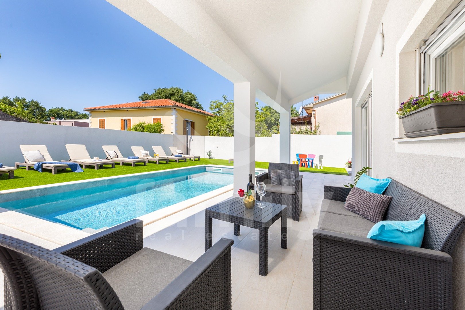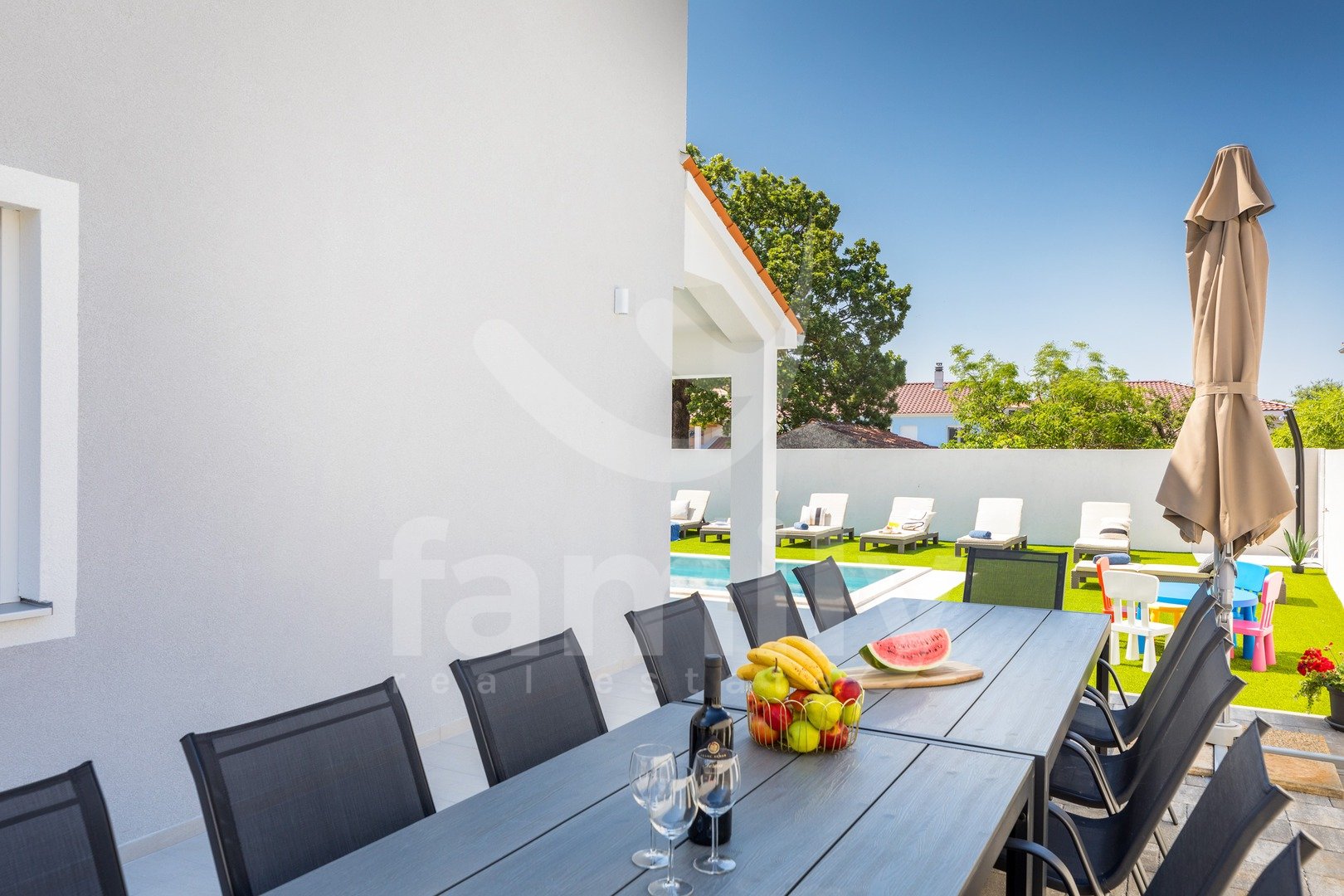 La villa sopra menzionata, considerando la sua superficie, la costruzione di alta qualità, il numero di camere da letto, l'area esterna con piscina, il design, la vicinanza al mare e a tutti i servizi correlati (come negozi, farmacie, scuole, asili, ecc.), rappresenta un immobile molto interessante, eccellente, lussuoso, di alta qualità e redditizio per il futuro proprietario, sia in termini di vita familiare per una famiglia numerosa, sia per l'avvio di attività di ristorazione e affitto e un rapido ritorno sull'investimento.