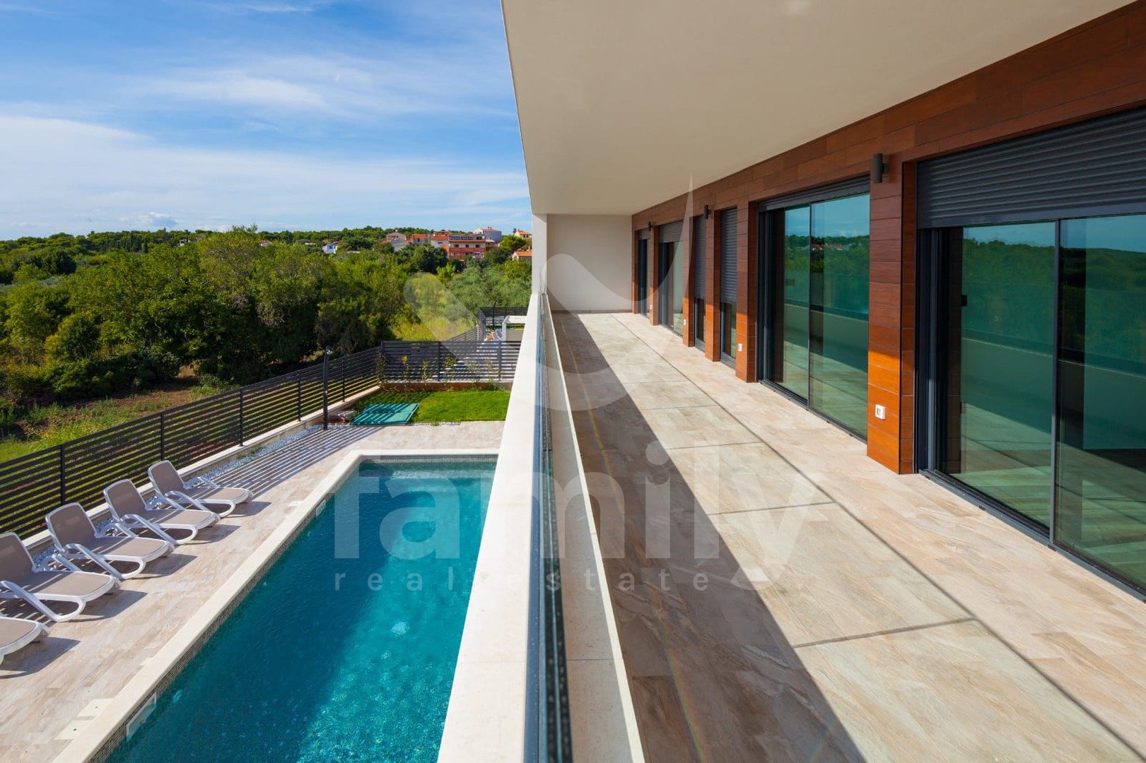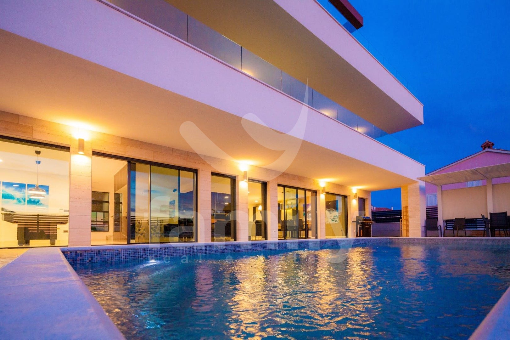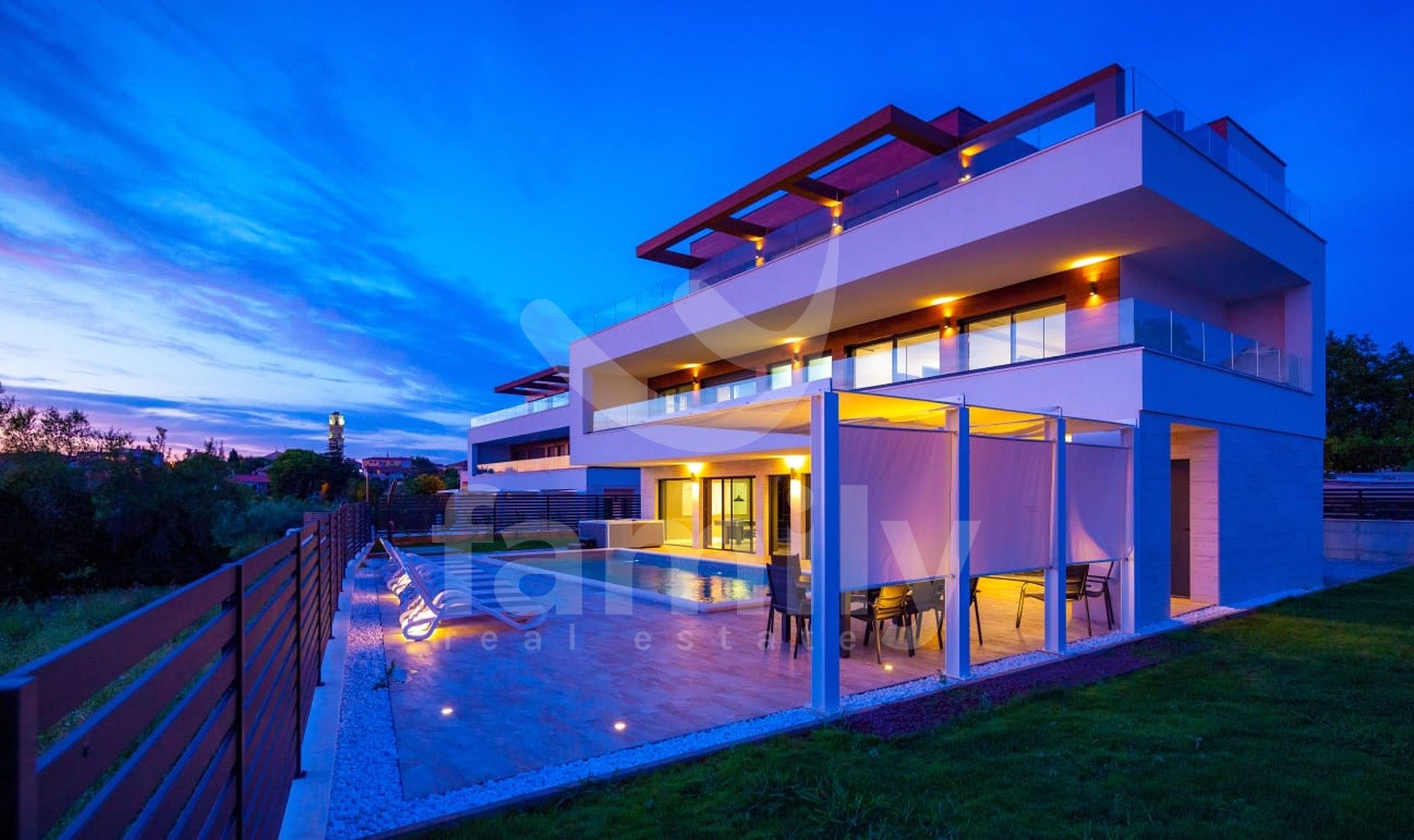 Ta luksuzna vila z bazenom se nahaja v vasi Premantura, le 400 m od morja s čudovitim panoramskim razgledom na morje. Vila se nahaja na parceli velikosti 633 m2 in se razprostira na treh nadstropjih s skupno 480 m2 bruto bivalne površine.