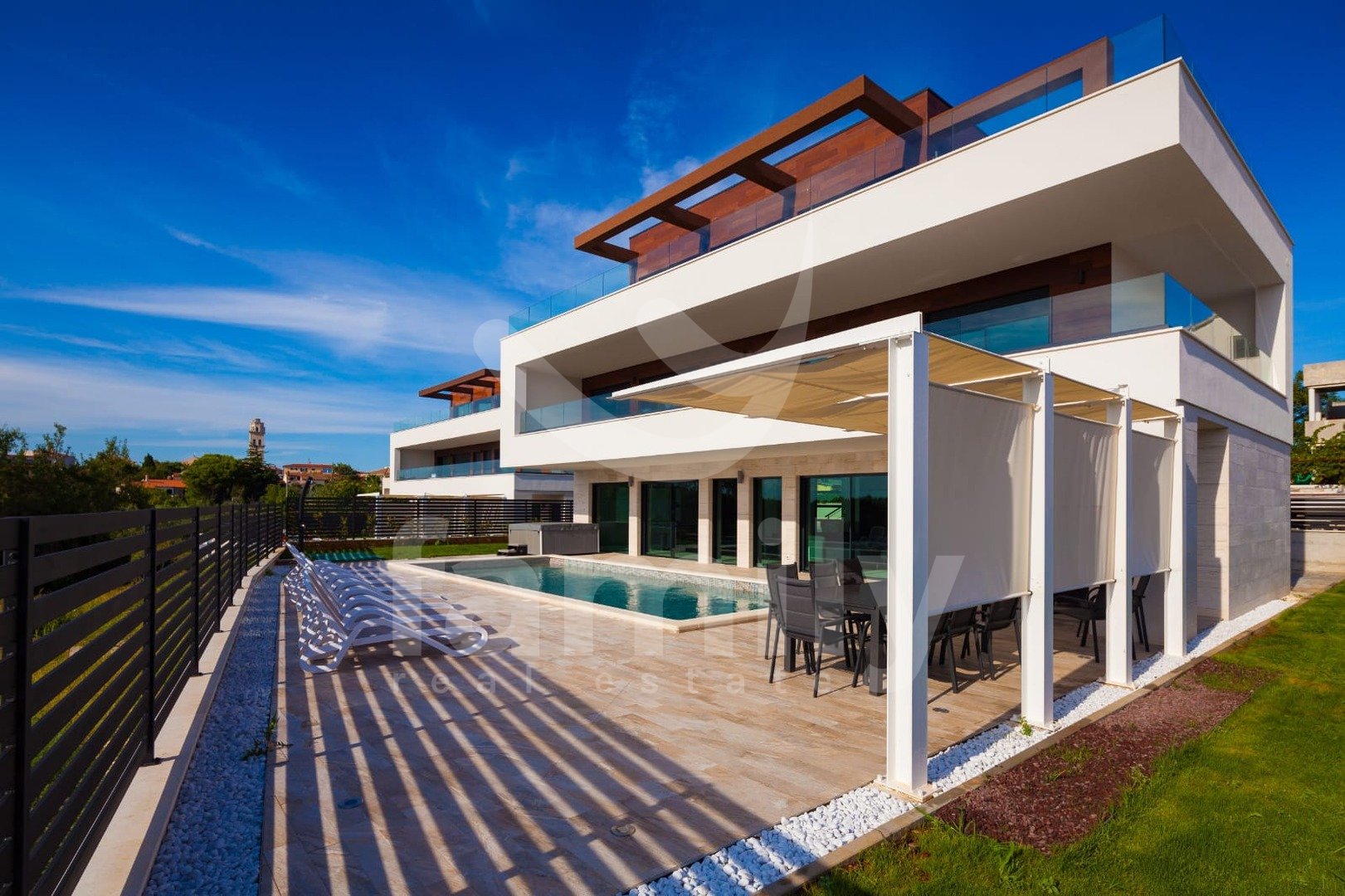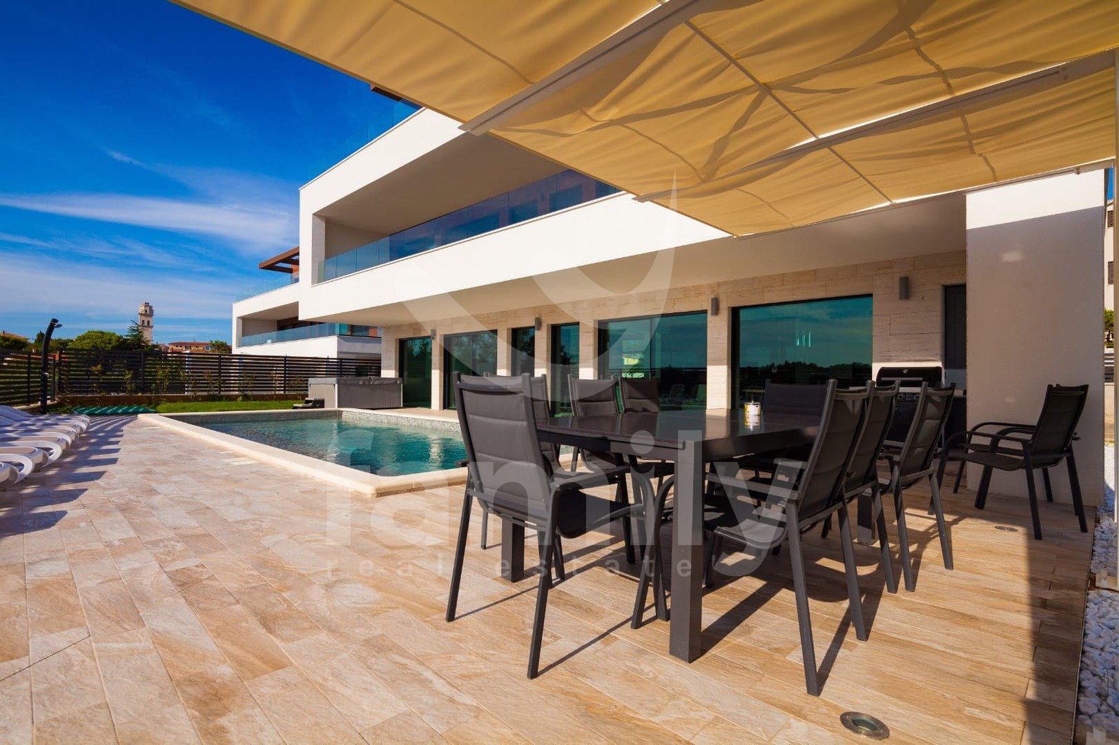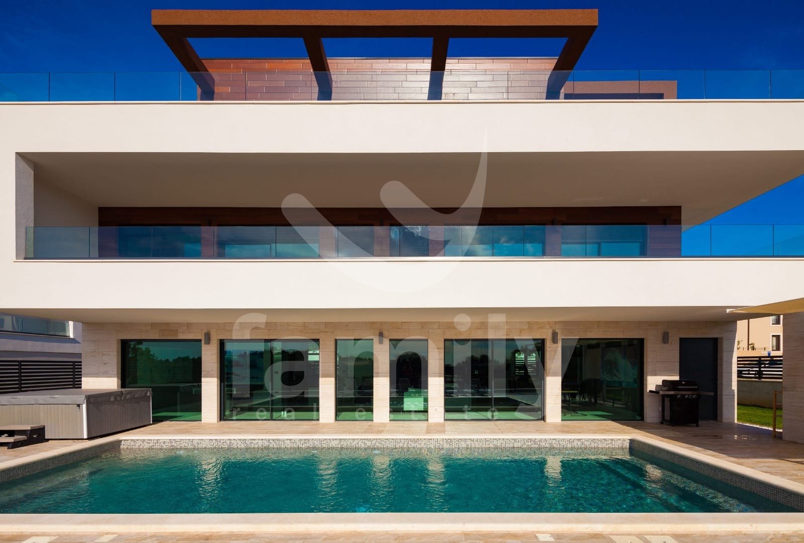 Ta luksuzna vila z bazenom se nahaja v vasi Premantura, le 400 m od morja s čudovitim panoramskim razgledom na morje. Vila se nahaja na parceli velikosti 633 m2 in se razprostira na treh nadstropjih s skupno 480 m2 bruto bivalne površine.