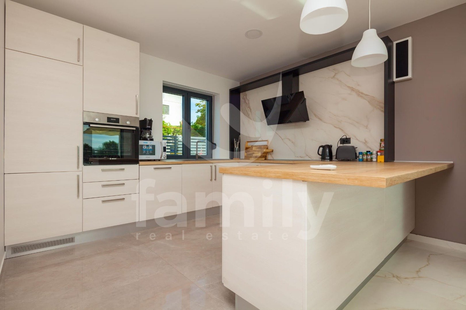 Ta moderna vila je opremljena z visokokakovostnim pohištvom po meri, visokokakovostno sanitarno opremo, barvnim ALU stavbnim pohištvom. Toplotna izolacija stavbe se nahaja na fasadi in ravni strehi. Za hlajenje se uporablja 9 klimatskih naprav, po ena v vsaki spalnici in dnevni sobi. Sodobna LED razsvetljava daje posebno vzdušje sobam v tej čudoviti vili. Na dvorišču so 3 parkirna mesta.