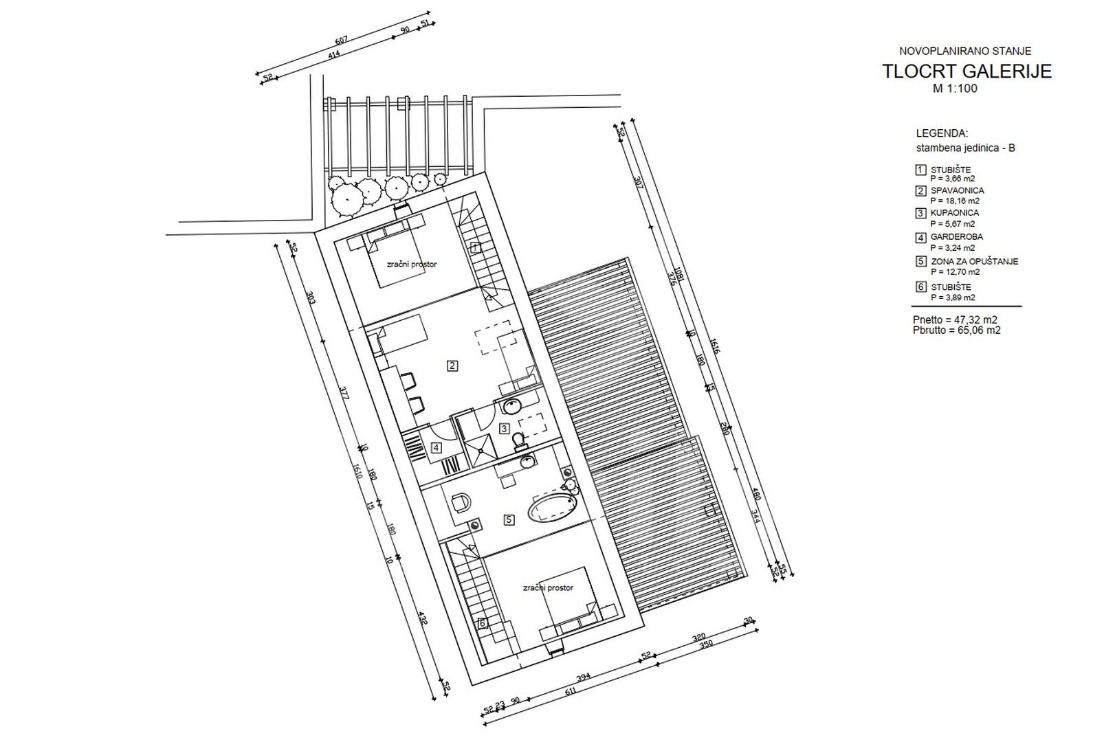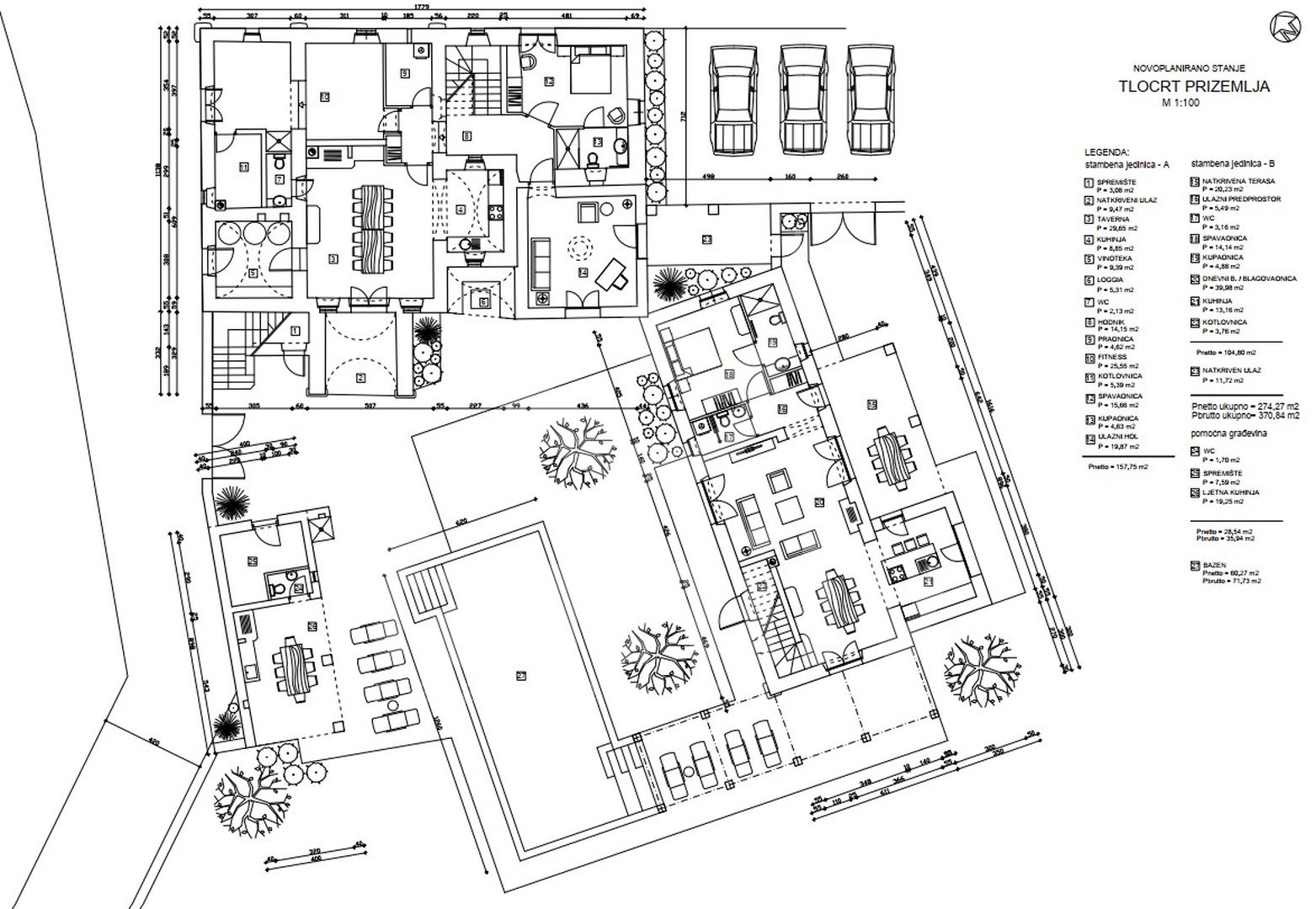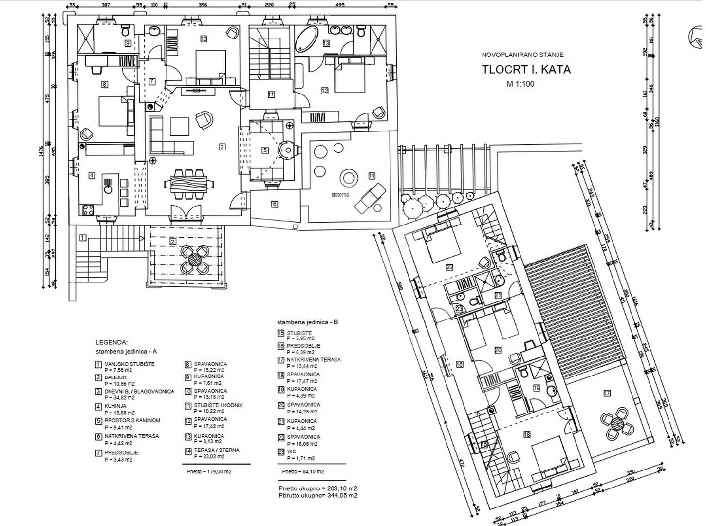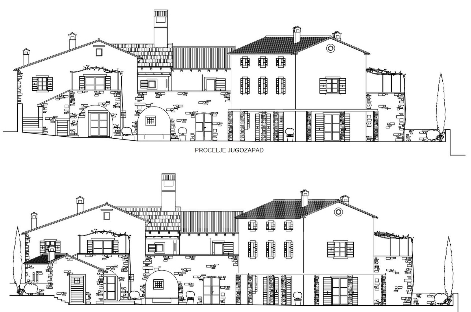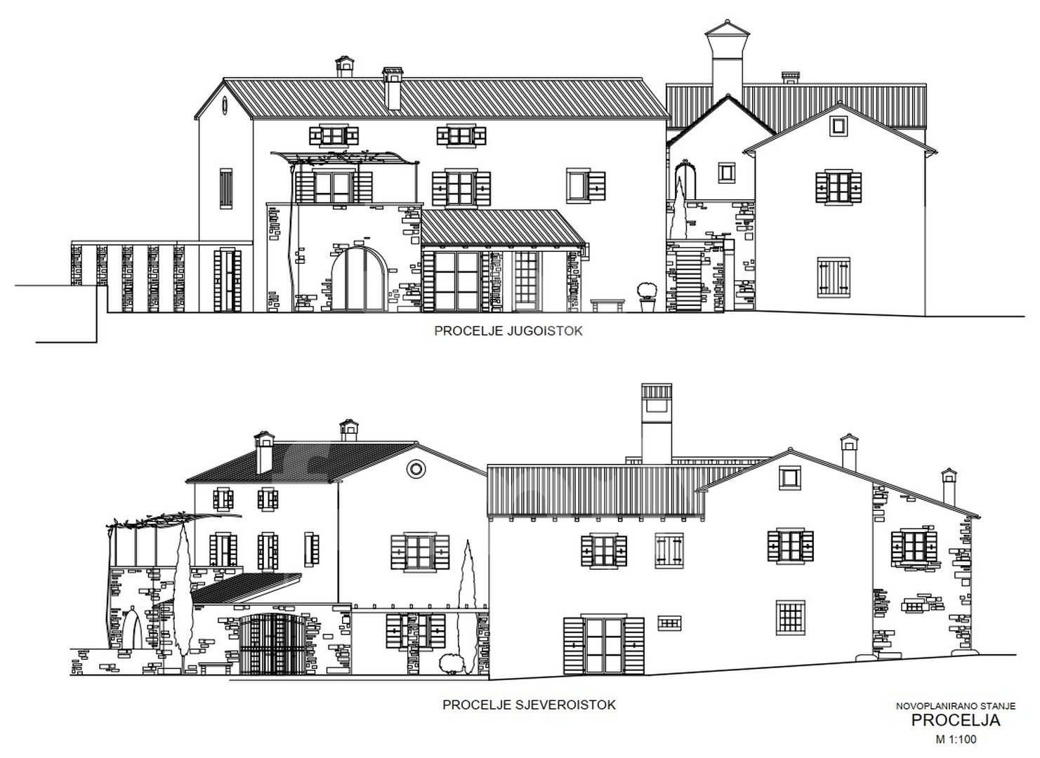 Po predlaganem projektu pritličje stavbe vključuje pokrit vhod, dve kuhinji, konobo, shrambo, vinsko klet, dva stranišča, dve kopalnici, pralnico, fitnes sobo, kurilnico, dnevno sobo z jedilnico, dve spalnici s pomožnim objektom, ki bi bil letna kuhinja s shrambo in straniščem. Prvo nadstropje bi obsegalo balidur, dnevno sobo z jedilnico, kuhinjo, prostor s kaminom, pokrito teraso, teraso s cisterno, šest spalnic, eno stranišče, štiri kopalnice. V mansardi nepremičnine bi bila galerija, ki bi jo sestavljali stopnišče, spalnica, kopalnica, garderoba, prostor za sprostitev.