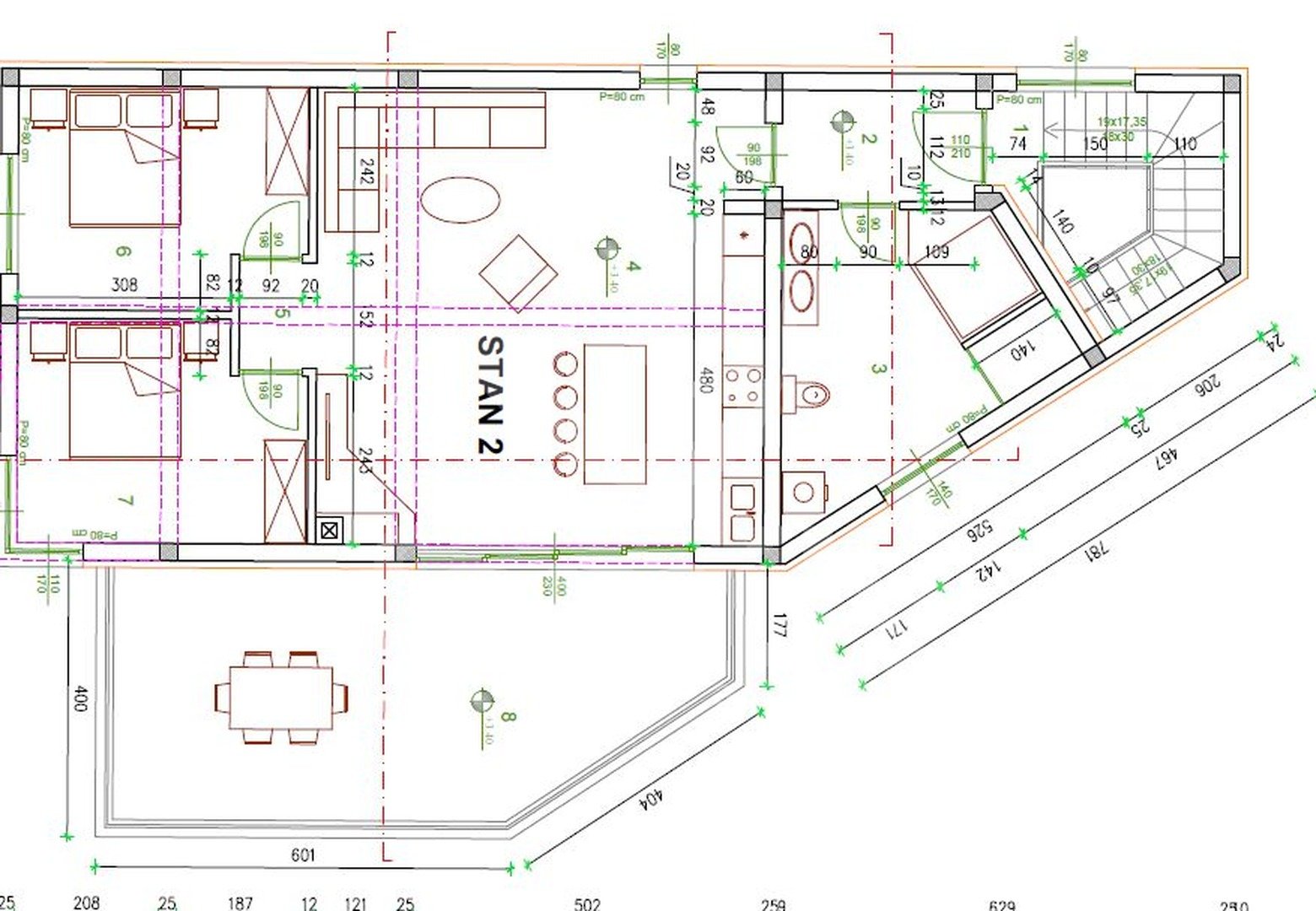 Stanovanje 2 v prvem nadstropju - 118,33 m2, obsega naslednje: Predsoba 1,72 m2, dnevna soba s kuhinjo in jedilnico 42,72 m2, Soba 1: 12,65 m2, Soba 2: 12,65 m2, Kopalnica 13,75 m2, odprta terasa 29 m2. Vhodna površina je 7,15 m2, površina stopnišča pa 11,45 m2.