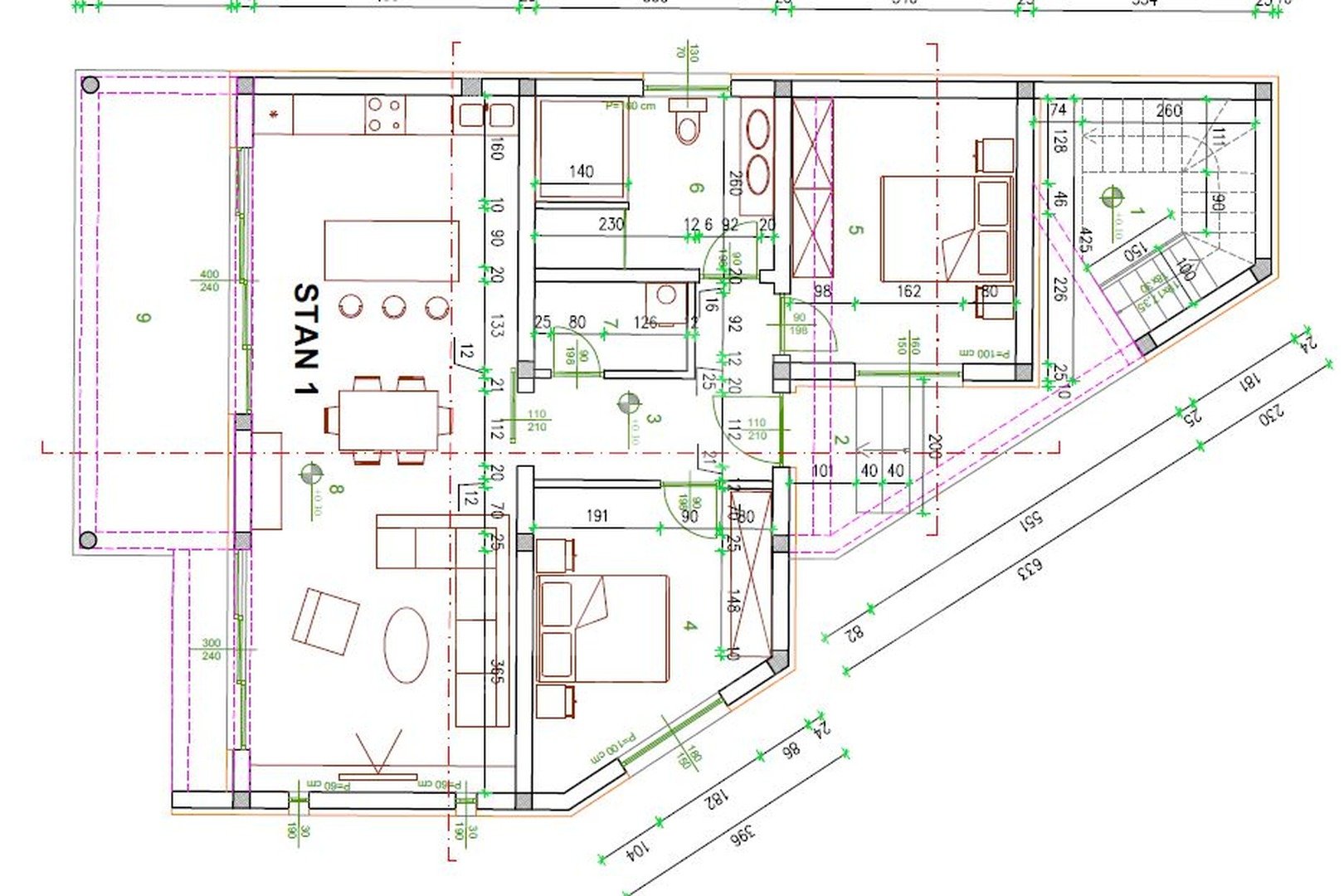 Stanovanje 1 v pritličju - 125,39 m2, obsega naslednje: Predsoba 7,20 m2, dnevna soba s kuhinjo in jedilnico 40,20 m2, Soba 1: 13,35 m2, Soba: 13,60 m2, Kopalnica 9,35 m2, Shramba 3,09 m2 in Pokrita terasa 20 m2