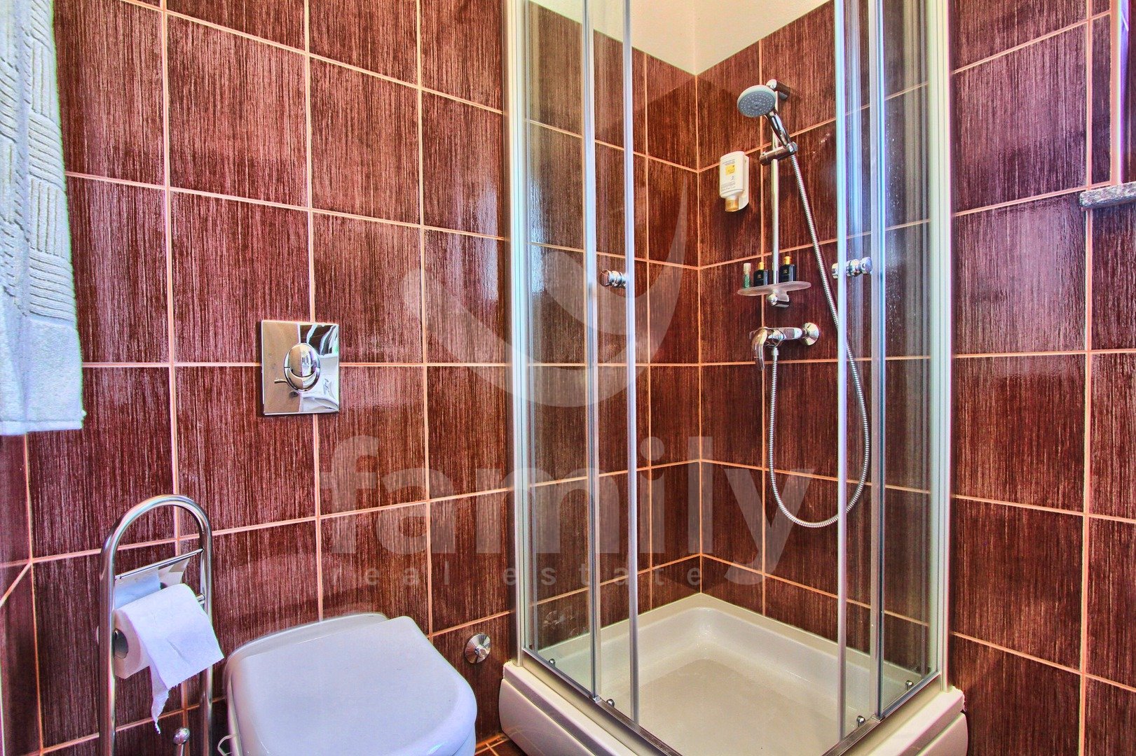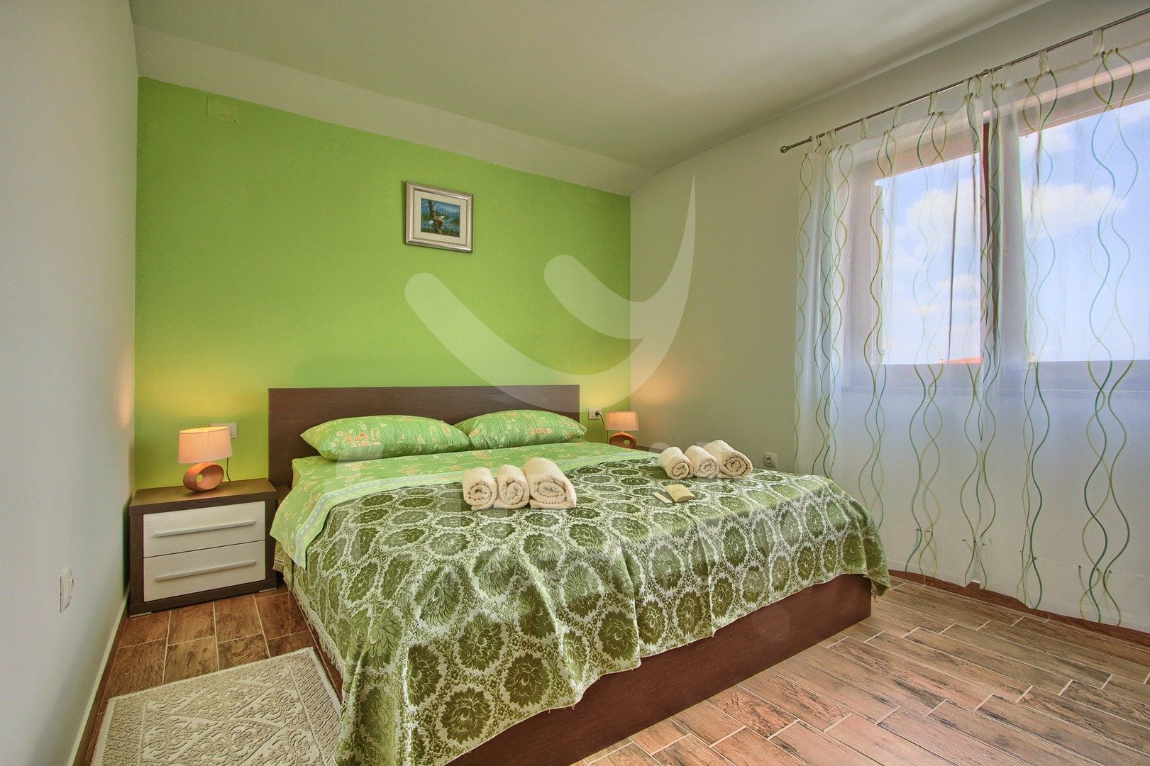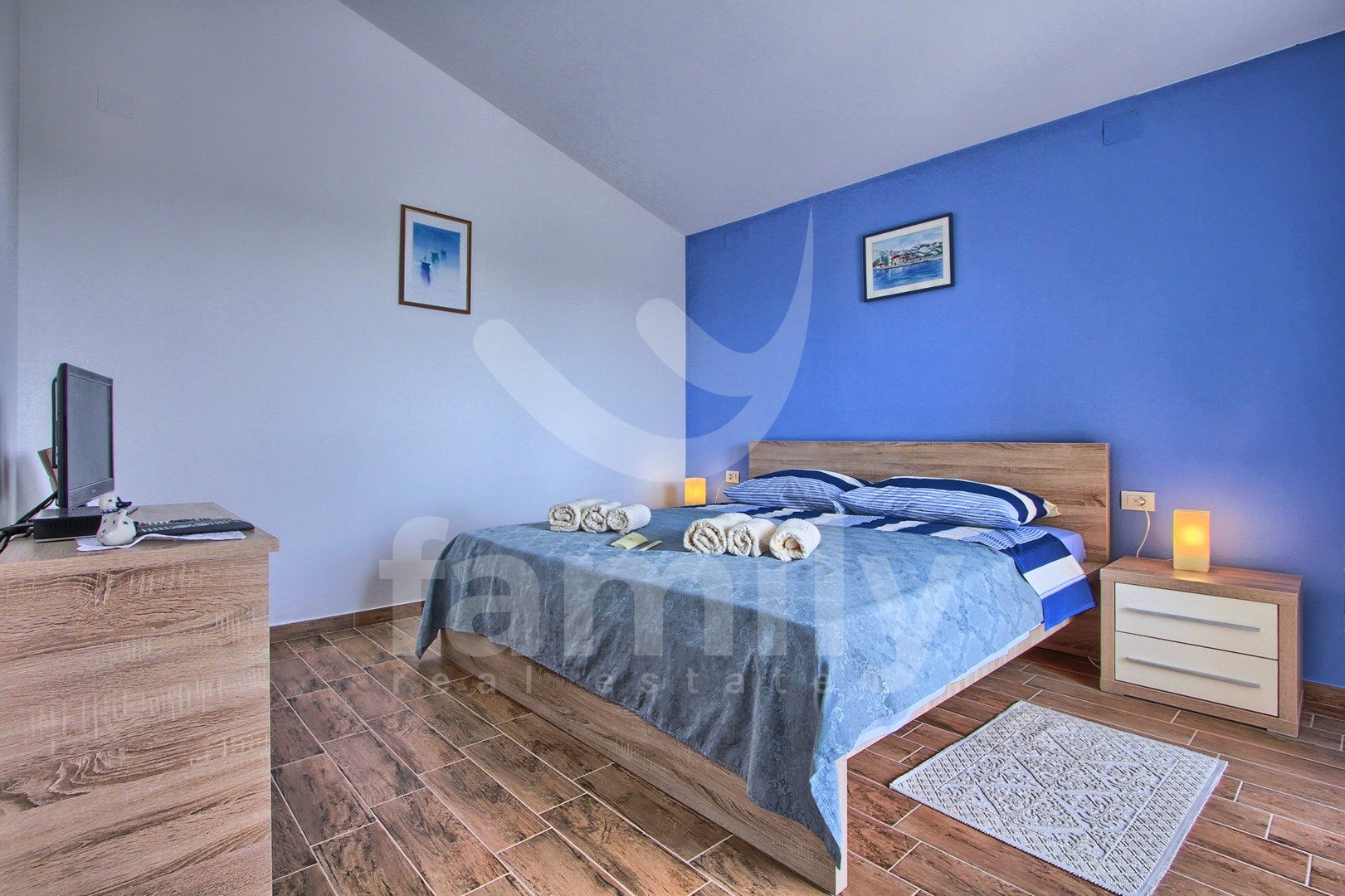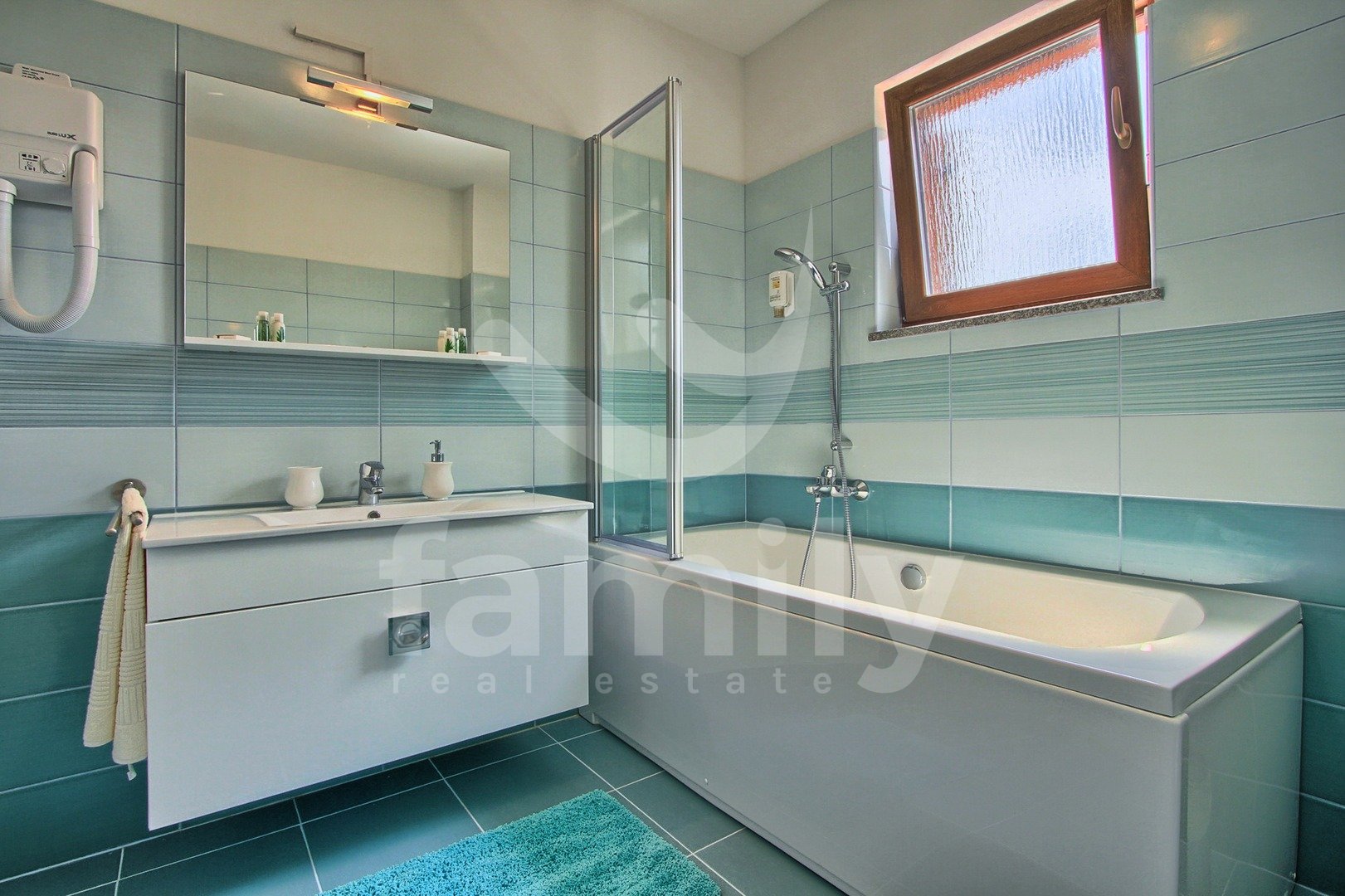 Prvo nadstropje: Tri spalnice, vsaka s svojo predsobo in kopalnico. Dve spalnici (približno 22 m² in 26 m²) sta opremljeni s klimatsko napravo, SAT/TV in imata moderno kopalnico s tušem, straniščem, bidejem in umivalnikom. Tretja spalnica v velikosti približno 25 m² ima kopalnico s kadjo, straniščem, bidejem in umivalnikom, ta soba pa se odpira na 7 m² velik balkon s pogledom na bazen in morje v daljavi.