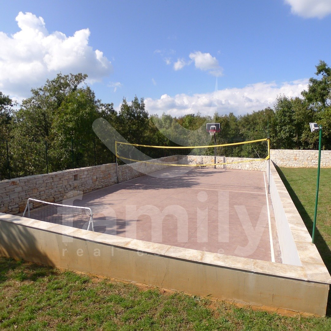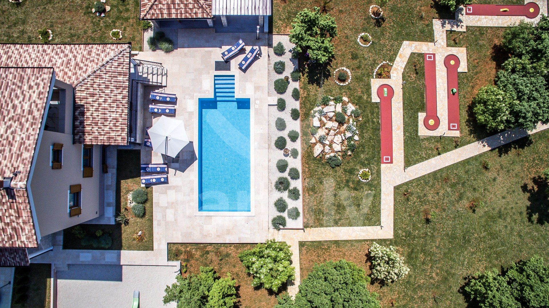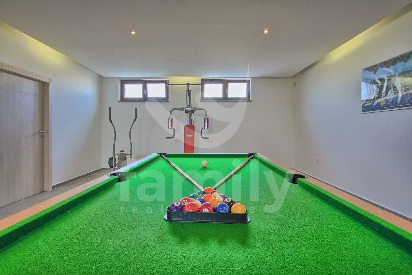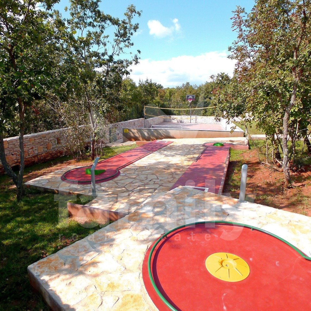 Zunanji prostor: Vila ponuja prostorno dvorišče s številnimi ugodnostmi. Na voljo je ogrevan bazen velikosti 36 m², terasa okoli bazena velikosti 100 m², pokrit žar s sedežno površino približno 20 m², pokrito parkirišče za dva avtomobila in dodatno nepokrito parkirišče za še dve vozili. Nepremičnina vključuje tudi večnamensko otroško igrišče z gugalnicami, toboganom in plezalnim okvirjem, 6-luknjično igrišče za mini golf, večnamensko športno igrišče (16x8 m) za mali nogomet, košarko in odbojko ter masažno kad (2,15 x 2,15 m) za 5+1 oseb. Del trate je opremljen z namakalnim sistemom, ob vili pa je majhen gozdiček, ki ponuja idealen prostor za sprostitev v toplejših dneh.