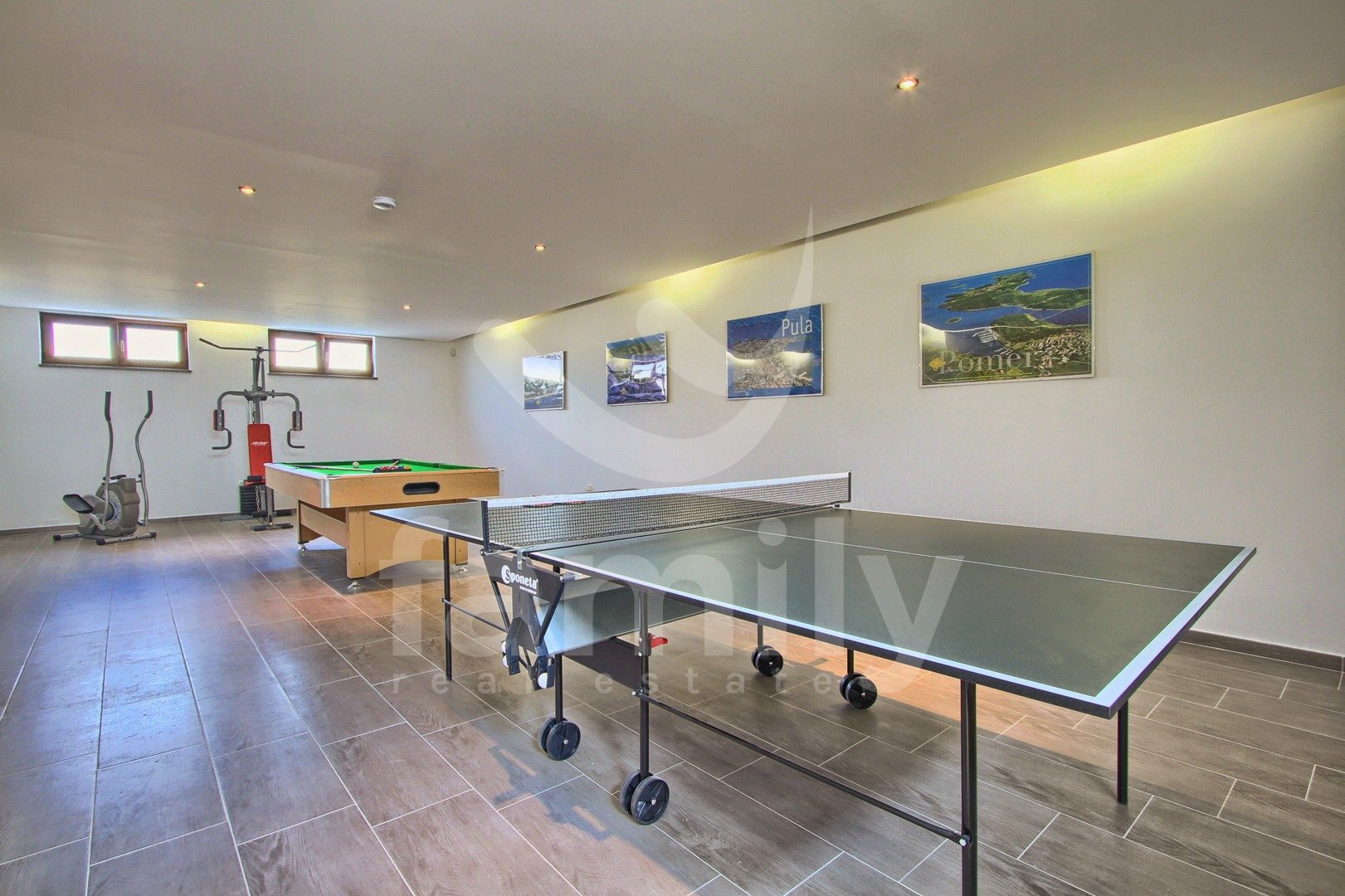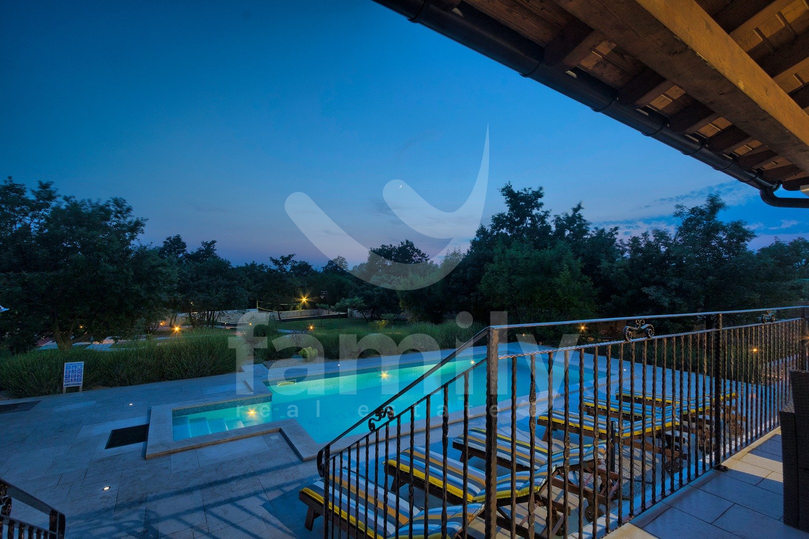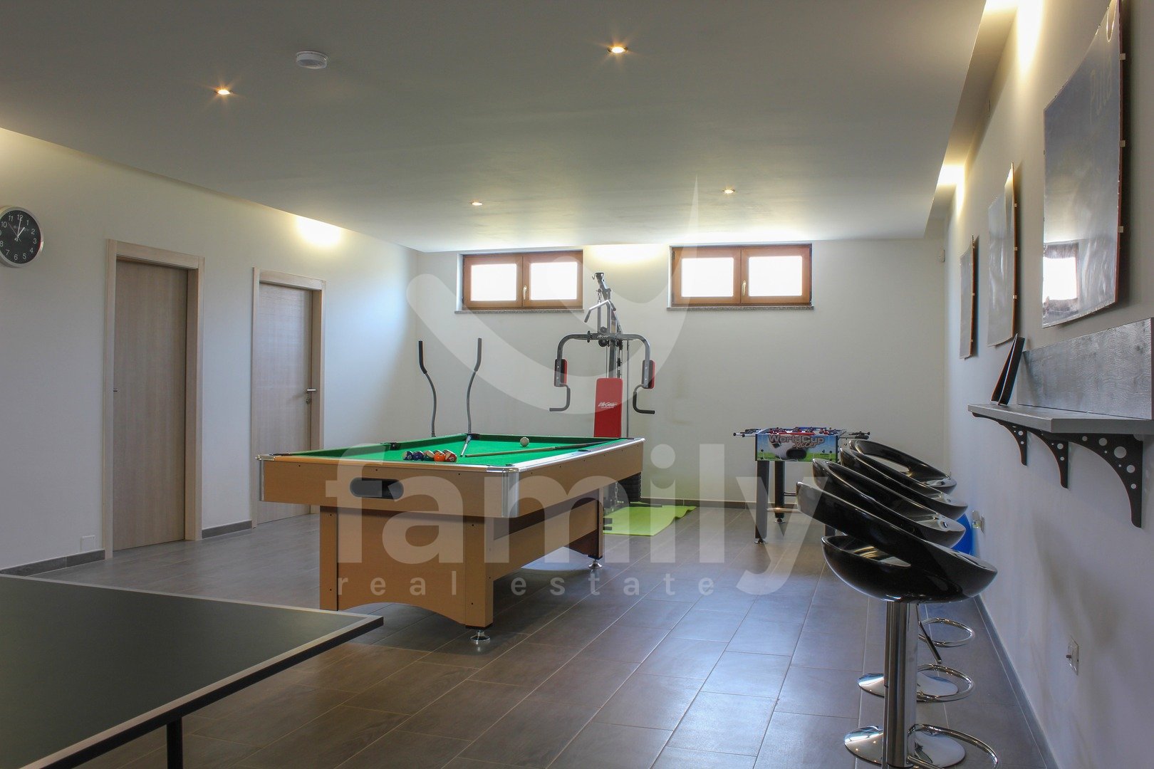 Zunanji prostor: Vila ponuja prostorno dvorišče s številnimi ugodnostmi. Na voljo je ogrevan bazen velikosti 36 m², terasa okoli bazena velikosti 100 m², pokrit žar s sedežno površino približno 20 m², pokrito parkirišče za dva avtomobila in dodatno nepokrito parkirišče za še dve vozili. Nepremičnina vključuje tudi večnamensko otroško igrišče z gugalnicami, toboganom in plezalnim okvirjem, 6-luknjično igrišče za mini golf, večnamensko športno igrišče (16x8 m) za mali nogomet, košarko in odbojko ter masažno kad (2,15 x 2,15 m) za 5+1 oseb. Del trate je opremljen z namakalnim sistemom, ob vili pa je majhen gozdiček, ki ponuja idealen prostor za sprostitev v toplejših dneh.