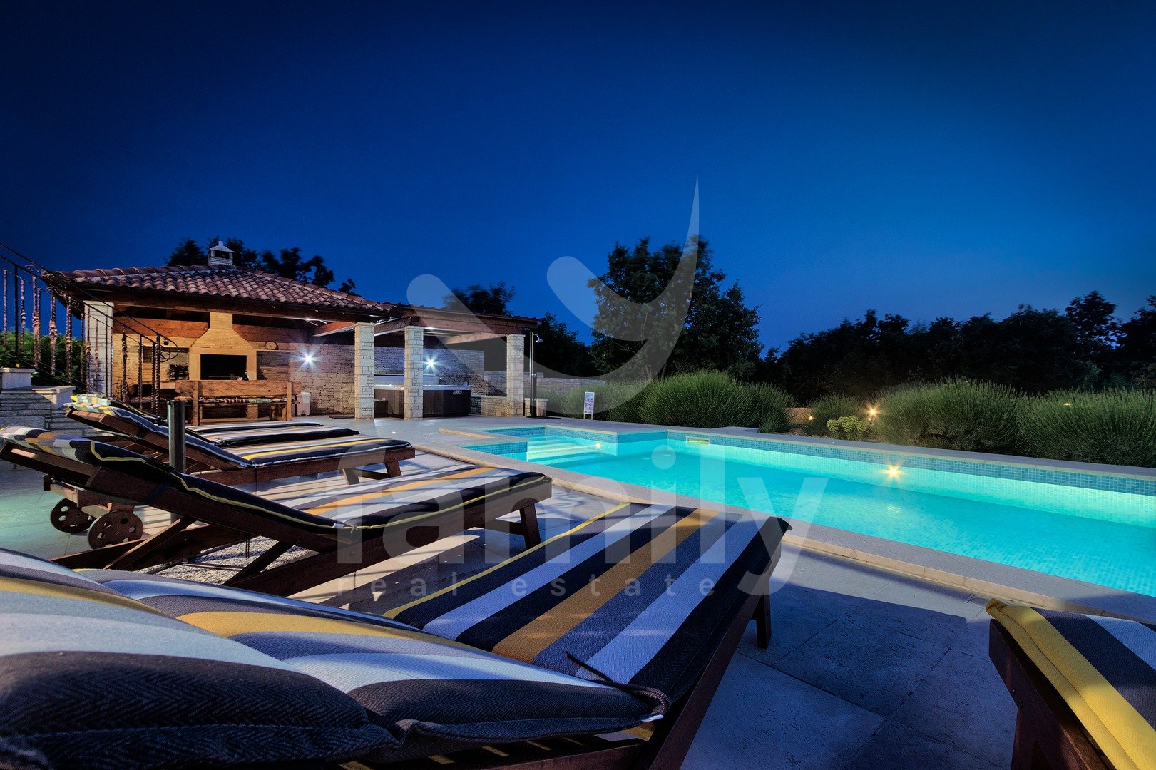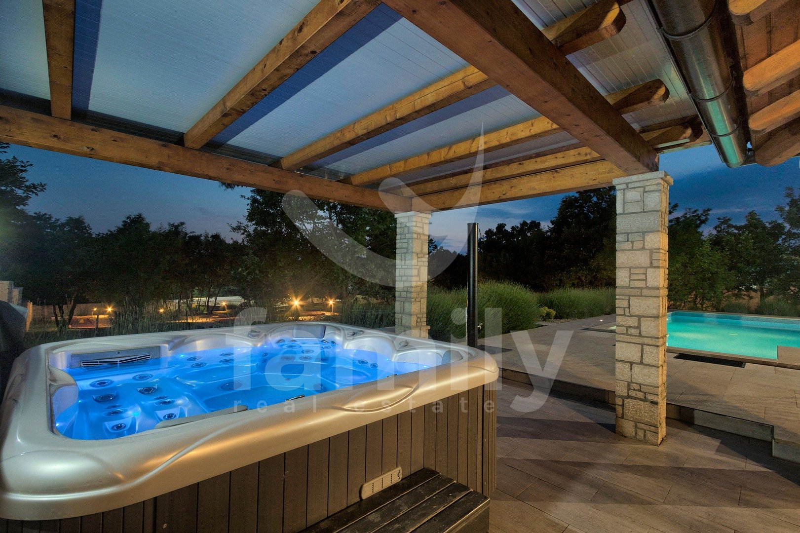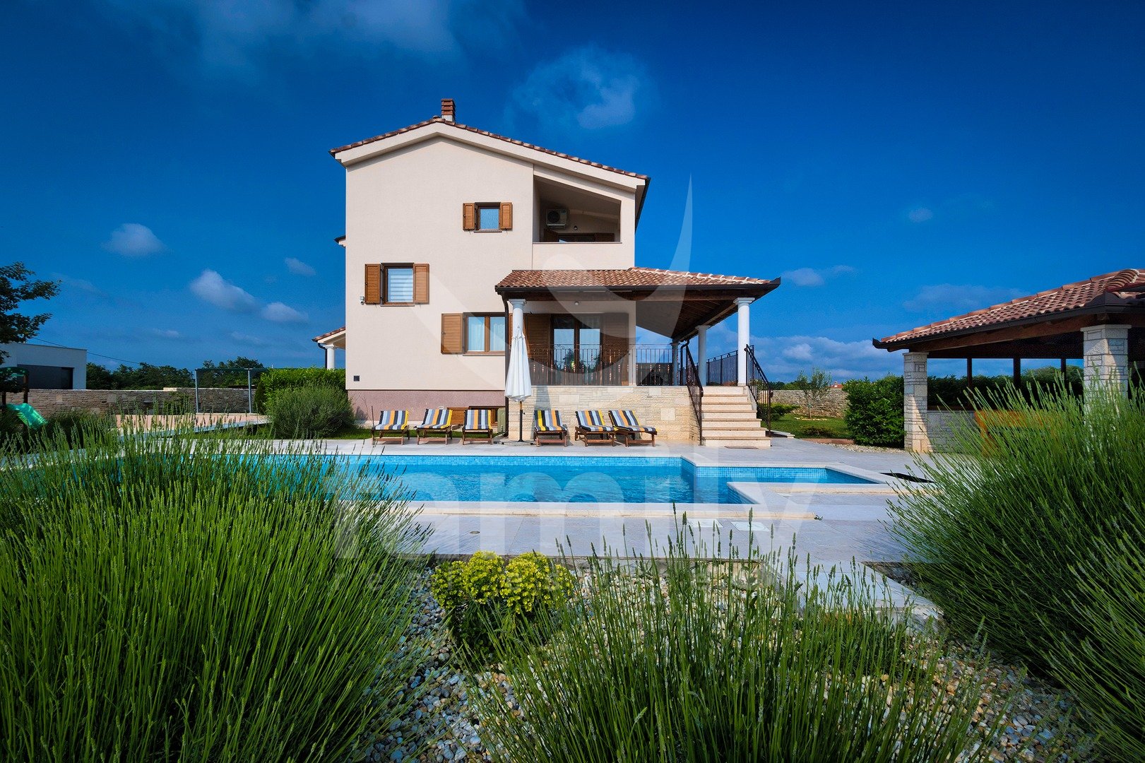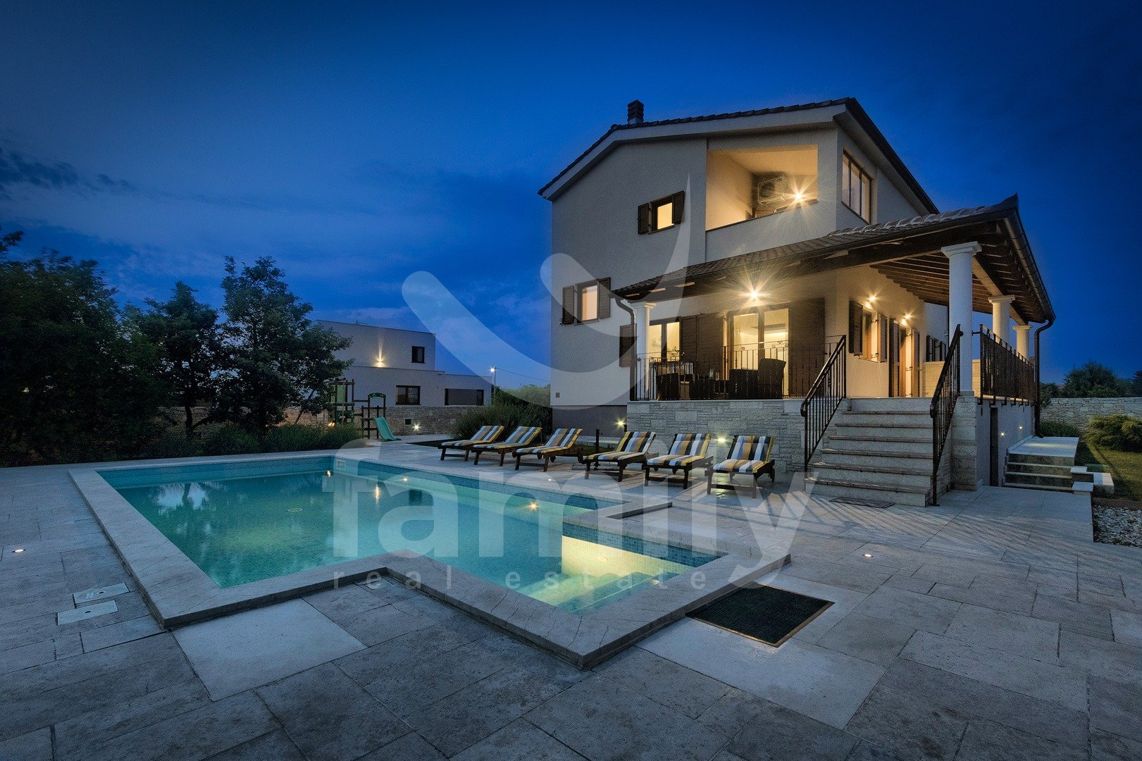 Tik v bližini Svetvinčenta se nahaja ta skrbno zasnovana luksuzna vila v mirni vasici Štokovci, velika 294 m2, ki predstavlja popolno kombinacijo sodobnega dizajna, energetske učinkovitosti in udobja. Stavba ima energetski certifikat A+, zahvaljujoč visokokakovostni izolaciji (10 cm grafitnega polistirena) in troslojnemu PVC stavbnemu pohištvu z nizkoemisijskim plinskim steklom, ki znatno zmanjšuje stroške ogrevanja in hlajenja. Stavba je opremljena s centralnim ogrevanjem, vsaka soba pa ima klimatsko napravo, kar zagotavlja udobje skozi vse leto. Vila se nahaja na prostorni in zelo premišljeno zasnovani parceli velikosti 2000 m2.