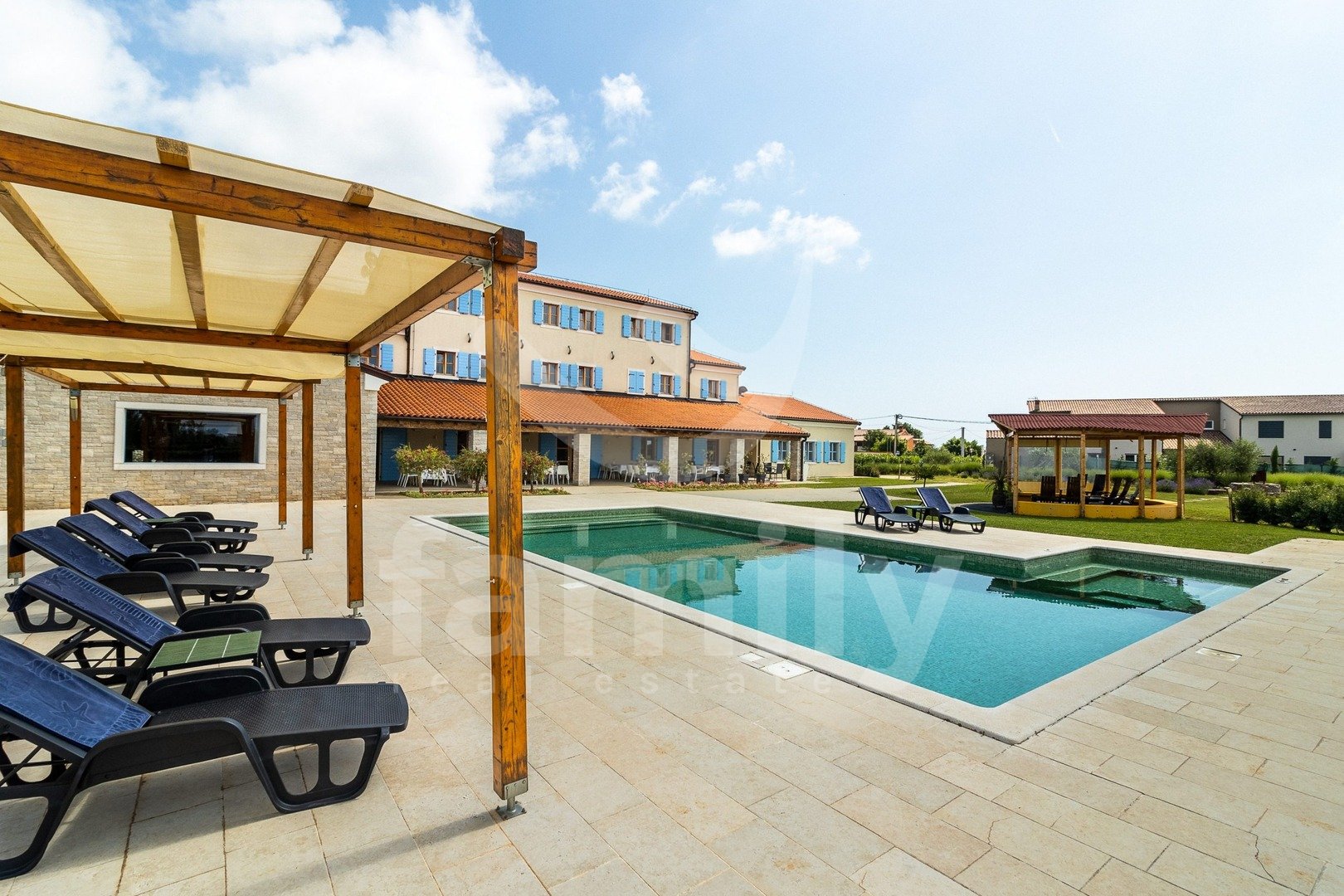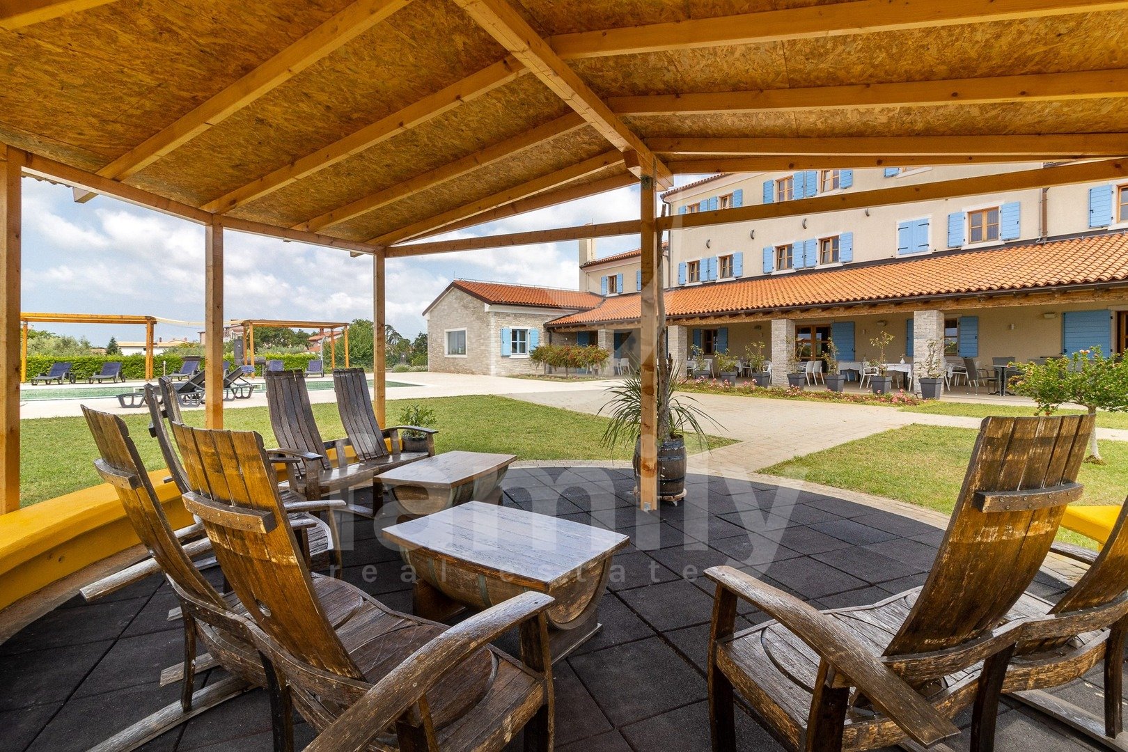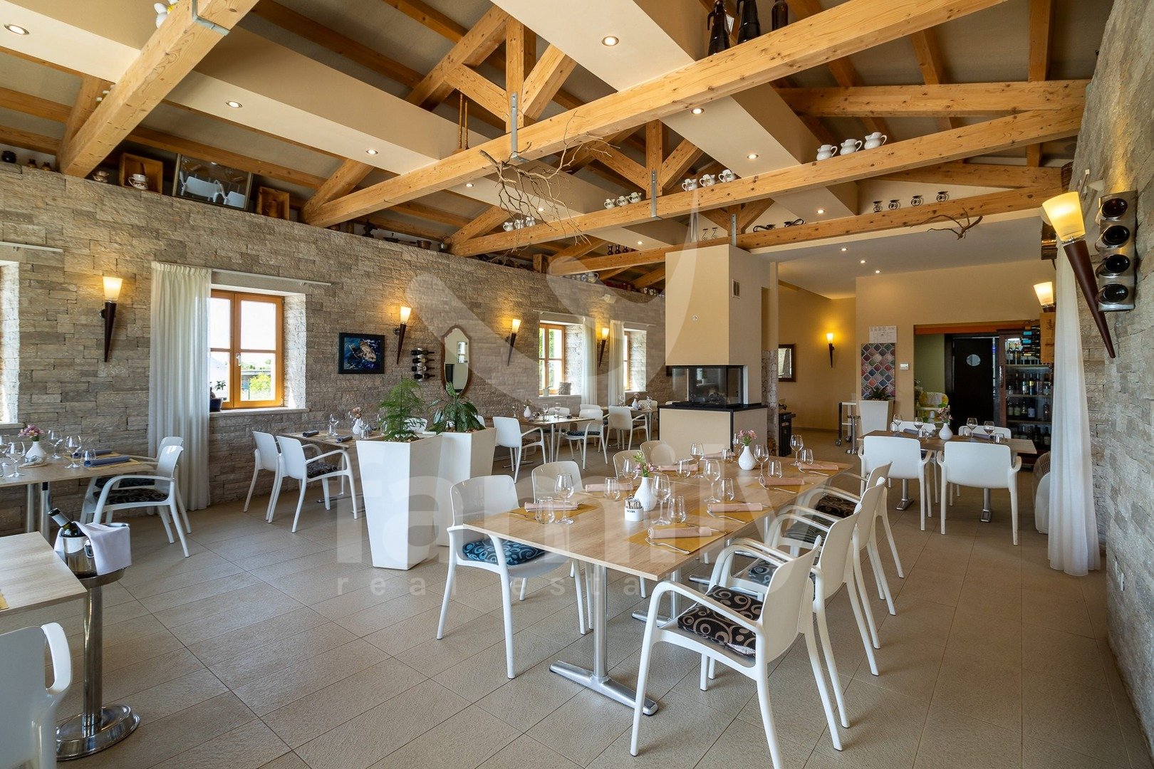 Ta štirizvezdični hotel italijanskega dizajna se nahaja v vasi nedaleč od Ližnjana, s skupno površino 866 m2 na parceli velikosti 5900 m2 in se razprostira na štirih nadstropjih. V kleti poslovne stavbe se nahaja urejena in opremljena degustacijska soba, soba velikosti 100 m2, ki se trenutno uporablja kot skladišče in ima vse potrebne instalacije za preureditev v wellness prostor, ter soba za upravljanje pametnega sistema hotela. Pritličje tega čudovitega hotela je brez ovir in prilagojeno osebam s posebnimi potrebami. V pritličju se nahaja sejna ali konferenčna soba s površino 90 m2 in kapaciteto za 60 do 70 oseb, opremljena z avdiovizualno opremo z zatemnitvenimi zavesami, prostorom za shranjevanje garderob, sprejemnim prostorom, pisarno, dvema moškima in dvema ženskima straniščema, pralnico s pralnim in sušilnim strojem ter vsem potrebnim za shranjevanje oblačil, vgradnimi omarami za shranjevanje plaščev/jakn, vgrajenim dvigalom s 4 postajami, aperitiv barom s stenami, obloženimi s čudovitim istrskim kamnom, prostorno restavracijo s kapaciteto 80 oseb, opremljeno z večnamenskim pohištvom in modernim kaminom v središču restavracije, prostorno kuhinjo s površino 100 m2, ki je v celoti skladna s pravili HACCP in je opremljena z vrhunskimi aparati, ima pa tudi ločeno slaščičarno, skladiščni prostor s komoro, stranišče za osebje in tuše, med restavracijo in kuhinjo pa je del za pripravo in strežbo hrane. Pritličje te poslovne stavbe dodatno krasi čudovita, v celoti pokrita terasa s fiksno streho iz strešnikov, pod streho pa je podstavek iz desk in lesenih tramov za popolno vzdušje na njej. Terasa ponuja čudovit razgled na bazen in skrbno vzdrževano hotelsko okolico.