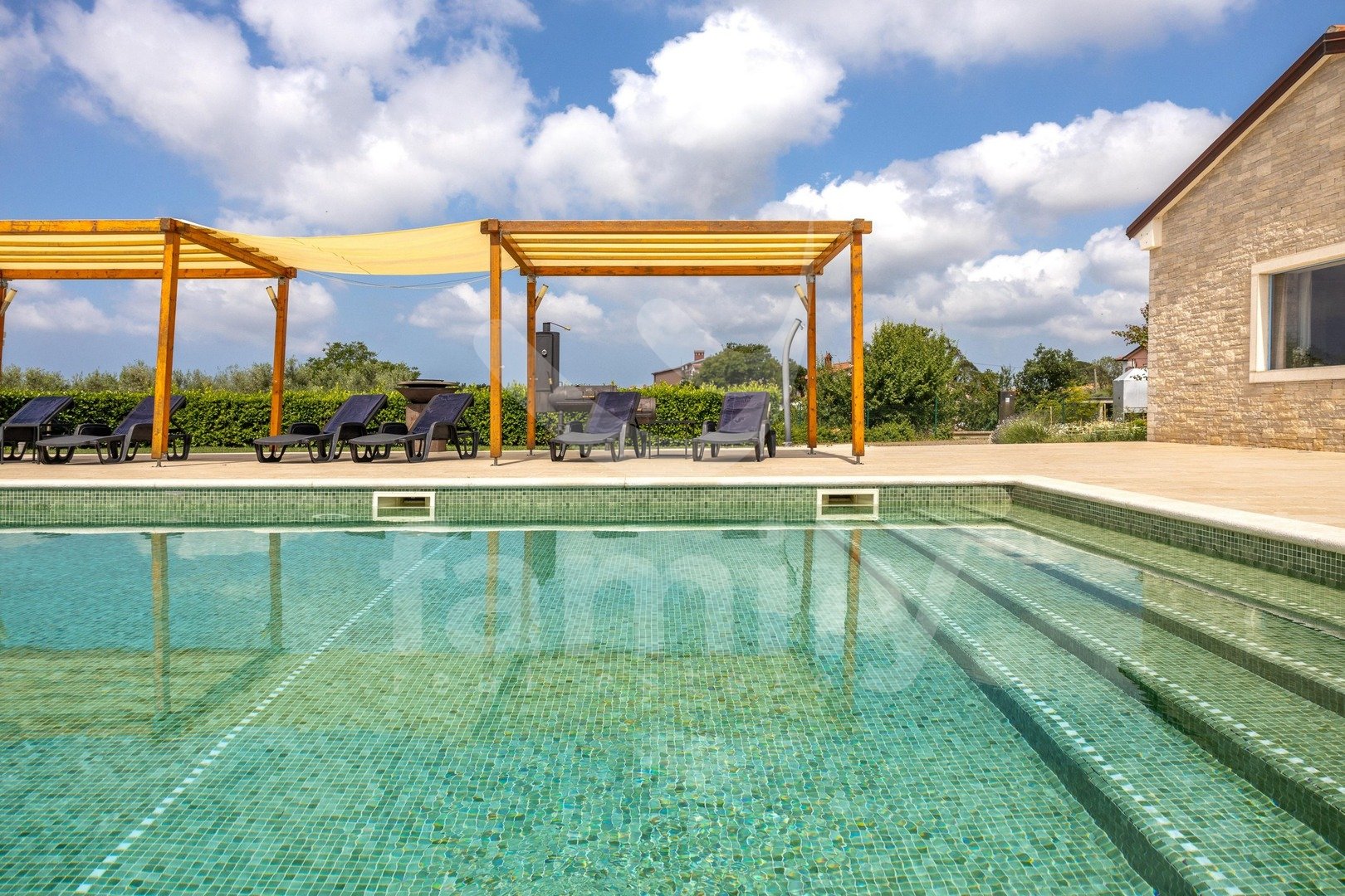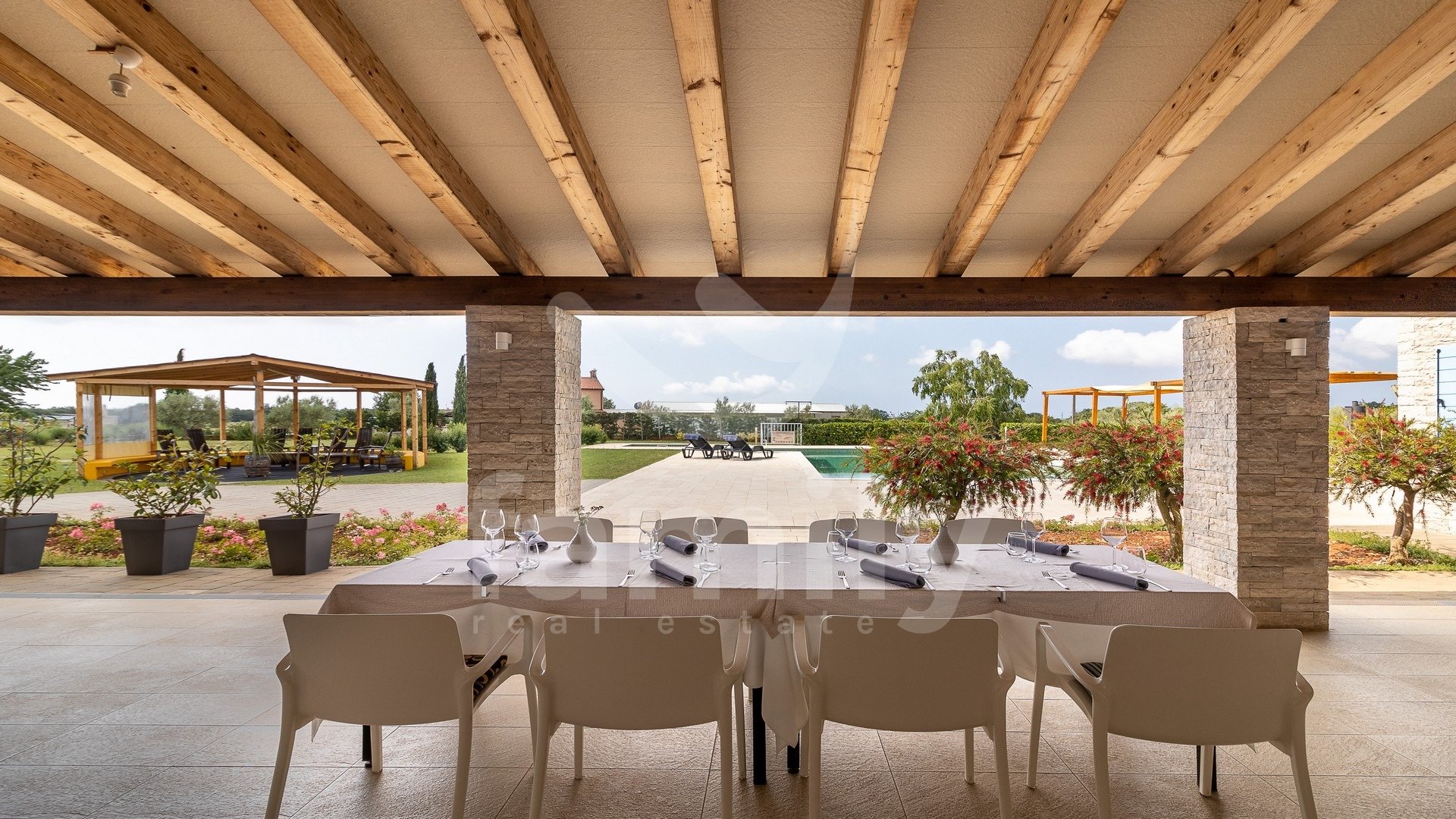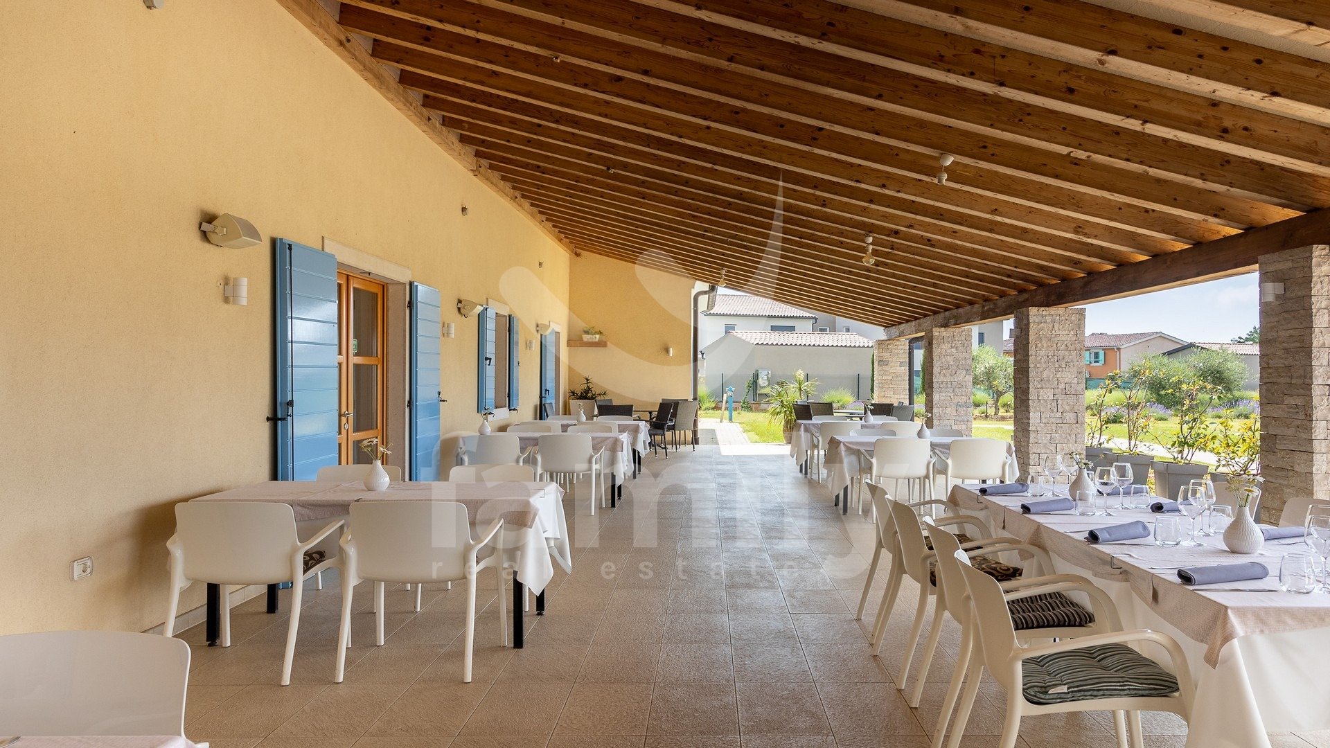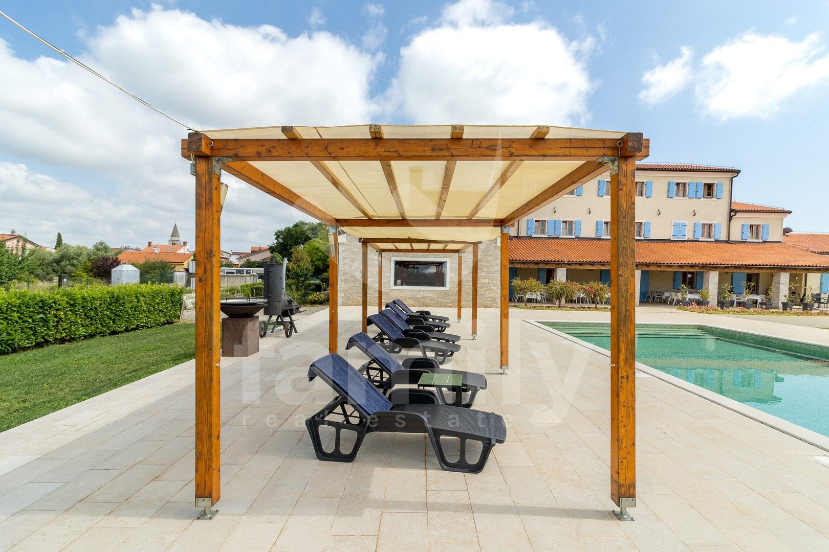 Ta štirizvezdični hotel italijanskega dizajna se nahaja v vasi nedaleč od Ližnjana, s skupno površino 866 m2 na parceli velikosti 5900 m2 in se razprostira na štirih nadstropjih. V kleti poslovne stavbe se nahaja urejena in opremljena degustacijska soba, soba velikosti 100 m2, ki se trenutno uporablja kot skladišče in ima vse potrebne instalacije za preureditev v wellness prostor, ter soba za upravljanje pametnega sistema hotela. Pritličje tega čudovitega hotela je brez ovir in prilagojeno osebam s posebnimi potrebami. V pritličju se nahaja sejna ali konferenčna soba s površino 90 m2 in kapaciteto za 60 do 70 oseb, opremljena z avdiovizualno opremo z zatemnitvenimi zavesami, prostorom za shranjevanje garderob, sprejemnim prostorom, pisarno, dvema moškima in dvema ženskima straniščema, pralnico s pralnim in sušilnim strojem ter vsem potrebnim za shranjevanje oblačil, vgradnimi omarami za shranjevanje plaščev/jakn, vgrajenim dvigalom s 4 postajami, aperitiv barom s stenami, obloženimi s čudovitim istrskim kamnom, prostorno restavracijo s kapaciteto 80 oseb, opremljeno z večnamenskim pohištvom in modernim kaminom v središču restavracije, prostorno kuhinjo s površino 100 m2, ki je v celoti skladna s pravili HACCP in je opremljena z vrhunskimi aparati, ima pa tudi ločeno slaščičarno, skladiščni prostor s komoro, stranišče za osebje in tuše, med restavracijo in kuhinjo pa je del za pripravo in strežbo hrane. Pritličje te poslovne stavbe dodatno krasi čudovita, v celoti pokrita terasa s fiksno streho iz strešnikov, pod streho pa je podstavek iz desk in lesenih tramov za popolno vzdušje na njej. Terasa ponuja čudovit razgled na bazen in skrbno vzdrževano hotelsko okolico.