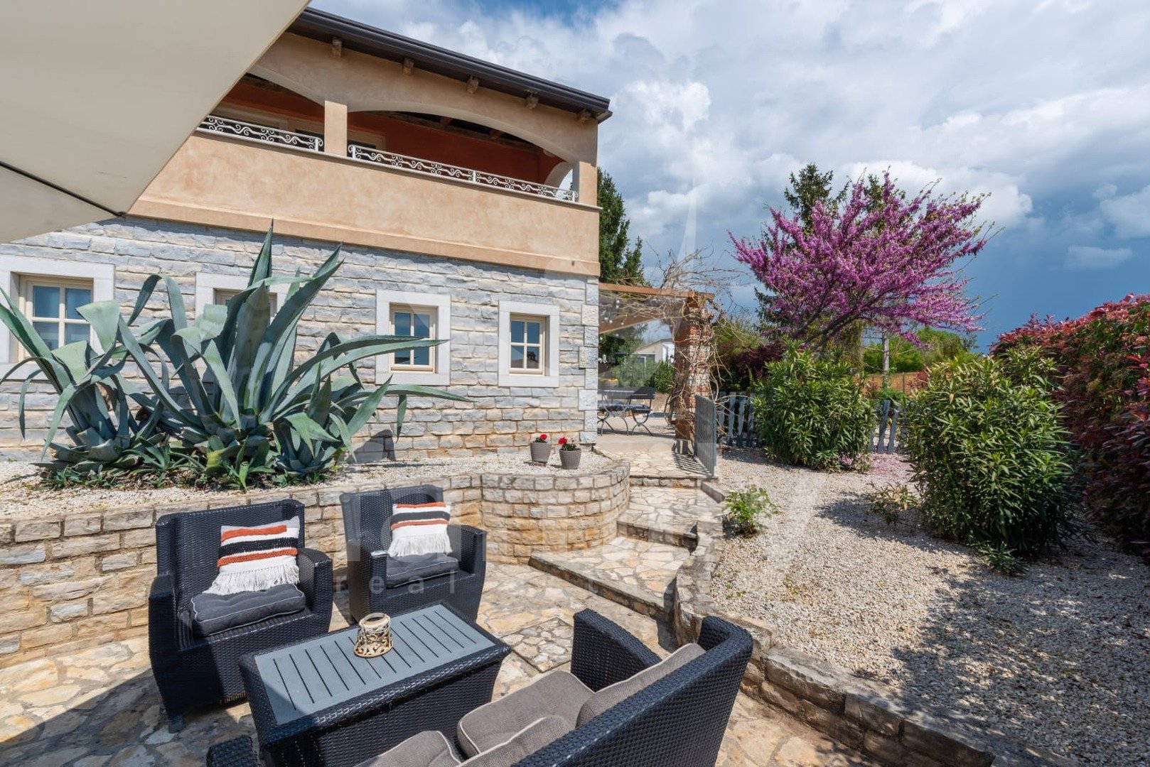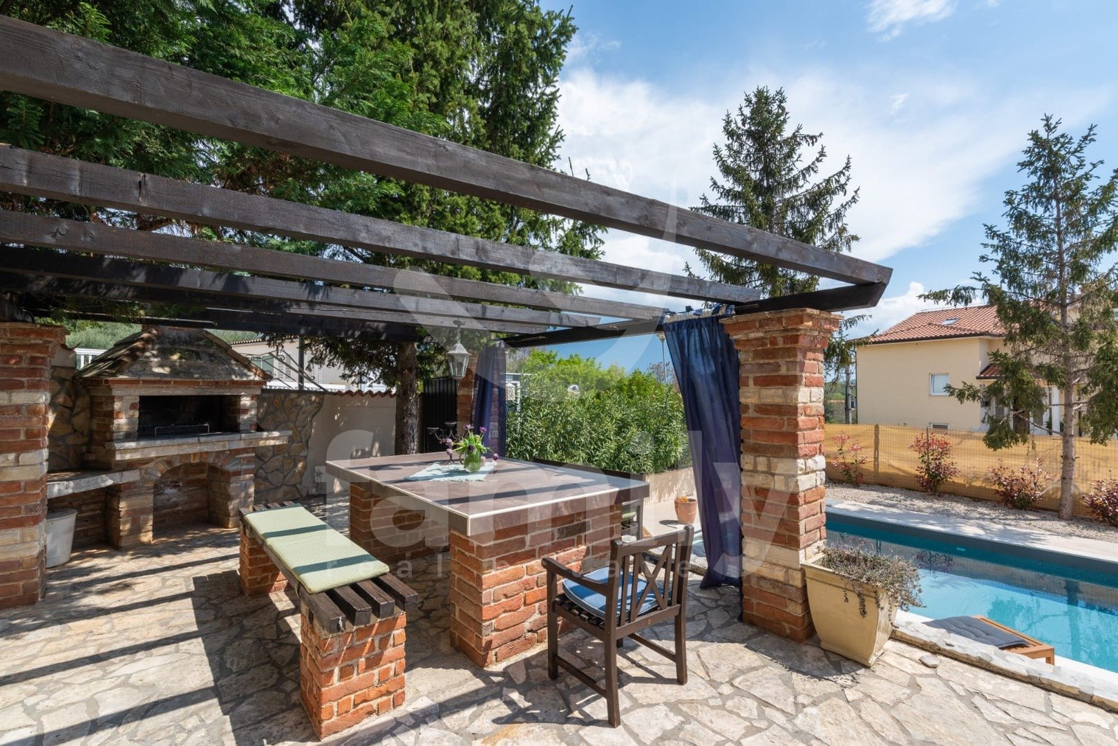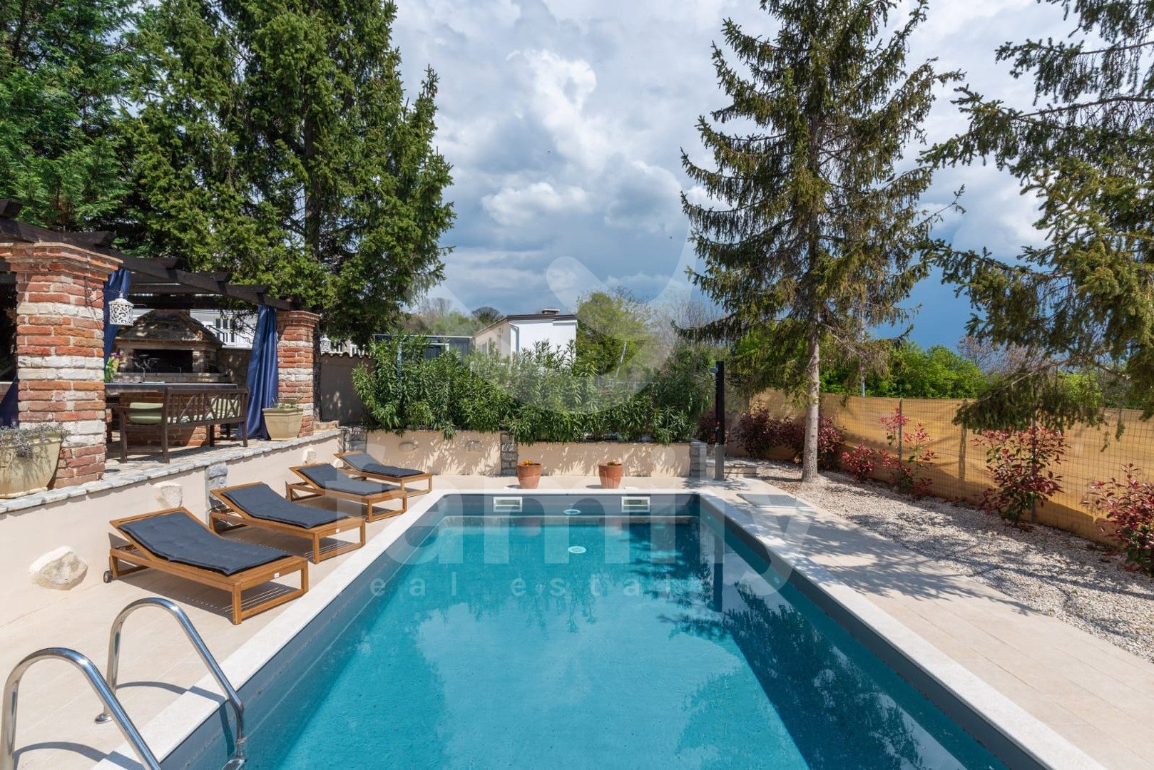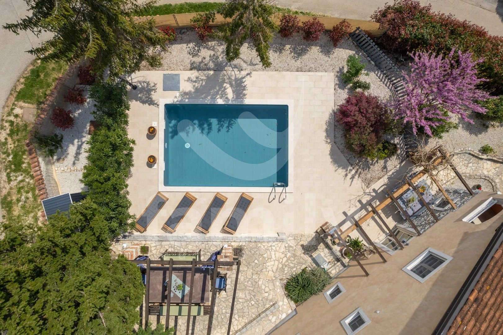 Vrt, poln čudovitih cvetočih rastlin, velik 710 m², je idealen za sprostitev in druženje ob bazenu (dimenzije 6m x 4m). Bazen se nahaja na južni strani, zato je sončen skoraj ves dan. Pred hišo je parkirišče za tri avtomobile.
