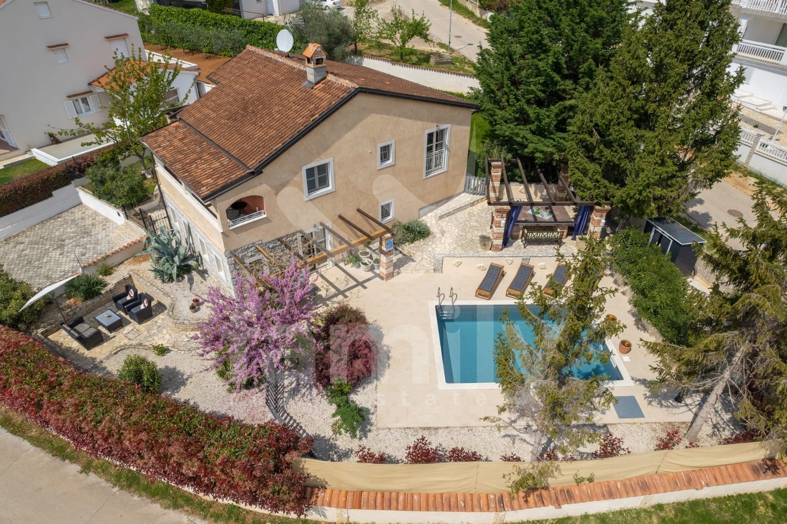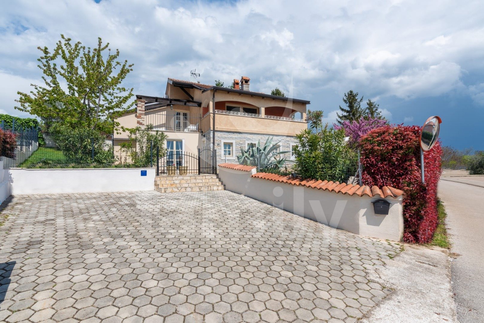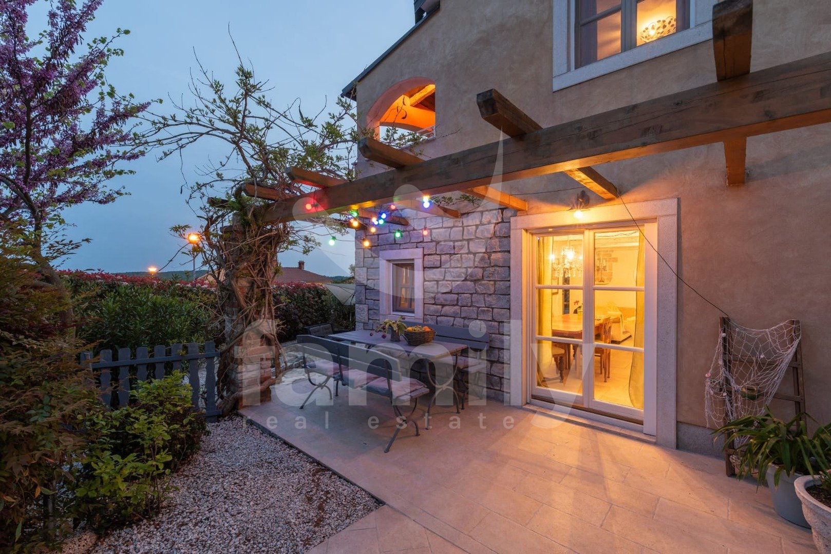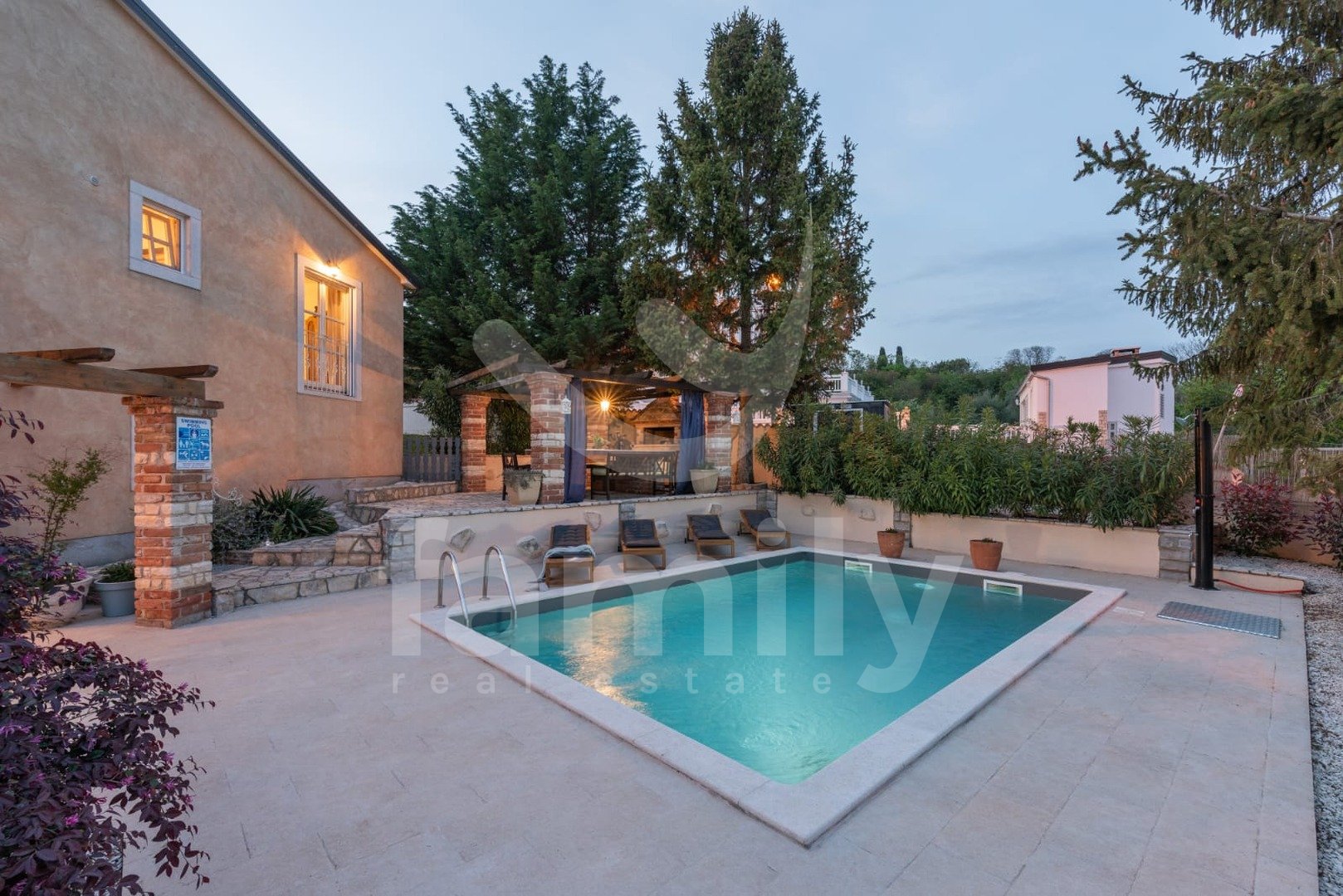 Le 4 km od mesta Poreč in njegovih čudovitih plaž se nahaja ta čudovita, samostojna mediteranska hiša. Ta očarljiva hiša je idealna za mirno in sproščujoče življenje, saj se nahaja v mirnem in urejenem naselju. Celotna parcela je obdana z okrasnimi rastlinami in lepo ograjo, kar ji zagotavlja dodatno zasebnost. Hiša se razprostira na površini 180 m² in ponuja prostorno dnevno sobo v pritličju, idealno za družinska srečanja, z odprtim prostorom do jedilnice in popolnoma opremljeno kuhinjo za skupne obroke. V istem prostoru se nahaja tudi tradicionalni istrski kamin za zimsko vzdušje. Ta skupni prostor ima dostop do urejenega vrta z bazenom in žarom. V pritličju se nahaja tudi ena spalnica s francosko teraso in dostopom do vrta. Prostoren hodnik s stopnicami vodi v prvo nadstropje. Zelo praktični prostori v pritličju sta dve popolnoma opremljeni kopalnici, ena se nahaja na hodniku, druga pa ločeno v skupnem dnevnem prostoru.