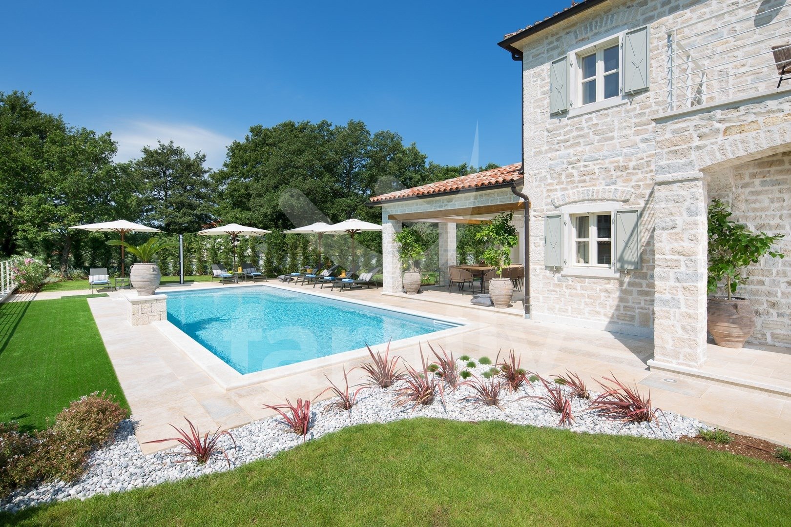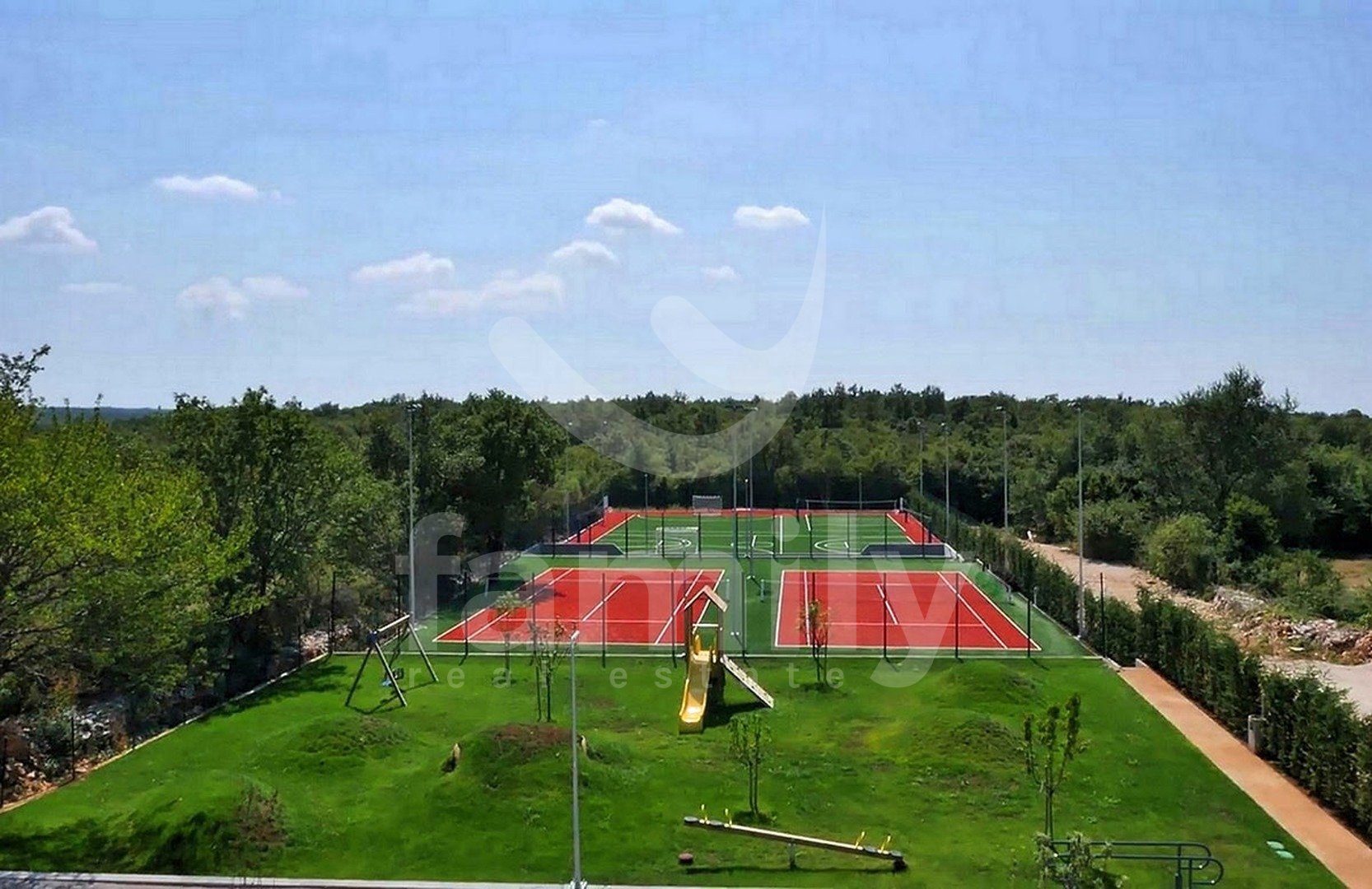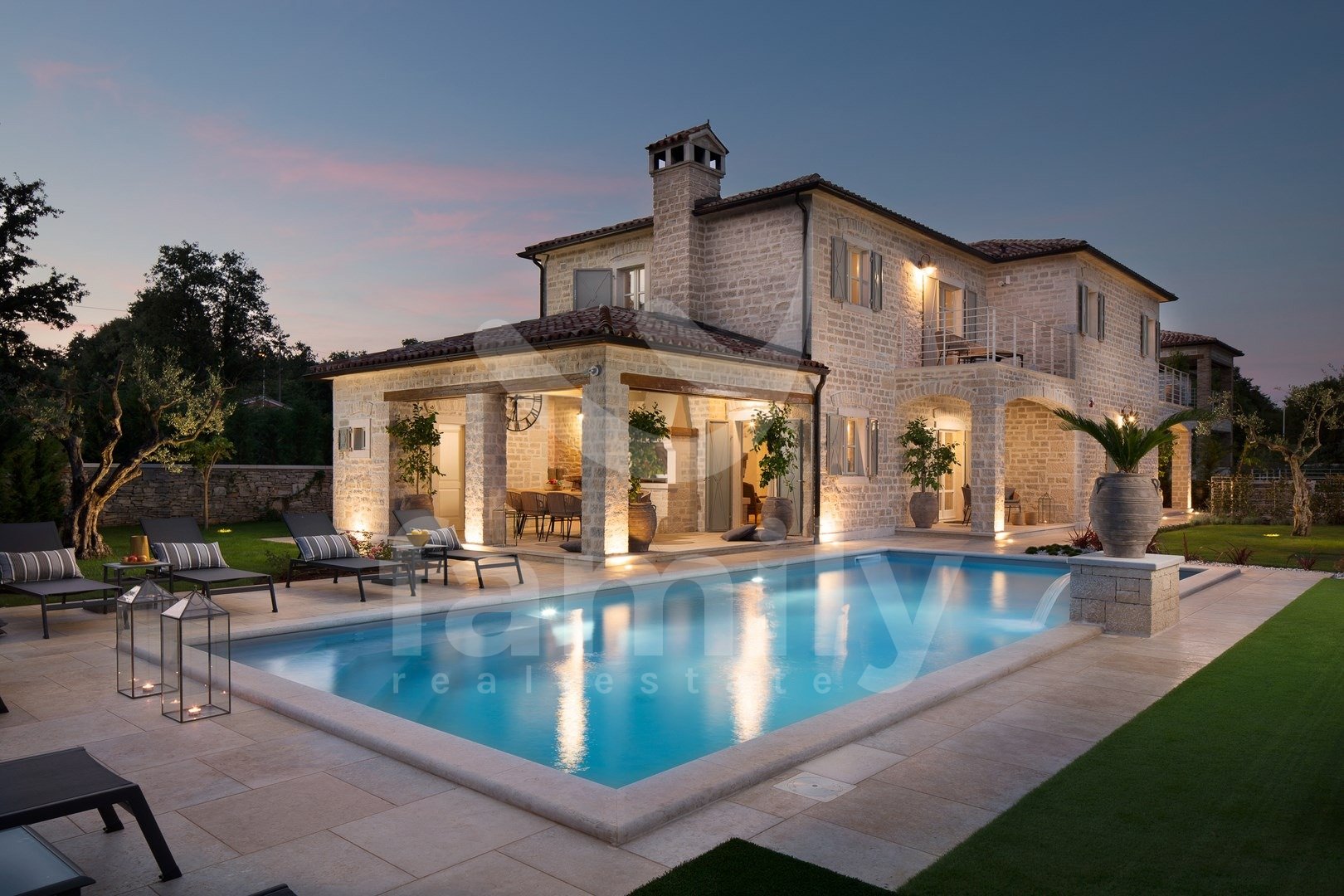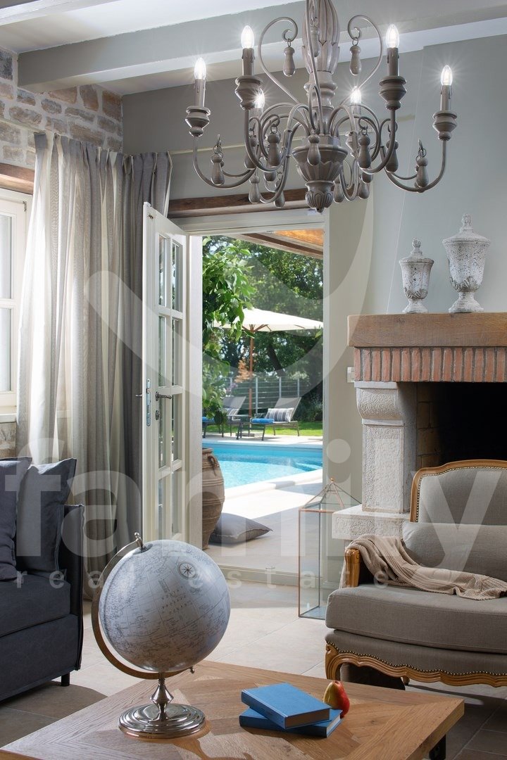 Nedaleč od Kanfanarja, v majhni vasici, se nahaja ta čudovita in razkošna vila velikosti 359 m2 z vrtom velikosti 880 m2. Vila se razprostira na dveh nadstropjih, pritličju in prvem nadstropju. V pritličju se nahaja izjemno prostorna in svetla dnevna soba z odprtim kaminom, iz katere je izhod na prostorno pokrito teraso, moderna rustikalna, kakovostna kuhinja z jedilnico, spalnica z lastno kopalnico in še en WC za goste, celotno pritličje pa je prekrito s kakovostnimi italijanskimi dizajnerskimi ploščicami. V prvem nadstropju so še tri udobne spalnice, vsaka s svojo kopalnico, od katerih imata dve dostop do terase, sobe pa imajo 14 mm debele hrastove parketne deske. Notranje stopnice so prekrite z masivnim hrastovim parketom. Ogrevanje je centralno na kurilno olje, v pritličju talno ogrevanje, medtem ko je prvo nadstropje hiše opremljeno z dizajnerskimi radiatorji, zaradi česar je nepremičnina primerna za celoletno uporabo. Klimatske naprave se nahajajo v vsaki sobi te impresivne vile. Vrt je impresiven in na njem se nahaja 54 m2 velik bazen, prostor za sončenje, kopalnica in dve zaprti parkirni mesti. Poleg vsega naštetega ima nepremičnina tudi športno-rekreacijski kompleks, ki se razprostira na površini 5600 m2 za rokomet, košarko in nogomet, igrišče za odbojko, dve teniški igrišči, kegljišče, zunanji fitnes center, otroško igrišče, na voljo pa je tudi eko zelenjavni vrt za pridelavo lastne eko hrane.