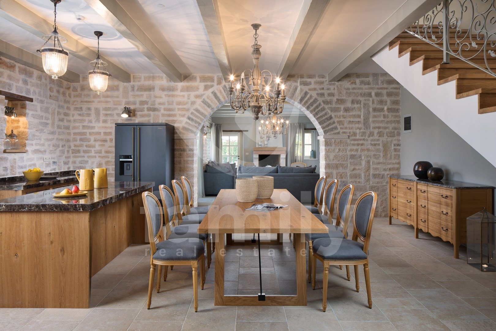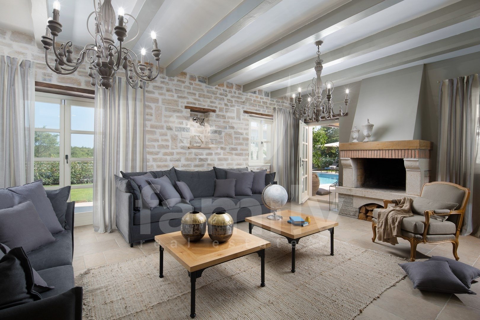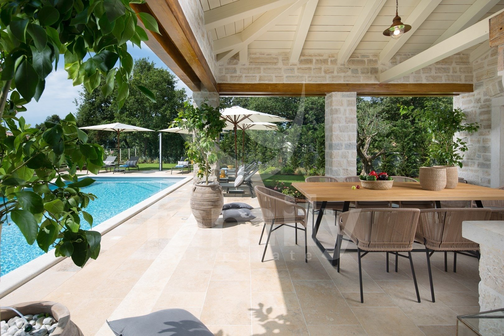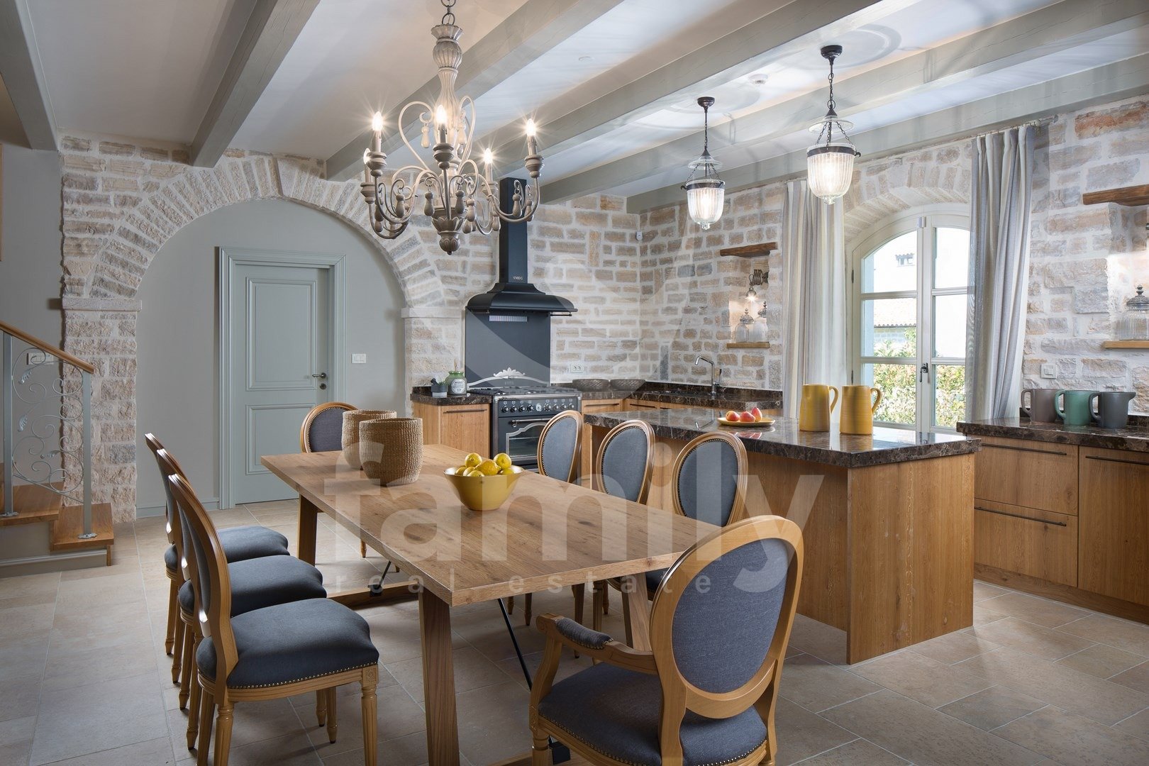Nedaleč od Kanfanarja, v majhni vasici, se nahaja ta čudovita in razkošna vila velikosti 359 m2 z vrtom velikosti 880 m2. Vila se razprostira na dveh nadstropjih, pritličju in prvem nadstropju. V pritličju se nahaja izjemno prostorna in svetla dnevna soba z odprtim kaminom, iz katere je izhod na prostorno pokrito teraso, moderna rustikalna, kakovostna kuhinja z jedilnico, spalnica z lastno kopalnico in še en WC za goste, celotno pritličje pa je prekrito s kakovostnimi italijanskimi dizajnerskimi ploščicami. V prvem nadstropju so še tri udobne spalnice, vsaka s svojo kopalnico, od katerih imata dve dostop do terase, sobe pa imajo 14 mm debele hrastove parketne deske. Notranje stopnice so prekrite z masivnim hrastovim parketom. Ogrevanje je centralno na kurilno olje, v pritličju talno ogrevanje, medtem ko je prvo nadstropje hiše opremljeno z dizajnerskimi radiatorji, zaradi česar je nepremičnina primerna za celoletno uporabo. Klimatske naprave se nahajajo v vsaki sobi te impresivne vile. Vrt je impresiven in na njem se nahaja 54 m2 velik bazen, prostor za sončenje, kopalnica in dve zaprti parkirni mesti. Poleg vsega naštetega ima nepremičnina tudi športno-rekreacijski kompleks, ki se razprostira na površini 5600 m2 za rokomet, košarko in nogomet, igrišče za odbojko, dve teniški igrišči, kegljišče, zunanji fitnes center, otroško igrišče, na voljo pa je tudi eko zelenjavni vrt za pridelavo lastne eko hrane.