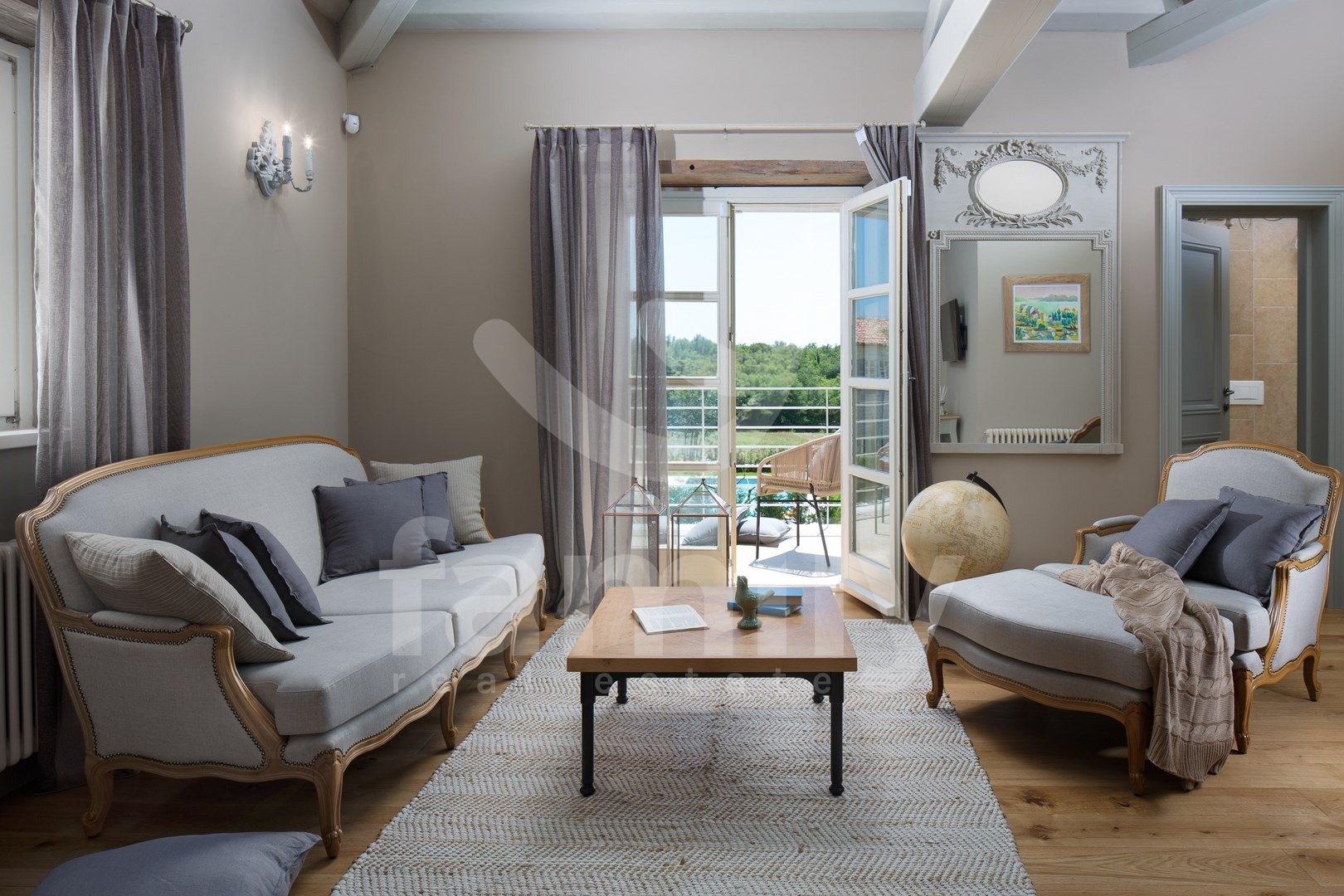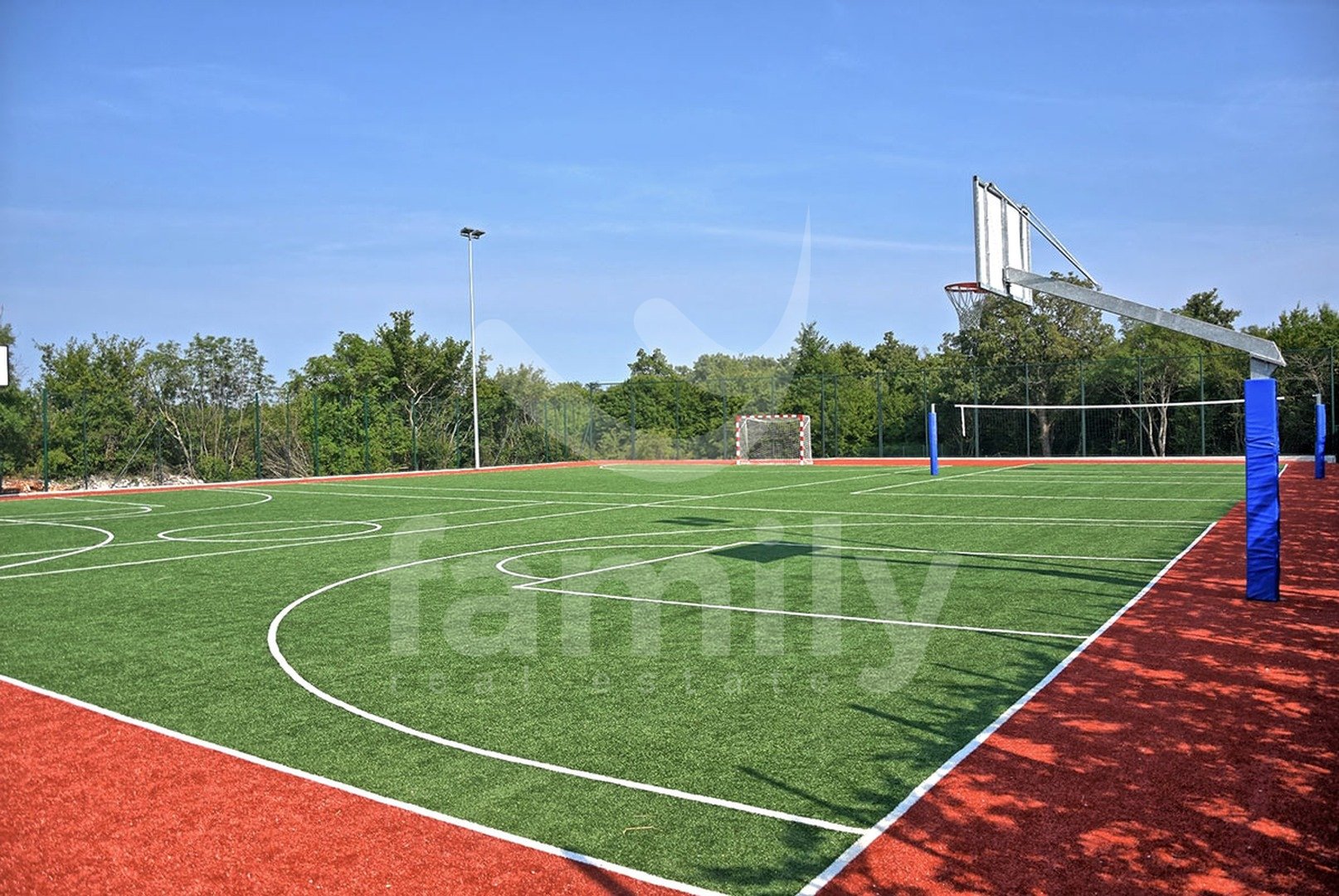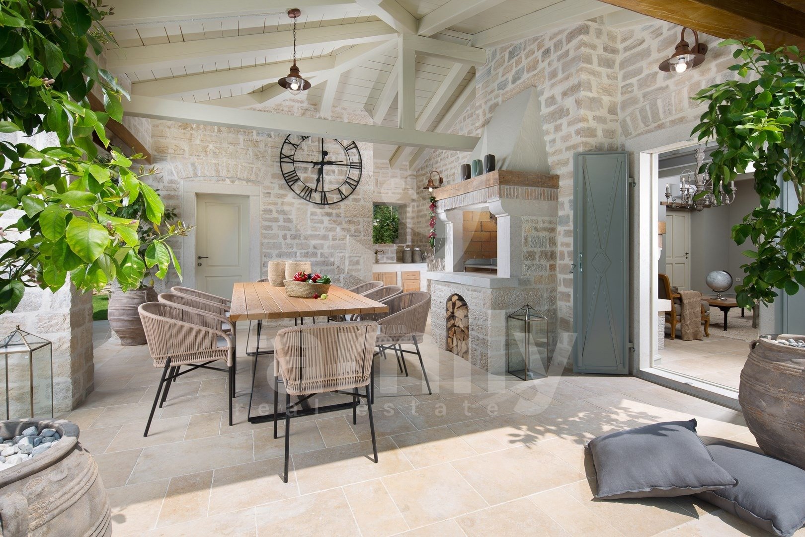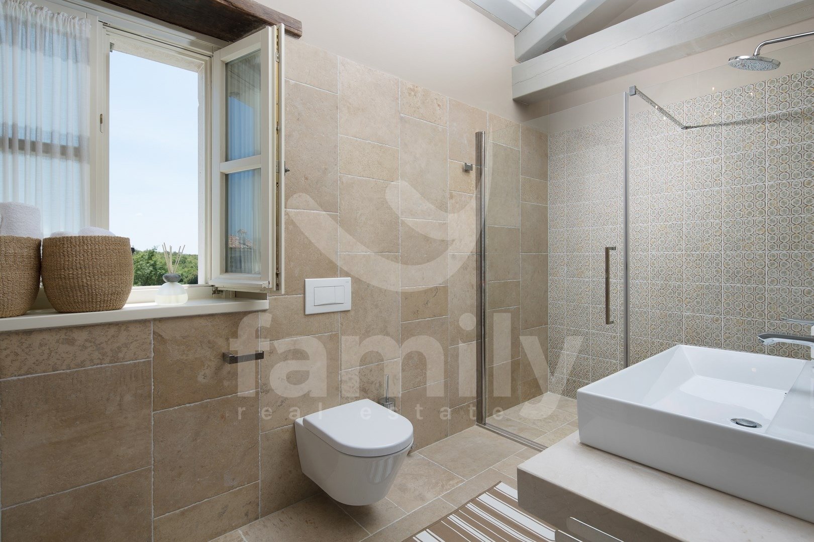 Nedaleč od Kanfanarja, v majhni vasici, se nahaja ta čudovita in razkošna vila velikosti 359 m2 z vrtom velikosti 880 m2. Vila se razprostira na dveh nadstropjih, pritličju in prvem nadstropju. V pritličju se nahaja izjemno prostorna in svetla dnevna soba z odprtim kaminom, iz katere je izhod na prostorno pokrito teraso, moderna rustikalna, kakovostna kuhinja z jedilnico, spalnica z lastno kopalnico in še en WC za goste, celotno pritličje pa je prekrito s kakovostnimi italijanskimi dizajnerskimi ploščicami. V prvem nadstropju so še tri udobne spalnice, vsaka s svojo kopalnico, od katerih imata dve dostop do terase, sobe pa imajo 14 mm debele hrastove parketne deske. Notranje stopnice so prekrite z masivnim hrastovim parketom. Ogrevanje je centralno na kurilno olje, v pritličju talno ogrevanje, medtem ko je prvo nadstropje hiše opremljeno z dizajnerskimi radiatorji, zaradi česar je nepremičnina primerna za celoletno uporabo. Klimatske naprave se nahajajo v vsaki sobi te impresivne vile. Vrt je impresiven in na njem se nahaja 54 m2 velik bazen, prostor za sončenje, kopalnica in dve zaprti parkirni mesti. Poleg vsega naštetega ima nepremičnina tudi športno-rekreacijski kompleks, ki se razprostira na površini 5600 m2 za rokomet, košarko in nogomet, igrišče za odbojko, dve teniški igrišči, kegljišče, zunanji fitnes center, otroško igrišče, na voljo pa je tudi eko zelenjavni vrt za pridelavo lastne eko hrane.