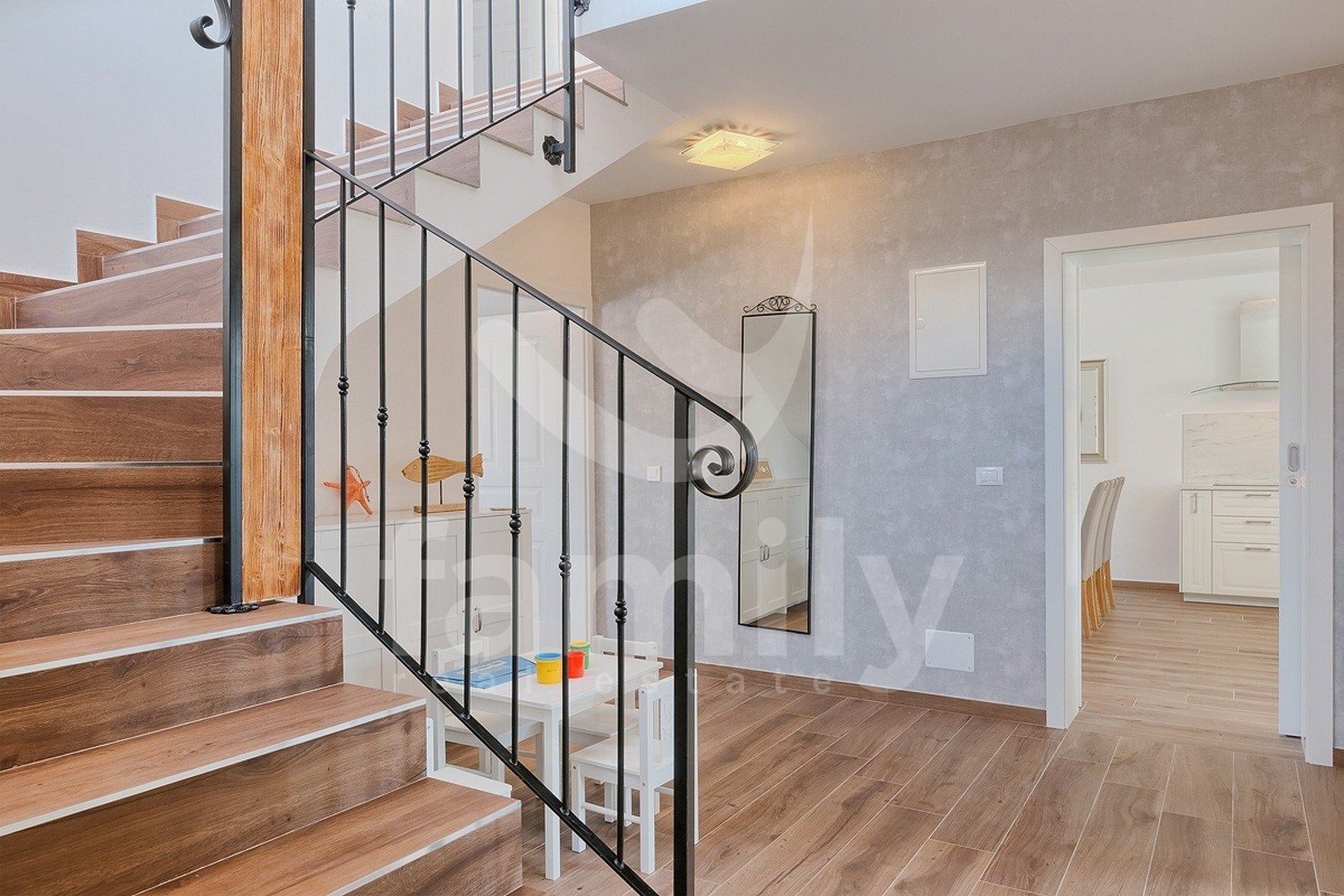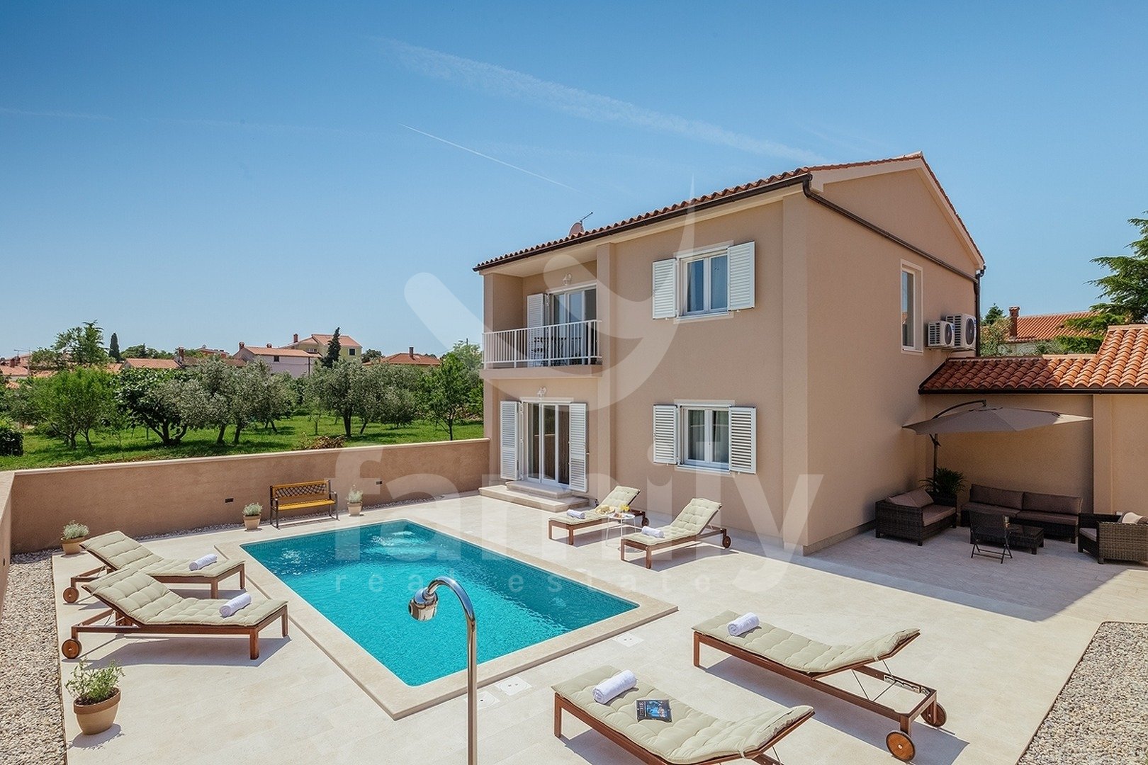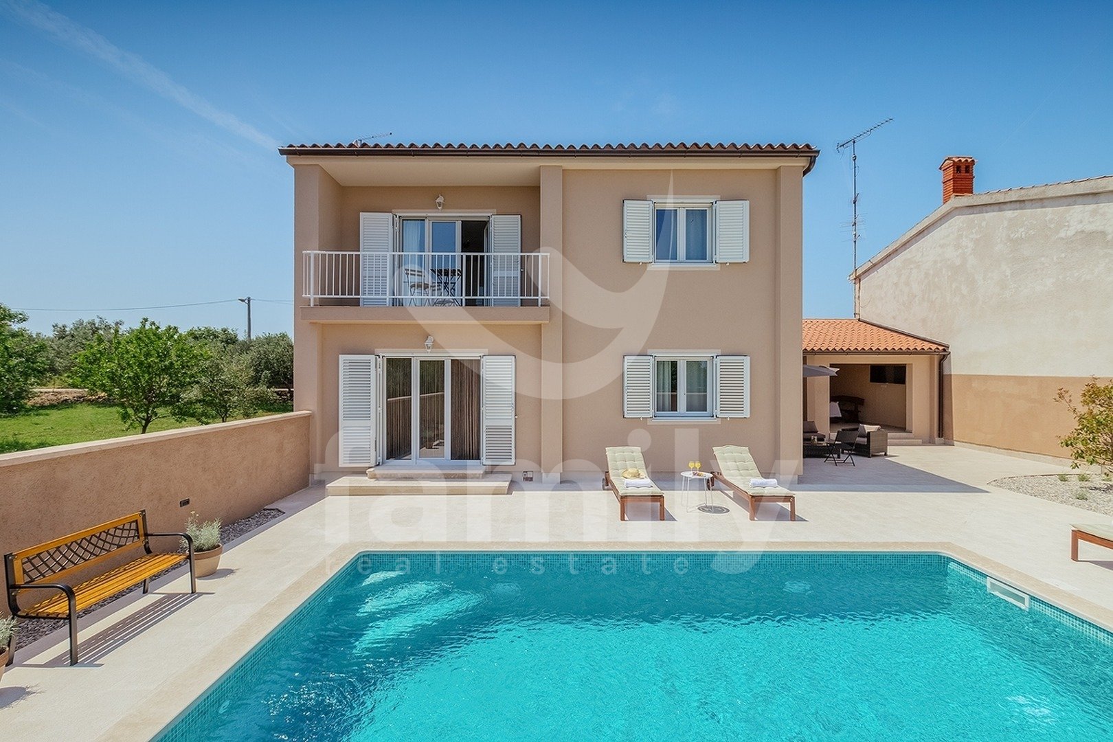 Ta čudovita vila velikosti 180 m2 na parceli velikosti 500 m2 se nahaja v Štinjanu, nedaleč od plaž in mesta Pula. Čudovita vila se razprostira na dveh nadstropjih. V pritličju vile je vhodna dvorana, ki deli posest na dve strani, na eni strani je lepo urejena in ločena konoba s kaminom in prostorom za druženje, drugi del pritličja pa je odprt koncept dnevne sobe z jedilnico in kuhinjo, soba, ki se uporablja kot pralnica, spalnica s kopalnico in stranišče za goste. V prvem nadstropju so še tri spalnice, ena z lastno kopalnico, drugi dve sobi pa si delita skupno. Poleg spalnic se v prvem nadstropju nahaja čudovita terasa s pogledom na bazen in okolico. Nepremičnina je opremljena s PVC stavbnim pohištvom in klimatsko napravo v vsaki sobi. Sprednji del nepremičnine vključuje dve parkirni mesti in zeleno površino, na zadnji strani pa se nahaja 25 m2 velik bazen, prostor za sončenje, shramba in čudovita terasa.