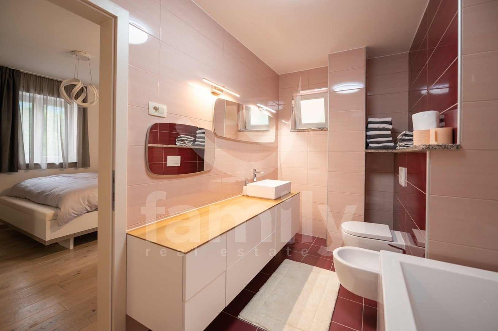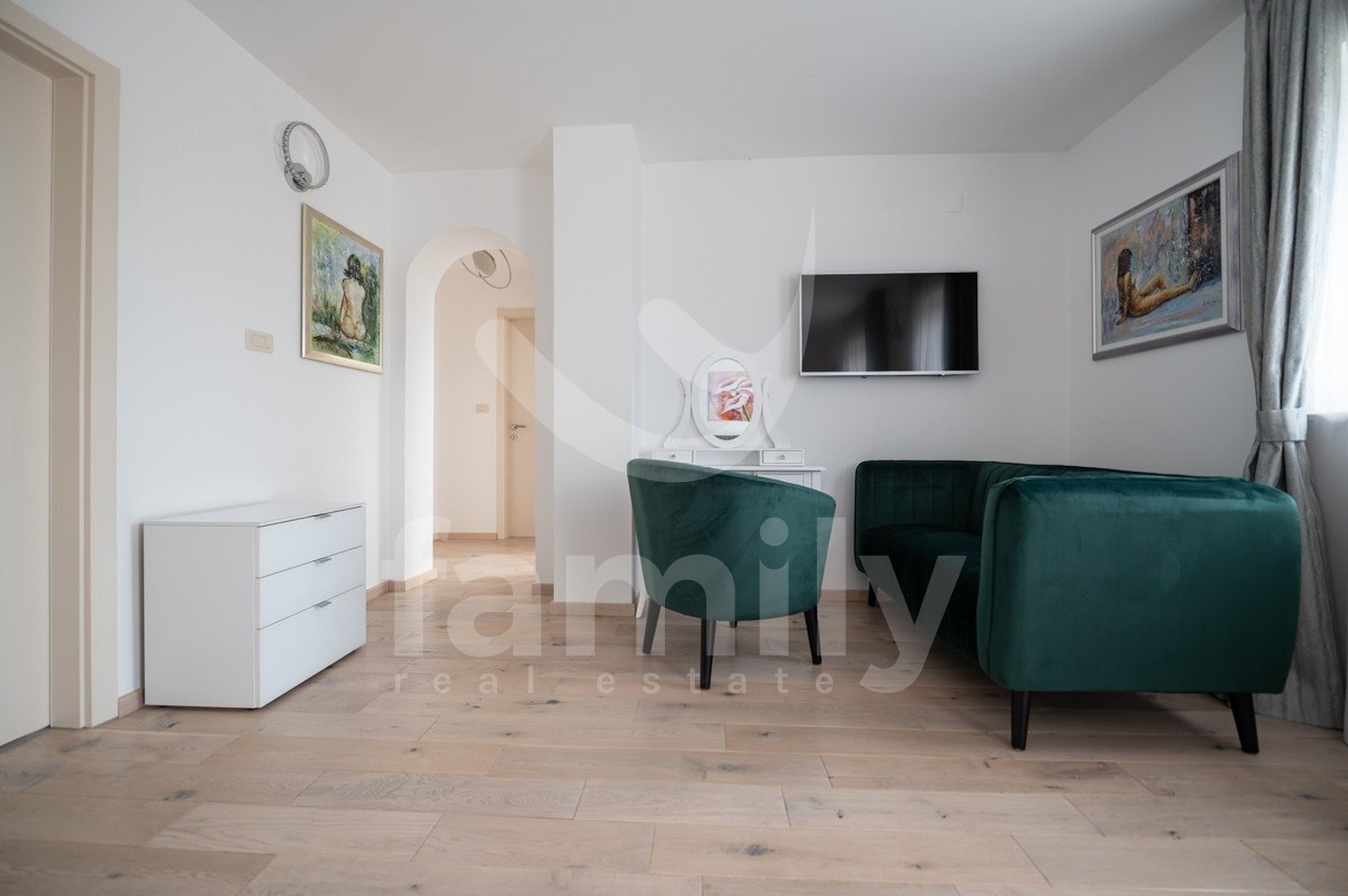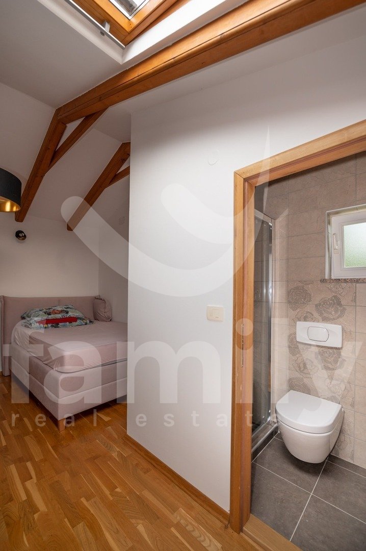 V drugem nadstropju se nahaja še eno stanovanje z ločenim vhodom preko zunanjega stopnišča, ki ga sestavljajo dve spalnici z lastno kopalnico, kuhinja, prijetno opremljena dnevna soba in jedilnica s čudovito notranjostjo in dvema terasama.