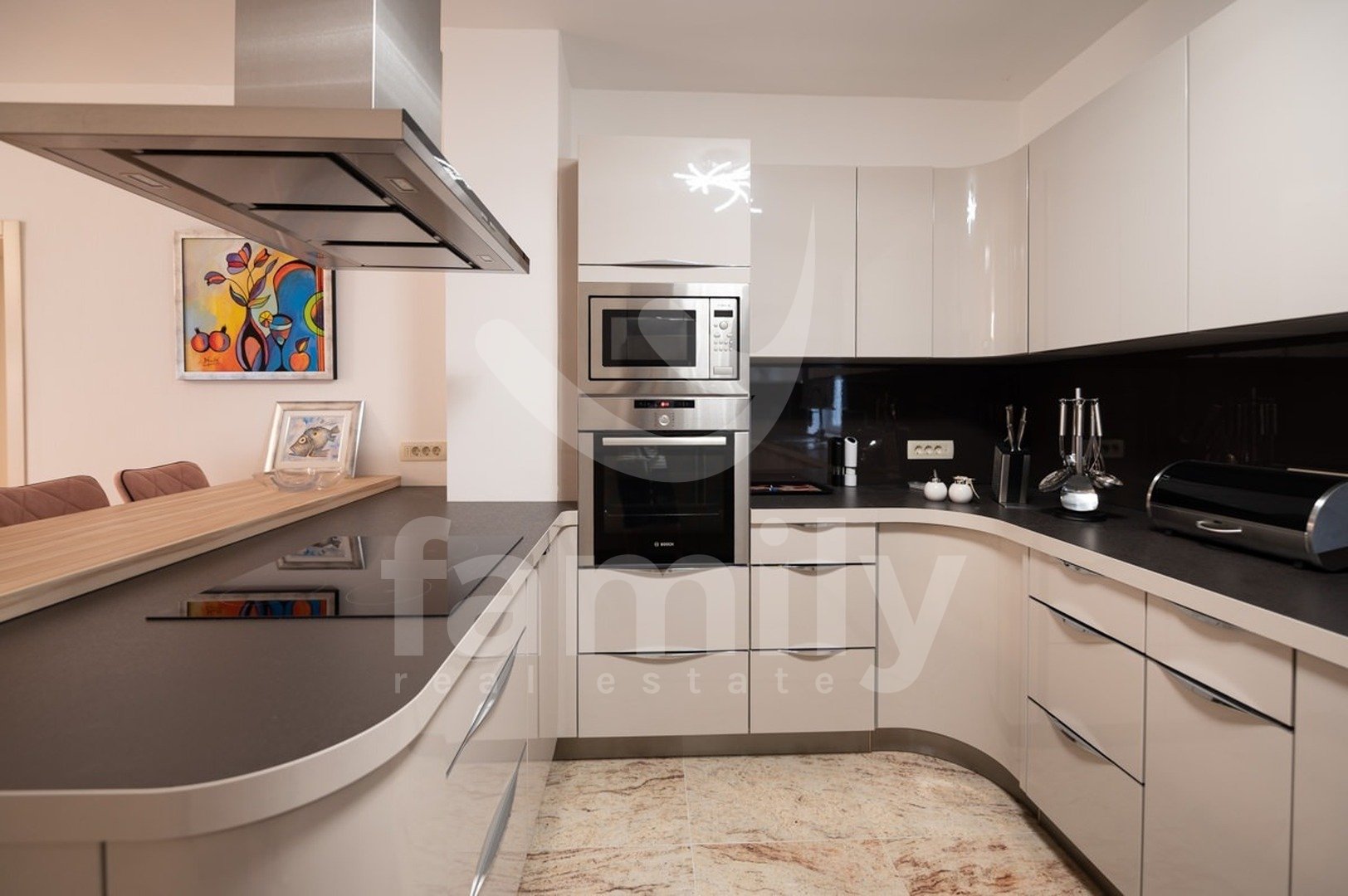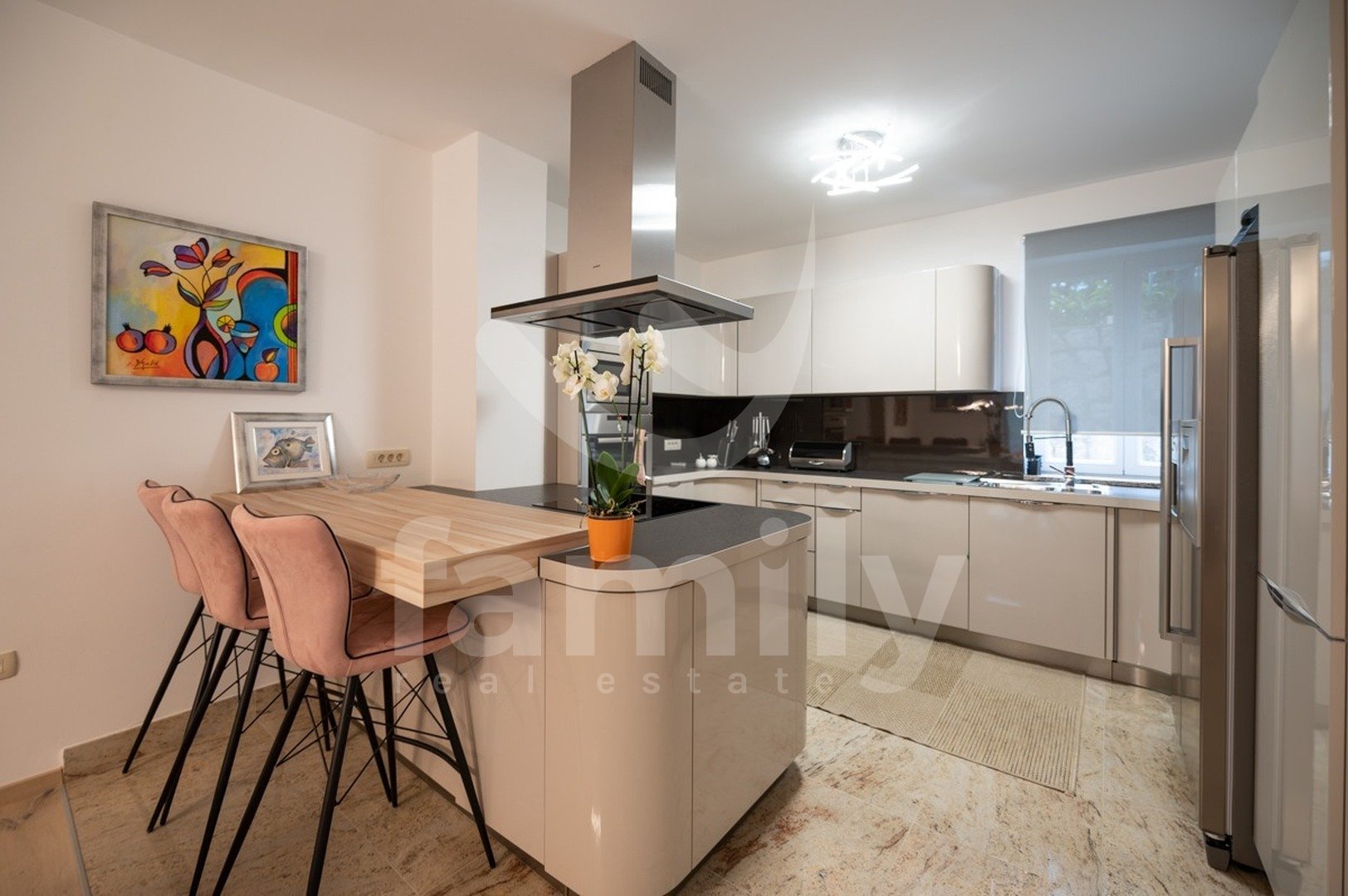 Pritličje sestavlja dvonadstropno stanovanje s stopniščem, straniščem, moderno dnevno sobo, popolnoma opremljeno kuhinjo, dve čudoviti prostorni spalnici z razkošnimi kopalnicami ter ločena terasa z žarom, kaminom, žarom in bazenom.
