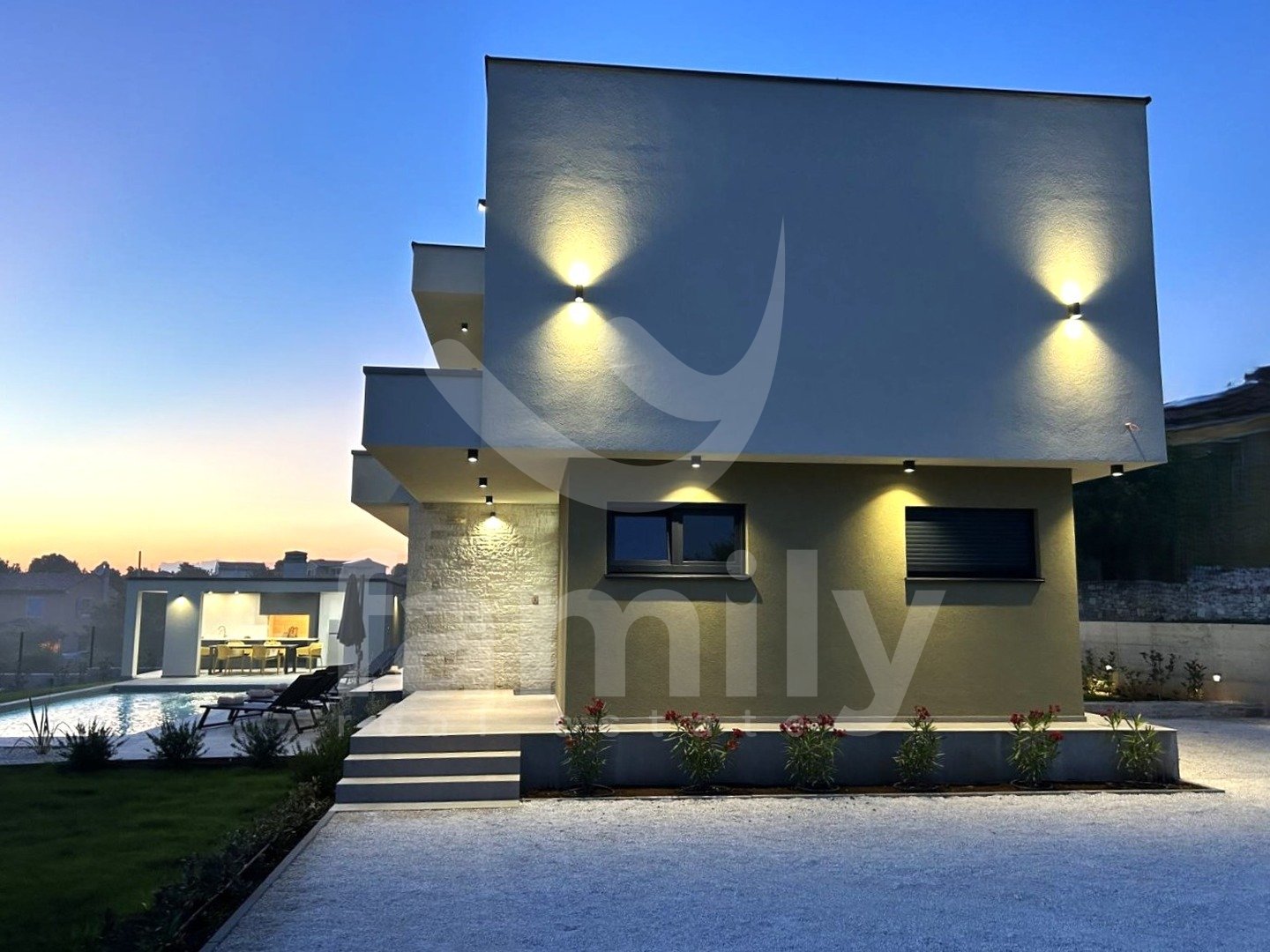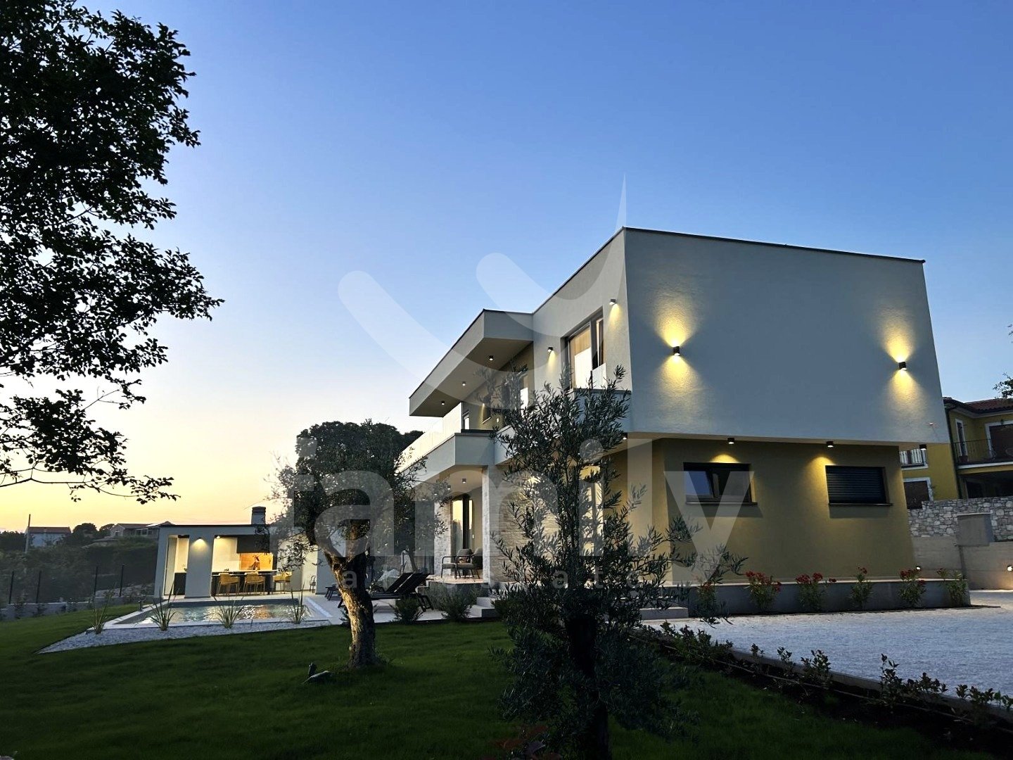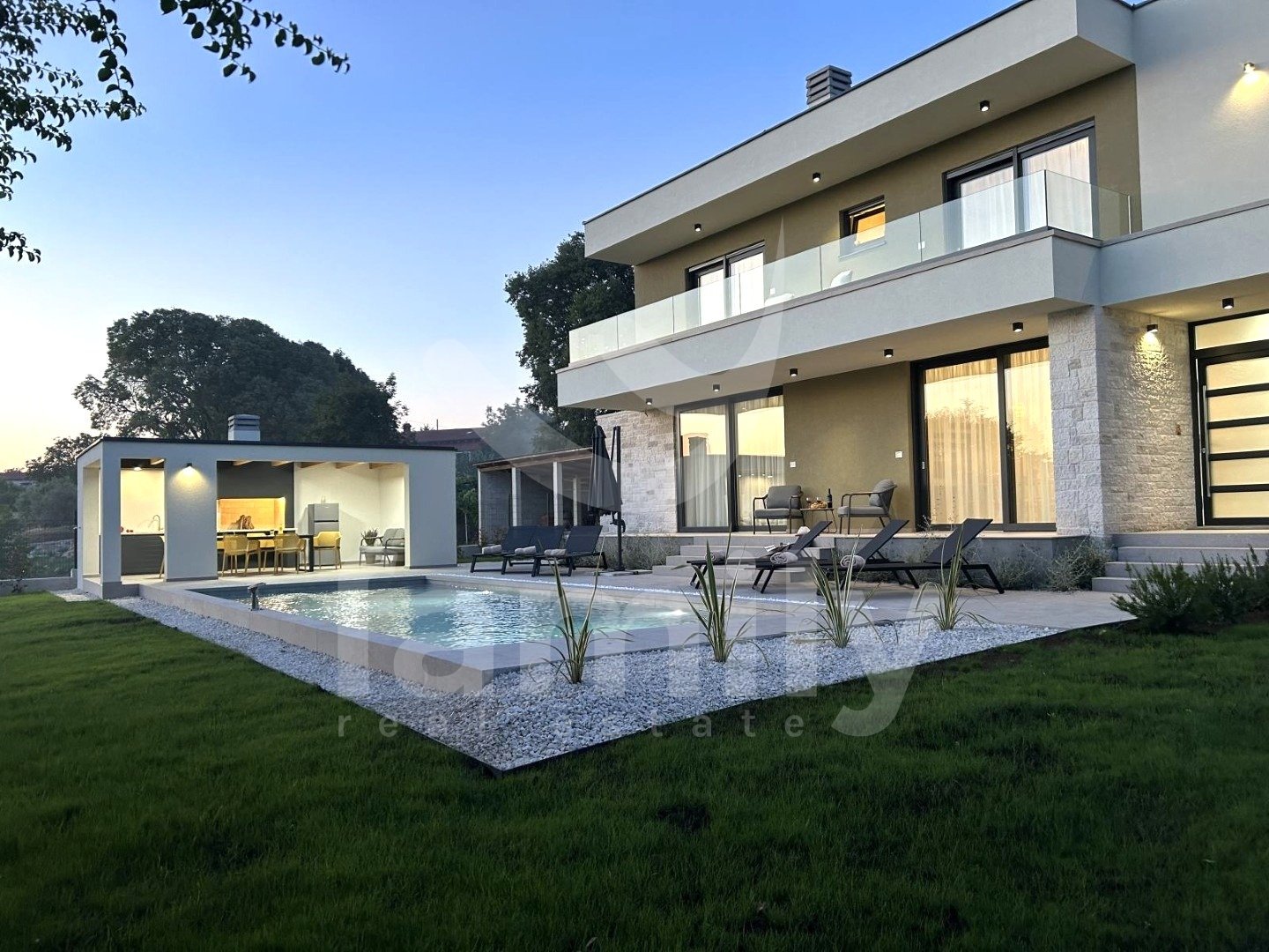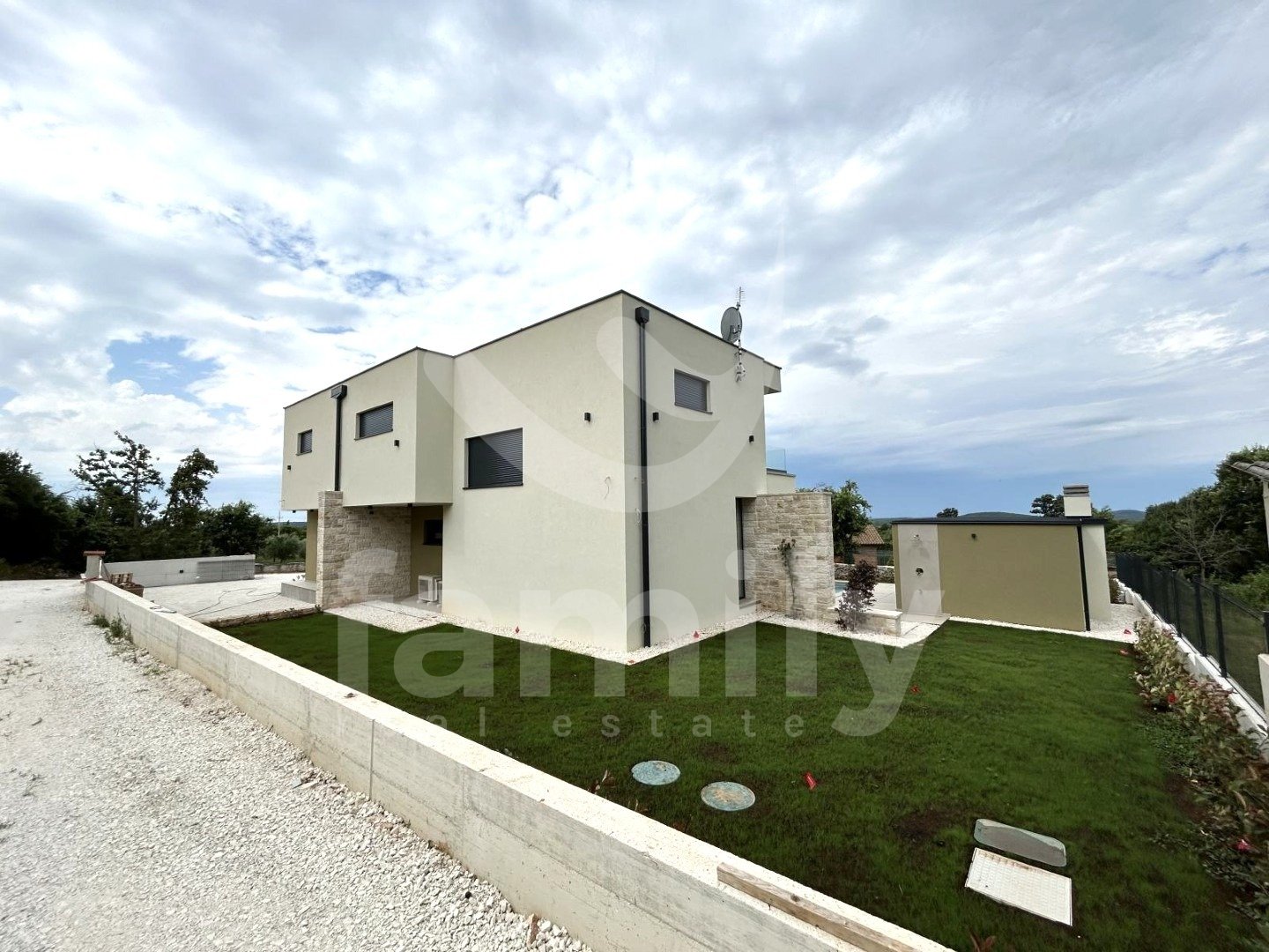 Vila s skupno površino 208 m2 je pozicionirana na jugozahodni strani na koncu urbaniziranega dela. Celotna parcela je obdana z zidom, vhodna vrata so električna, na dvorišču pa so tri parkirna mesta. Dvorišče je urejeno in vzdrževano z ljubeznijo, trata pa ima avtomatsko namakanje. Na zunanjem prostoru imamo pokrit pomožni objekt s kaminom za druženje in bivanje ter ogrevan bazen s skupno površino 40 m2. Garažno območje je prav tako ločeno. Hiša je izjemno lepo in moderno opremljena in se kot taka prodaja. Prvi vhodni prostor ima bivalni del z jedilnico, kuhinjo in straniščem za goste. V prvem nadstropju imamo tri spalnice s tremi kopalnicami in balkon s pogledom na zelenje in manjši del morja. Vila je izjemno lepo in moderno opremljena s kakovostnimi in sodobnimi materiali. Bivanje v omenjeni nepremičnini je zagotovo prijetno, saj ponuja svetel in sončen prostor z modernim videzom z lepim vrtom na idealni orientaciji z velikimi PVC odprtinami z električnimi polkni. Zagotovo prednost je večje število klimatskih naprav in sistem toplotne črpalke, ki je predviden v kotlovnici. Celotna vila ima talno ogrevanje. Predvideni so tudi sončni kolektorji.