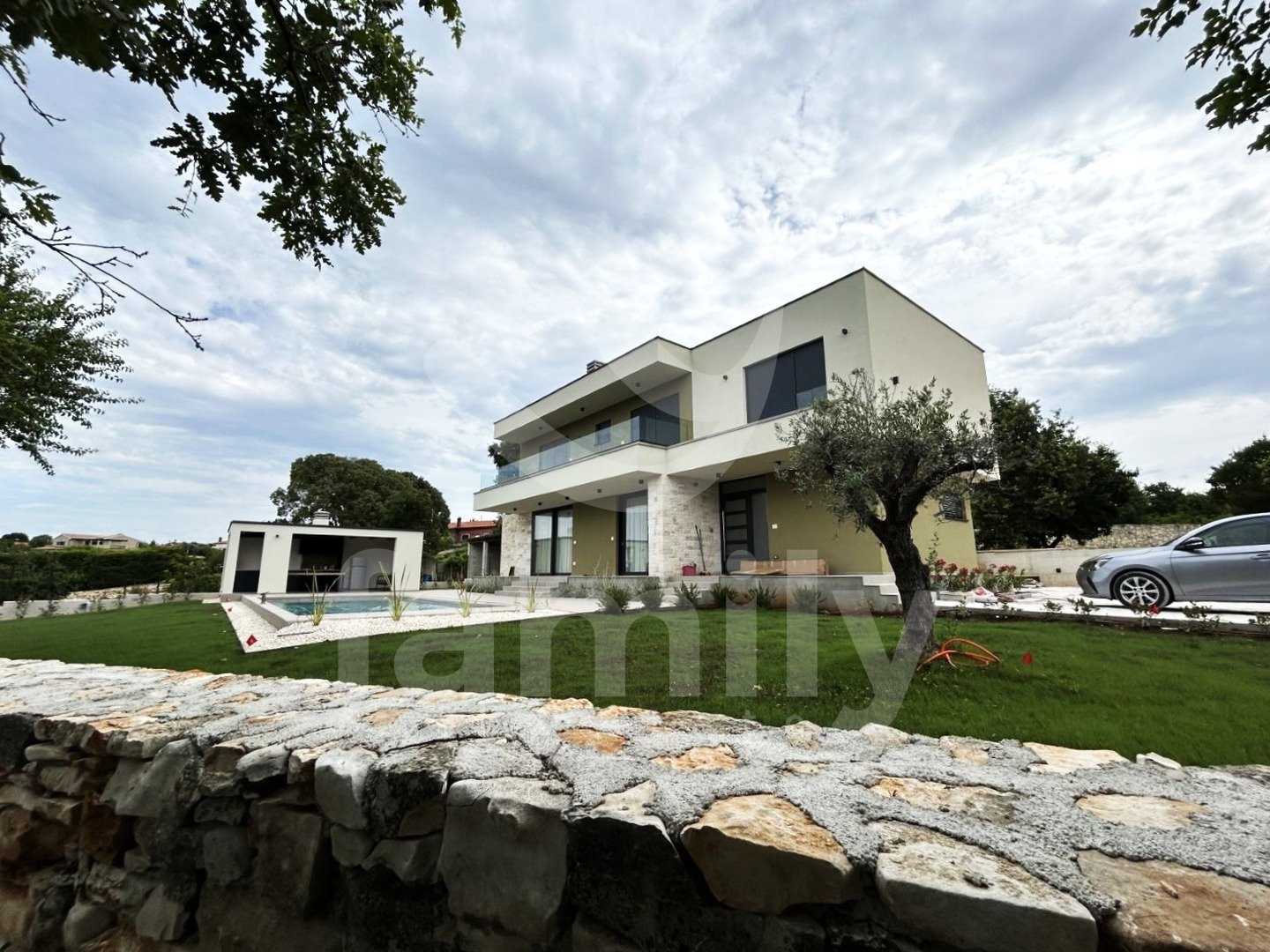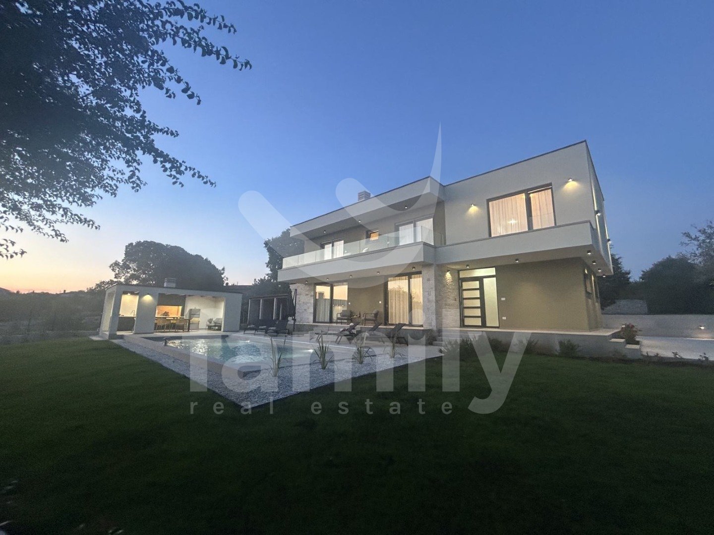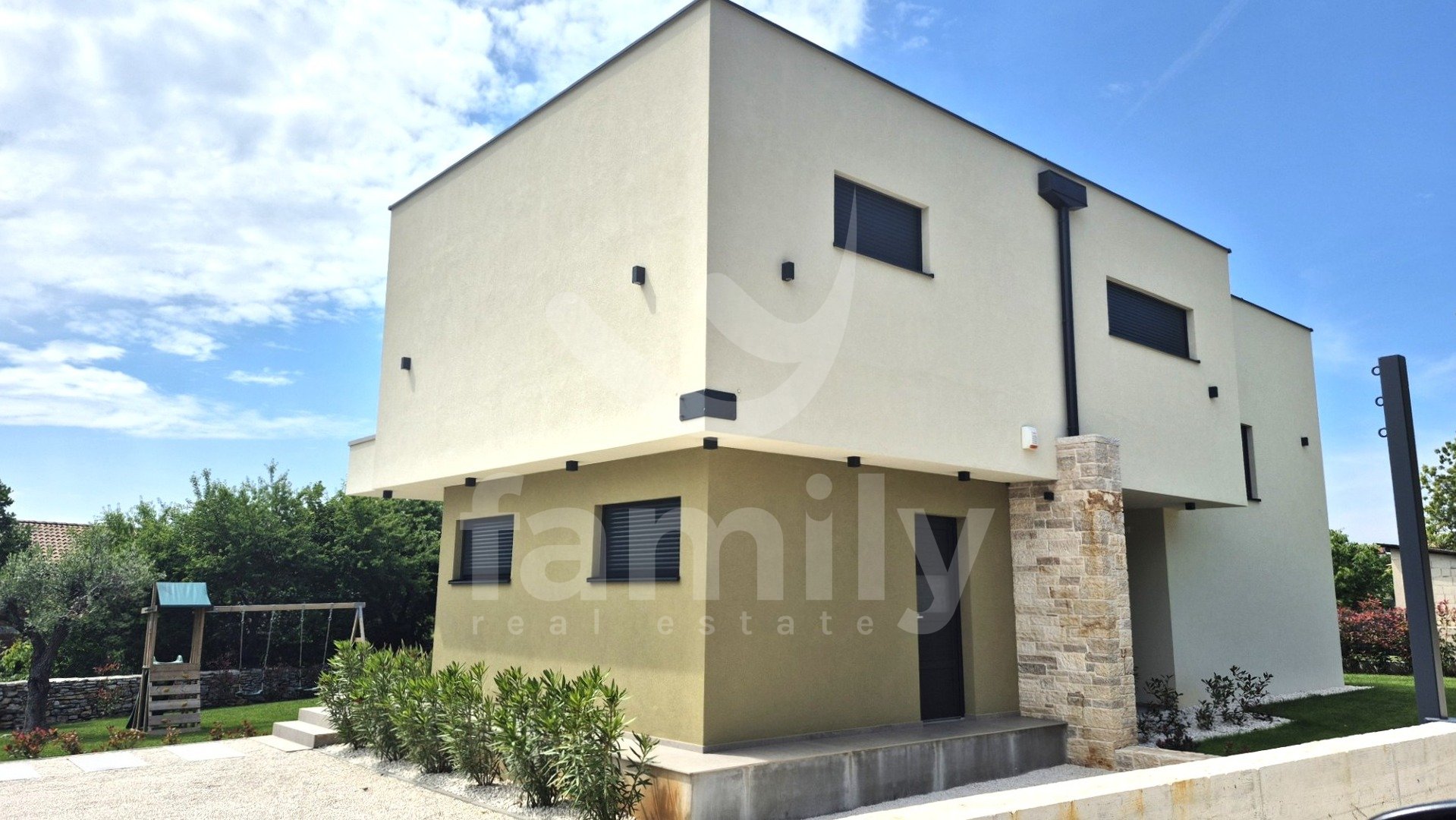 Vila s skupno površino 208 m2 je pozicionirana na jugozahodni strani na koncu urbaniziranega dela. Celotna parcela je obdana z zidom, vhodna vrata so električna, na dvorišču pa so tri parkirna mesta. Dvorišče je urejeno in vzdrževano z ljubeznijo, trata pa ima avtomatsko namakanje. Na zunanjem prostoru imamo pokrit pomožni objekt s kaminom za druženje in bivanje ter ogrevan bazen s skupno površino 40 m2. Garažno območje je prav tako ločeno. Hiša je izjemno lepo in moderno opremljena in se kot taka prodaja. Prvi vhodni prostor ima bivalni del z jedilnico, kuhinjo in straniščem za goste. V prvem nadstropju imamo tri spalnice s tremi kopalnicami in balkon s pogledom na zelenje in manjši del morja. Vila je izjemno lepo in moderno opremljena s kakovostnimi in sodobnimi materiali. Bivanje v omenjeni nepremičnini je zagotovo prijetno, saj ponuja svetel in sončen prostor z modernim videzom z lepim vrtom na idealni orientaciji z velikimi PVC odprtinami z električnimi polkni. Zagotovo prednost je večje število klimatskih naprav in sistem toplotne črpalke, ki je predviden v kotlovnici. Celotna vila ima talno ogrevanje. Predvideni so tudi sončni kolektorji.