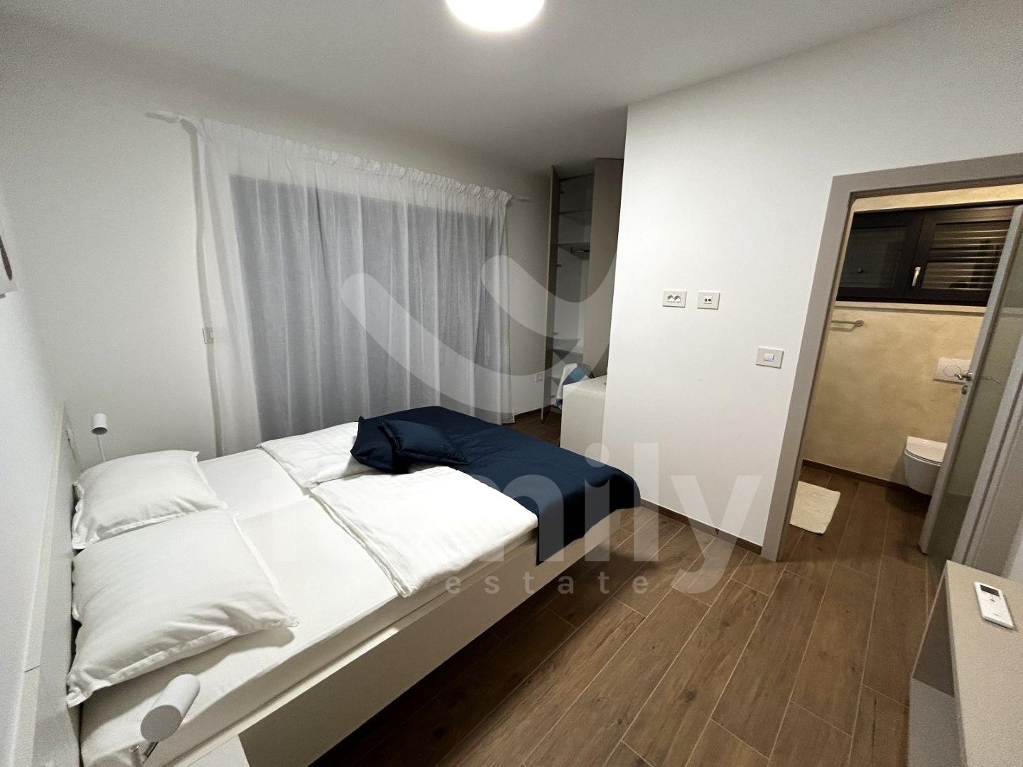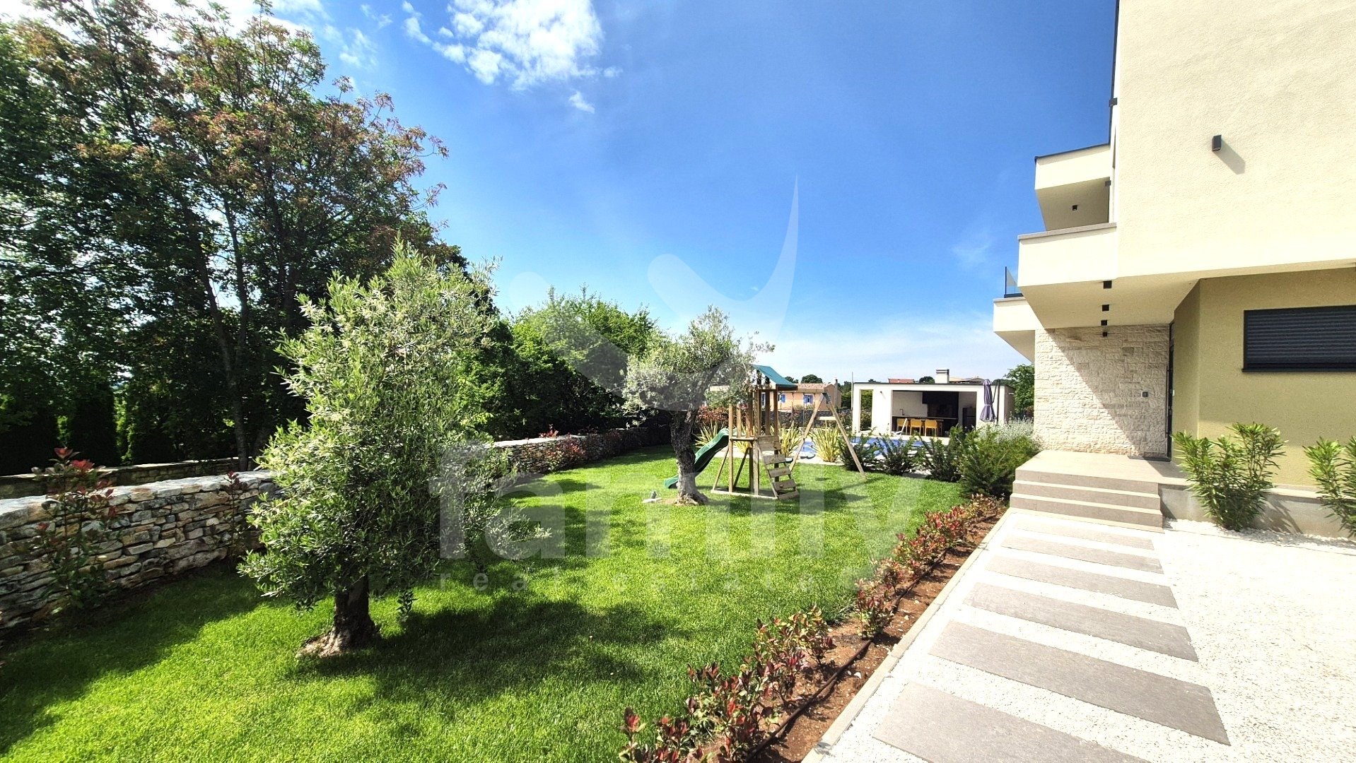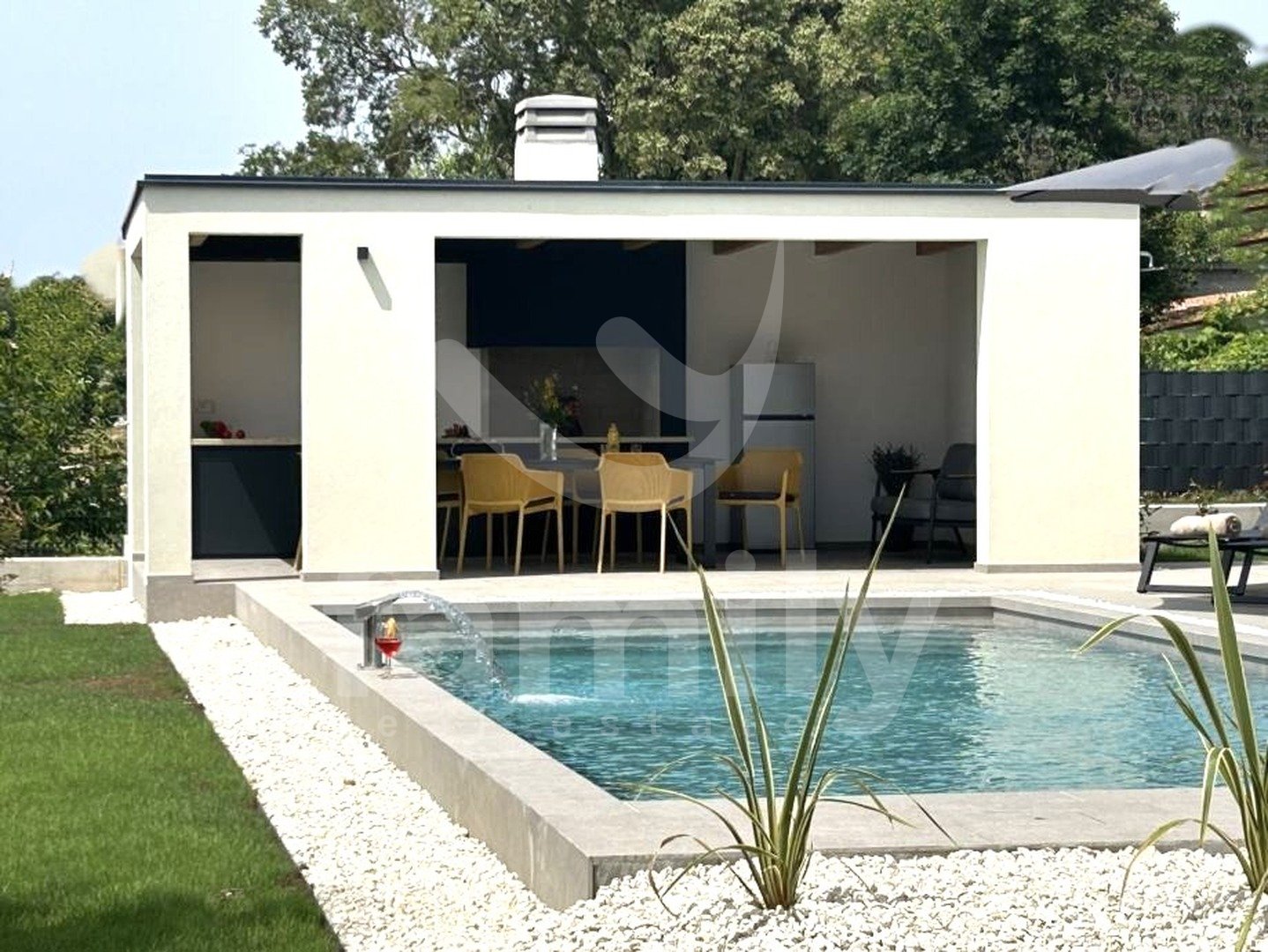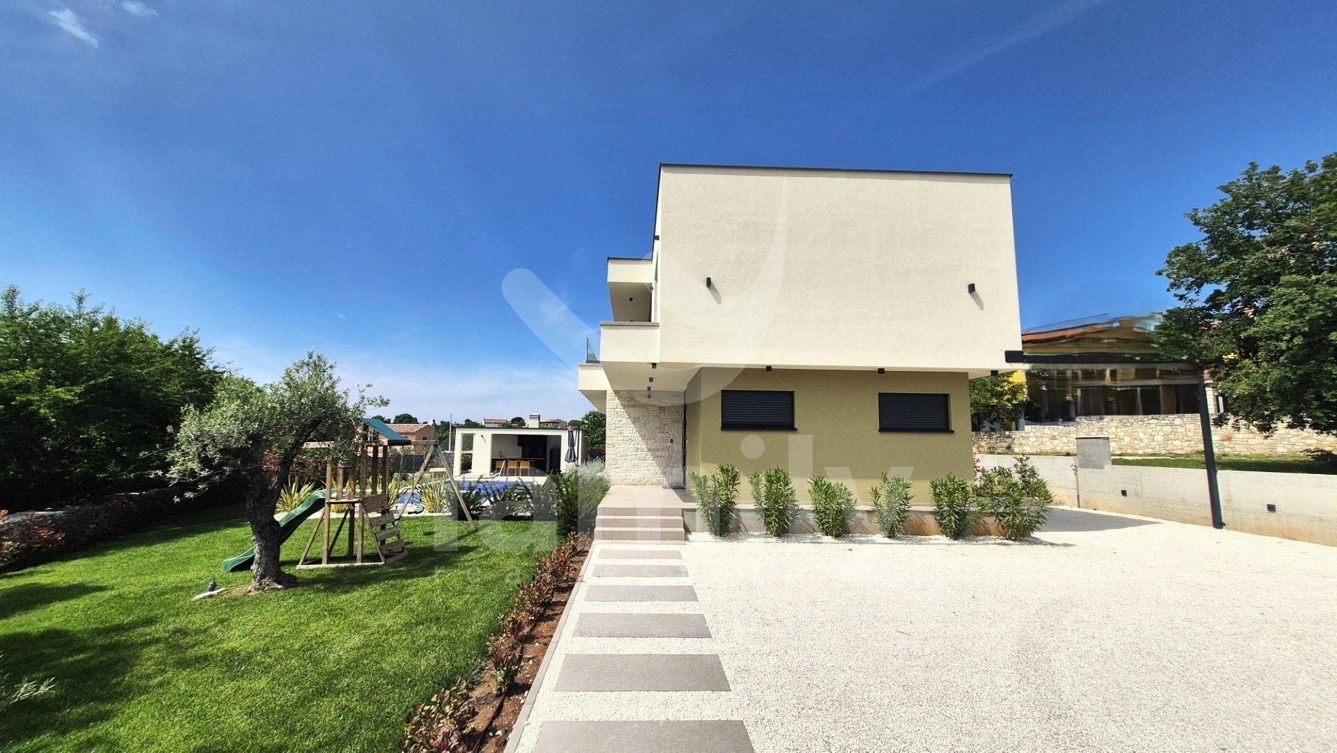 Vila s skupno površino 208 m2 je pozicionirana na jugozahodni strani na koncu urbaniziranega dela. Celotna parcela je obdana z zidom, vhodna vrata so električna, na dvorišču pa so tri parkirna mesta. Dvorišče je urejeno in vzdrževano z ljubeznijo, trata pa ima avtomatsko namakanje. Na zunanjem prostoru imamo pokrit pomožni objekt s kaminom za druženje in bivanje ter ogrevan bazen s skupno površino 40 m2. Garažno območje je prav tako ločeno. Hiša je izjemno lepo in moderno opremljena in se kot taka prodaja. Prvi vhodni prostor ima bivalni del z jedilnico, kuhinjo in straniščem za goste. V prvem nadstropju imamo tri spalnice s tremi kopalnicami in balkon s pogledom na zelenje in manjši del morja. Vila je izjemno lepo in moderno opremljena s kakovostnimi in sodobnimi materiali. Bivanje v omenjeni nepremičnini je zagotovo prijetno, saj ponuja svetel in sončen prostor z modernim videzom z lepim vrtom na idealni orientaciji z velikimi PVC odprtinami z električnimi polkni. Zagotovo prednost je večje število klimatskih naprav in sistem toplotne črpalke, ki je predviden v kotlovnici. Celotna vila ima talno ogrevanje. Predvideni so tudi sončni kolektorji.
