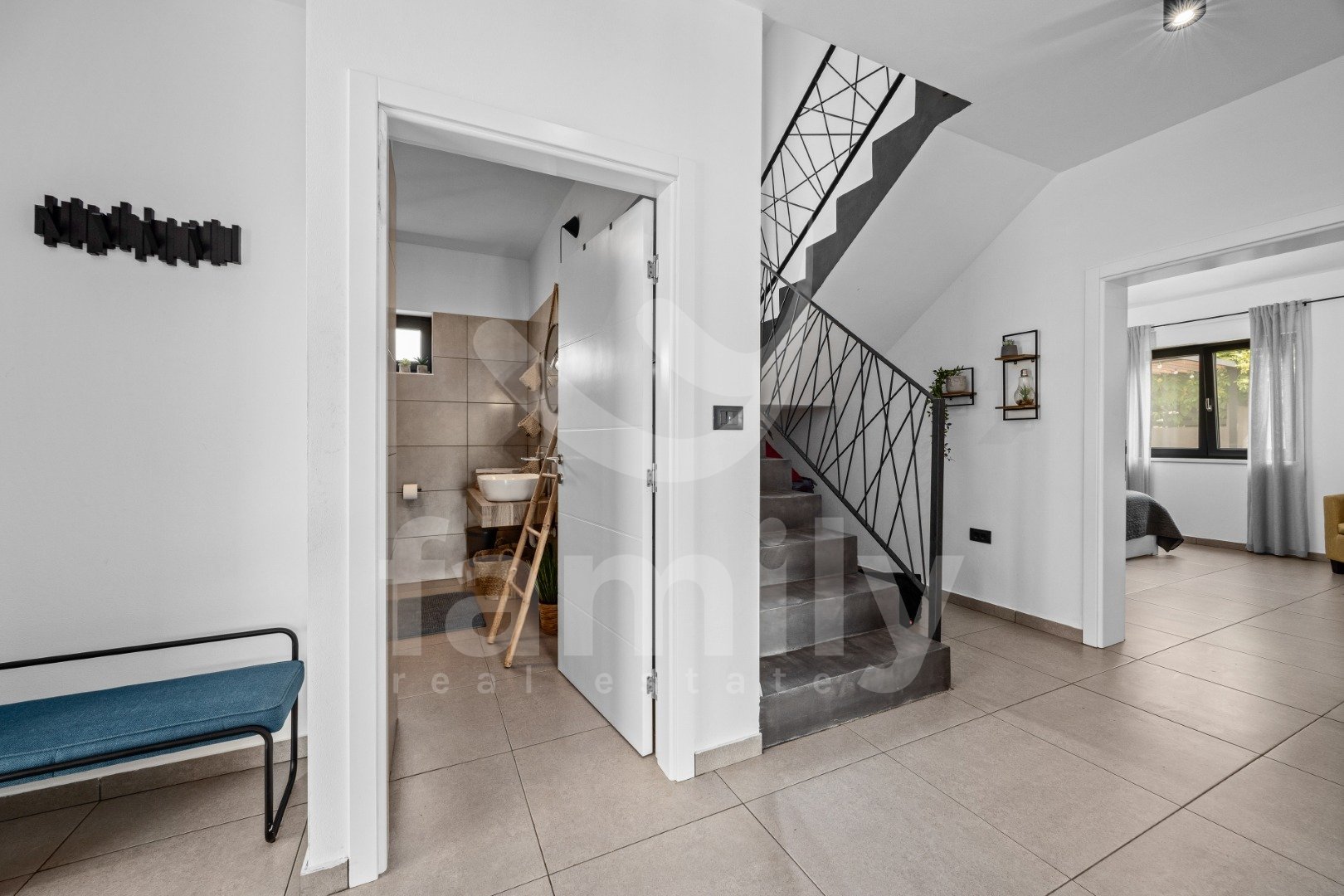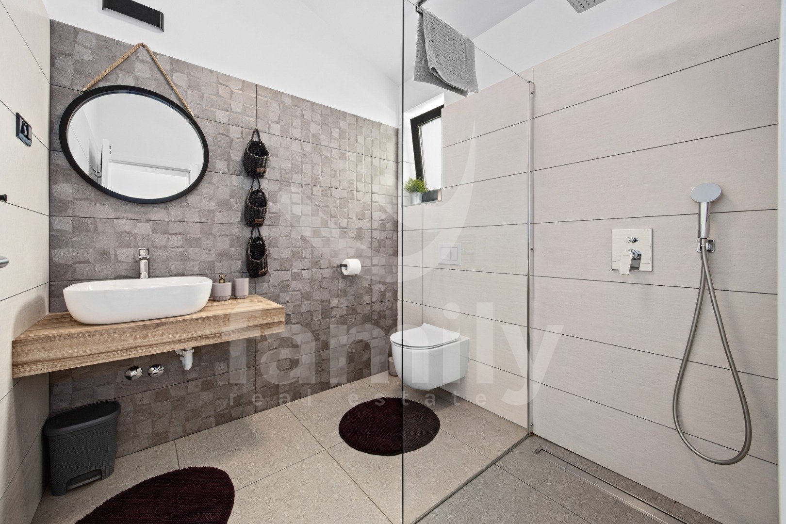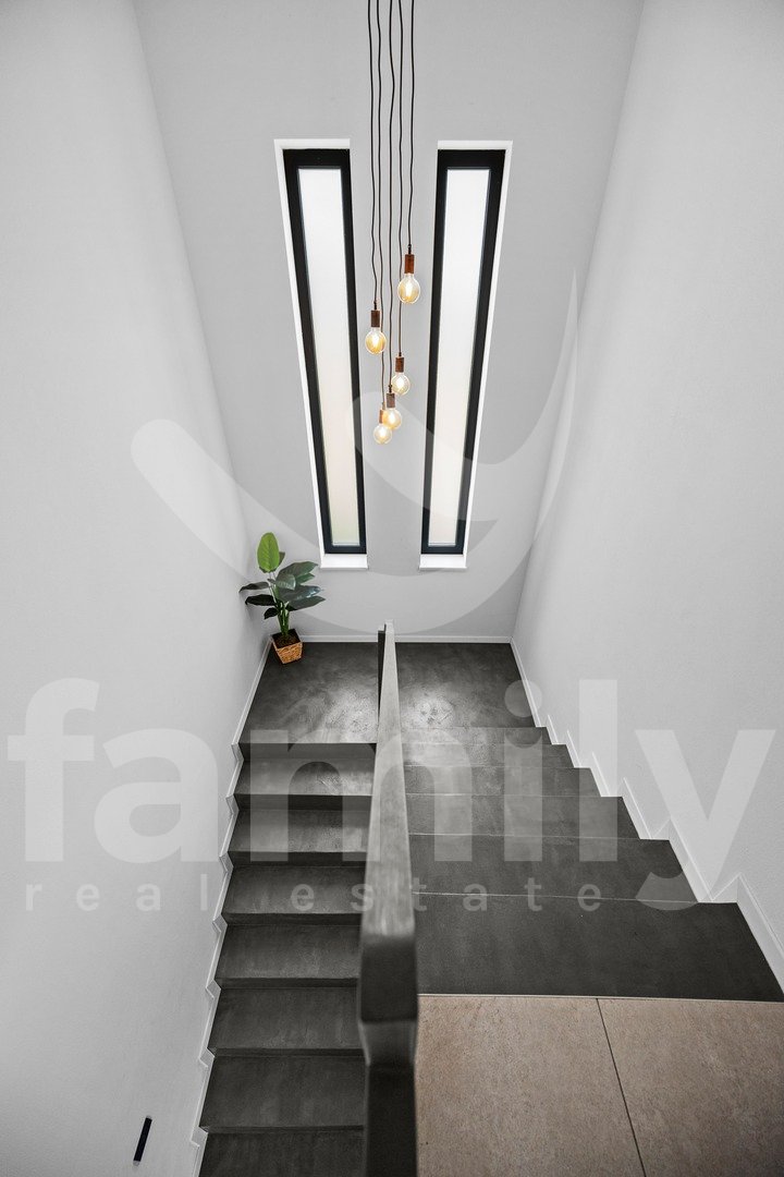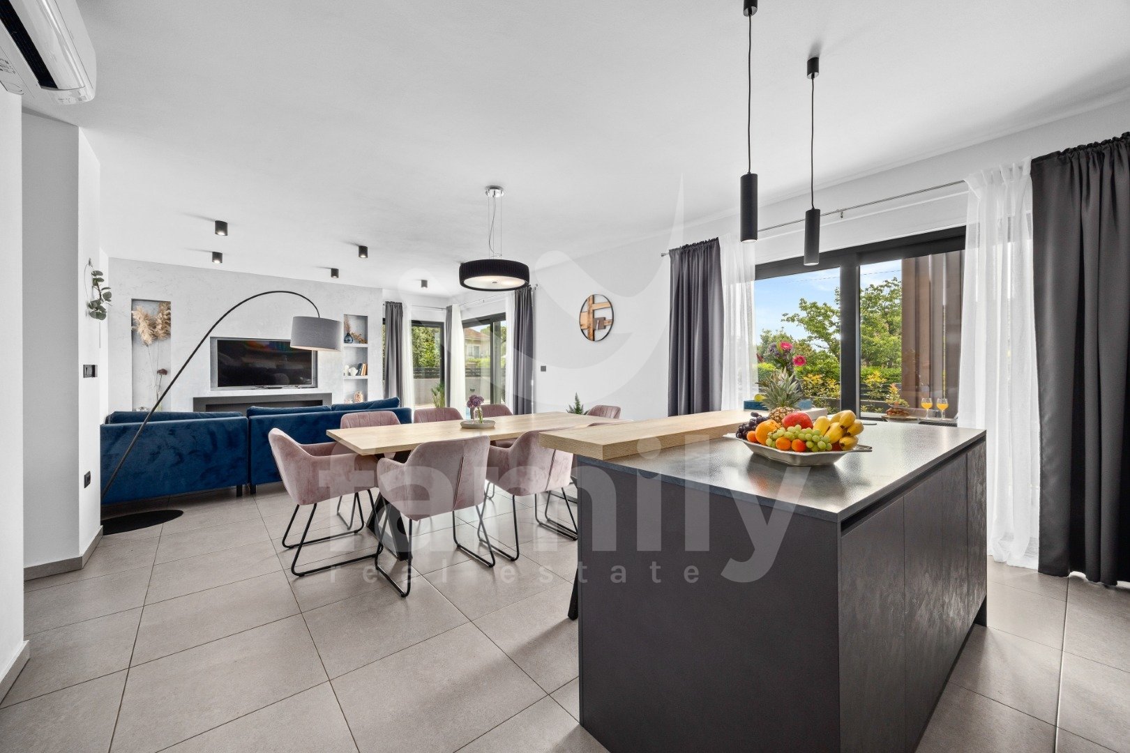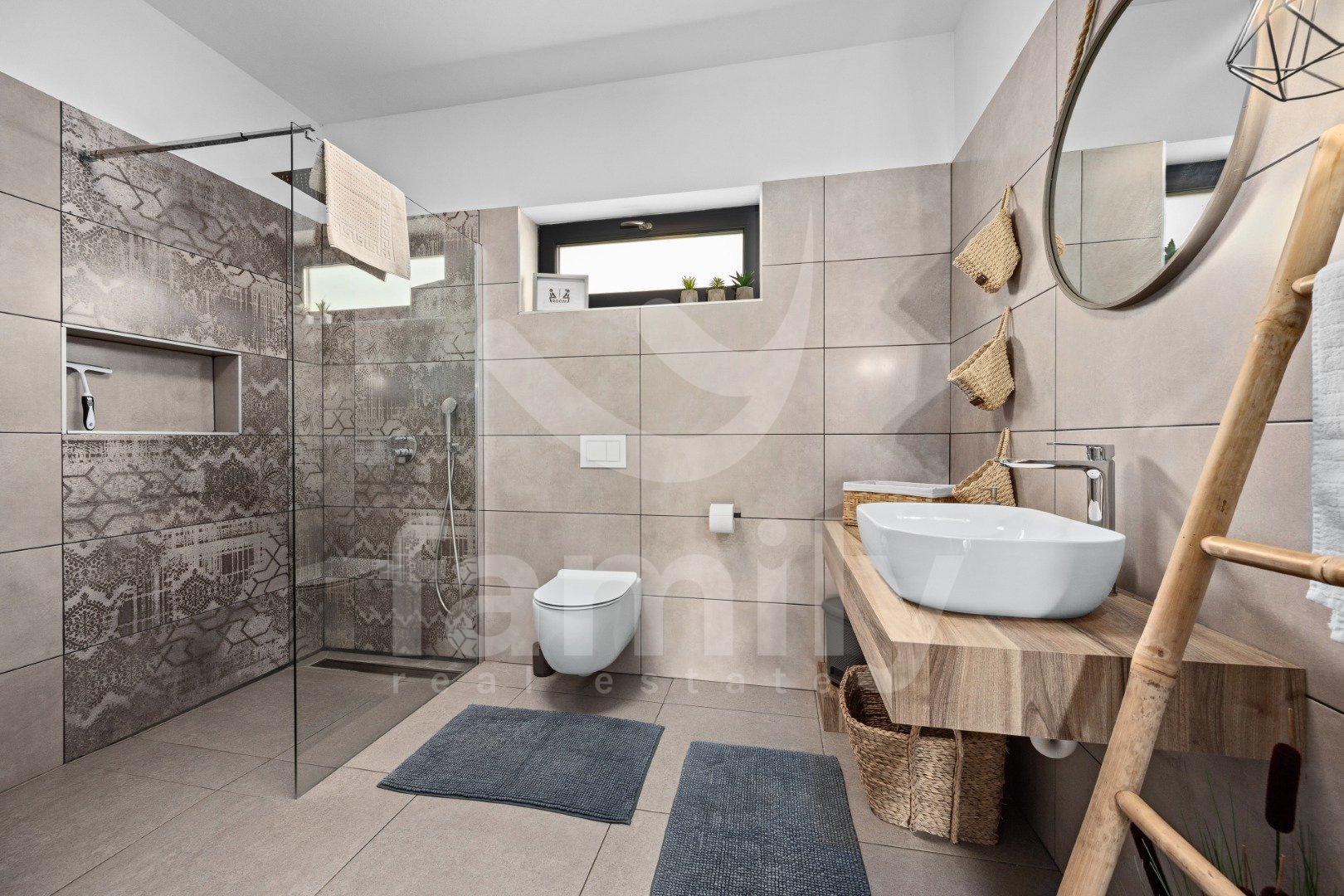 Vila s skupno bivalno površino 220 m2 se prodaja opremljena in opremljena z vsem, kar potrebujete za življenje ali za turizem. Vila je opremljena z modernim, lepim pohištvom s prostornimi sobami. Vhodni prostor je prostoren in vse sobe so povezane - jedilnica, dnevni prostor, ena spalnica in stranišče. Moderno stopnišče vodi v prvo nadstropje, ki je edino, ki nima vgrajenega talnega ogrevanja. V zgornjem nadstropju imamo tri prostorne spalnice z lastnimi kopalnicami in velikimi dnevnimi odprtinami z antracitno obarvanim aluminijastim pohištvom v vseh sobah. Vse sobe in kopalnice so lepo in dobro opremljene. Iz sob imamo dostop do zelo velike terase s skupno površino 80 m2, s katere lahko uživamo v čudovitem razgledu, medtem ko se sproščamo in počivamo. Terase so zelo lepe in v celoti prekrite z moderno keramiko. Celotna hiša je prekrita s keramiko, v sobah in kopalnicah pa je talno ogrevanje. Vse je odprtega tipa, bodisi v prvem nadstropju bodisi v pritličju, z velikimi drsnimi PVC vrati, ki vodijo na teraso, kjer imate na voljo tudi ločene prostore za sprostitev, del z žarom ob nepremičnini, pa tudi del, kjer je pokrit prostor za sprostitev in prostor za prehranjevanje. Celotno spodnje nadstropje je povezano z vhodnim prostorom, zunanjim prostorom in parkiriščem, kjer imamo ob prihodu v hišo 3 parkirna mesta.