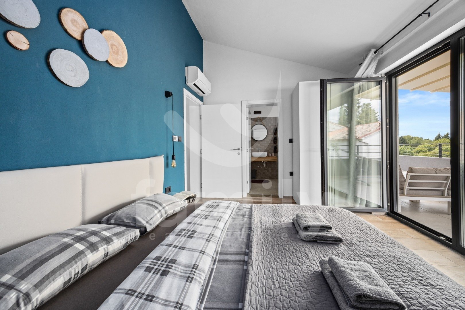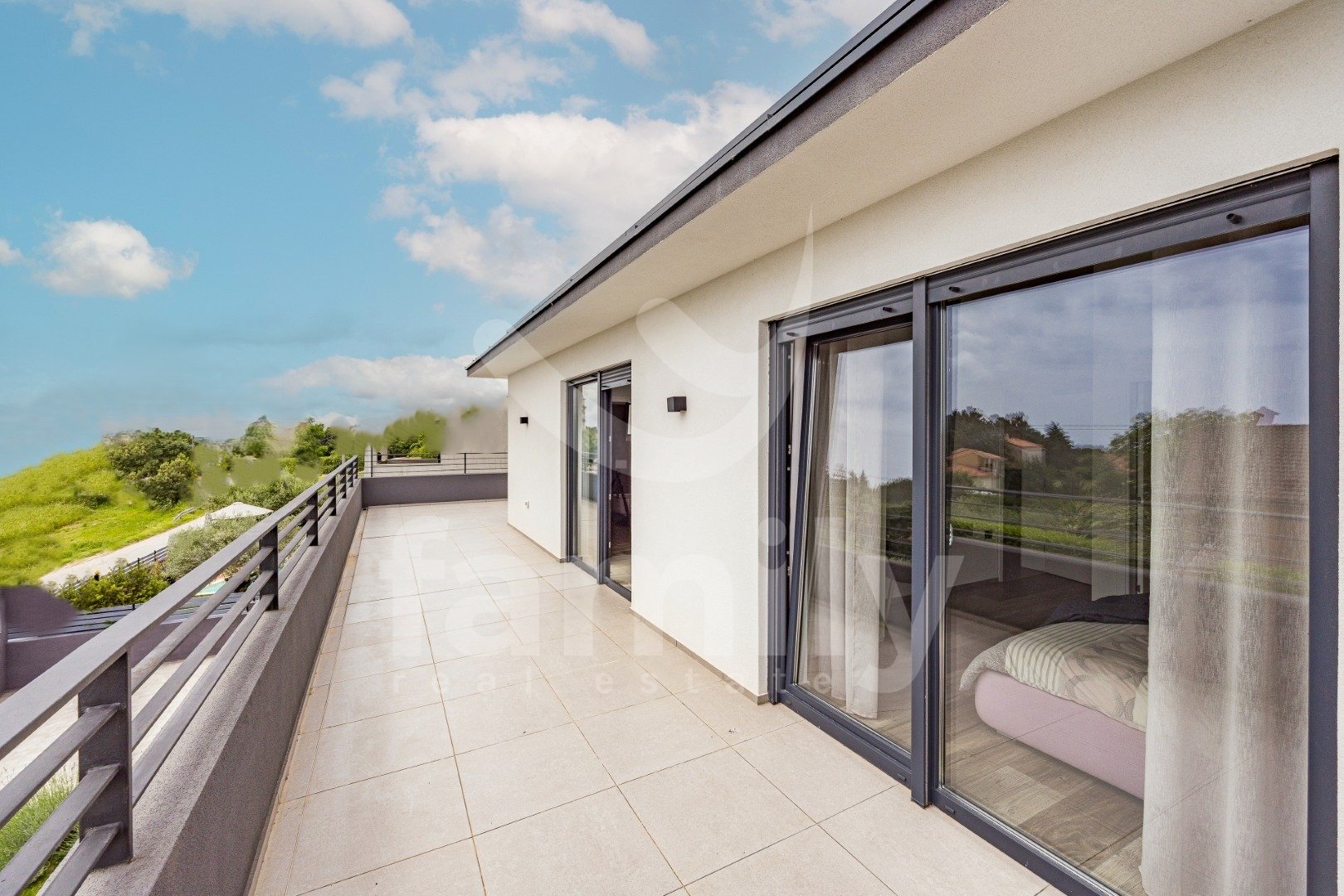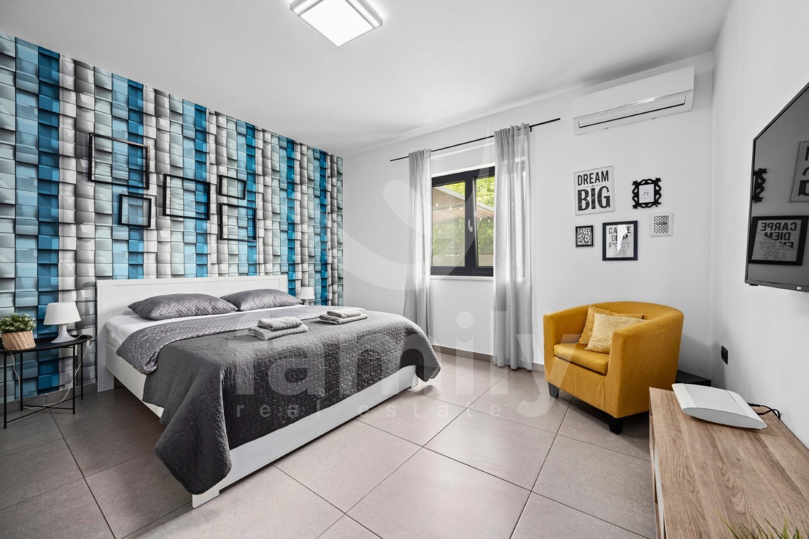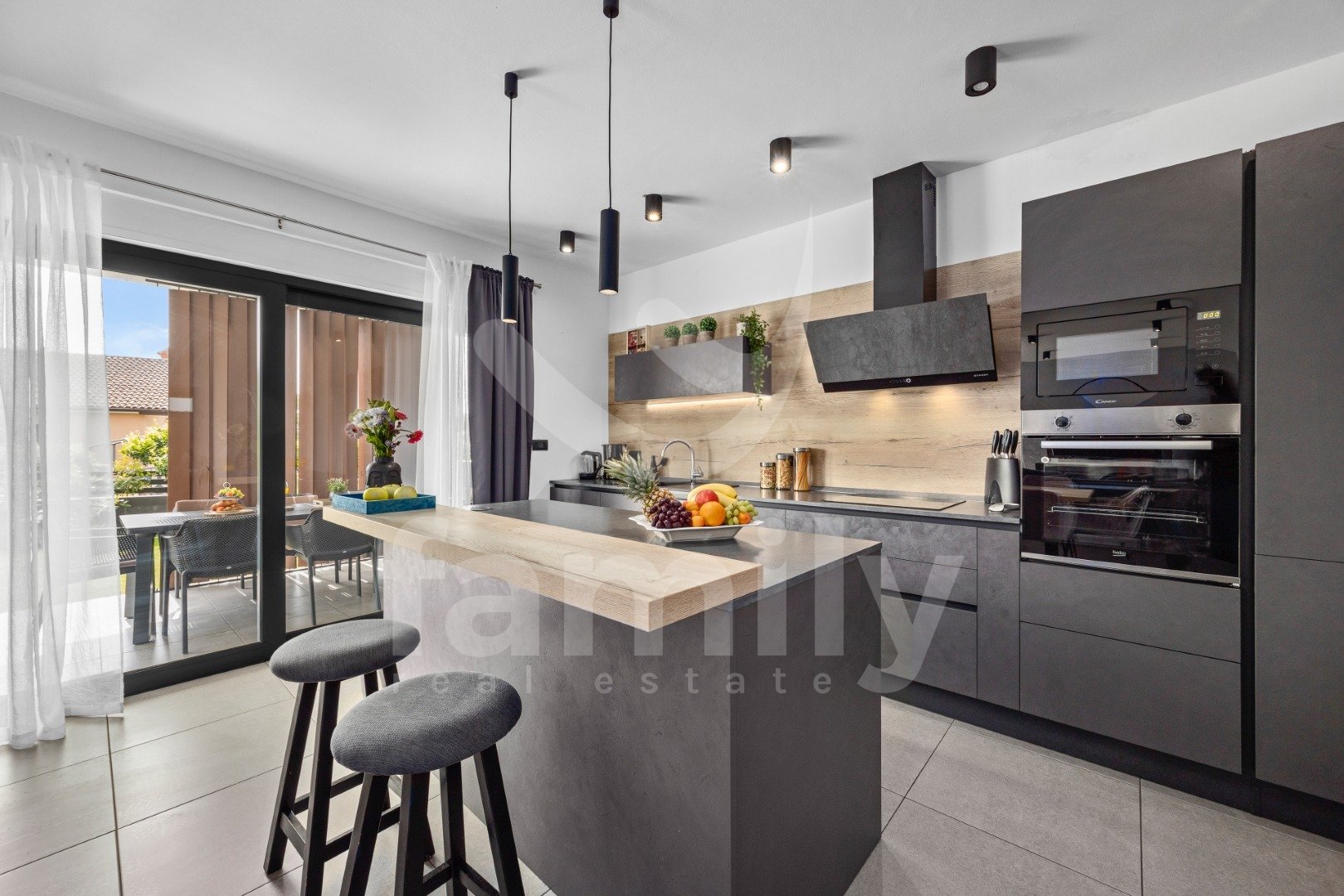 Vila s skupno bivalno površino 220 m2 se prodaja opremljena in opremljena z vsem, kar potrebujete za življenje ali za turizem. Vila je opremljena z modernim, lepim pohištvom s prostornimi sobami. Vhodni prostor je prostoren in vse sobe so povezane - jedilnica, dnevni prostor, ena spalnica in stranišče. Moderno stopnišče vodi v prvo nadstropje, ki je edino, ki nima vgrajenega talnega ogrevanja. V zgornjem nadstropju imamo tri prostorne spalnice z lastnimi kopalnicami in velikimi dnevnimi odprtinami z antracitno obarvanim aluminijastim pohištvom v vseh sobah. Vse sobe in kopalnice so lepo in dobro opremljene. Iz sob imamo dostop do zelo velike terase s skupno površino 80 m2, s katere lahko uživamo v čudovitem razgledu, medtem ko se sproščamo in počivamo. Terase so zelo lepe in v celoti prekrite z moderno keramiko. Celotna hiša je prekrita s keramiko, v sobah in kopalnicah pa je talno ogrevanje. Vse je odprtega tipa, bodisi v prvem nadstropju bodisi v pritličju, z velikimi drsnimi PVC vrati, ki vodijo na teraso, kjer imate na voljo tudi ločene prostore za sprostitev, del z žarom ob nepremičnini, pa tudi del, kjer je pokrit prostor za sprostitev in prostor za prehranjevanje. Celotno spodnje nadstropje je povezano z vhodnim prostorom, zunanjim prostorom in parkiriščem, kjer imamo ob prihodu v hišo 3 parkirna mesta.