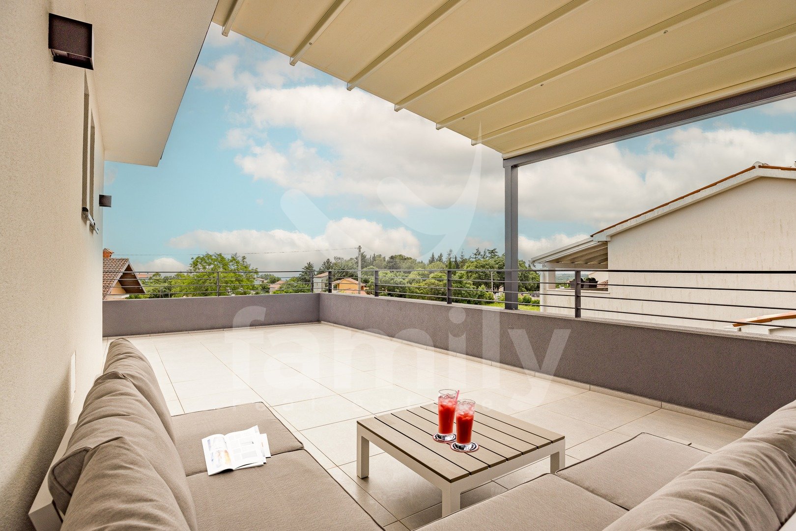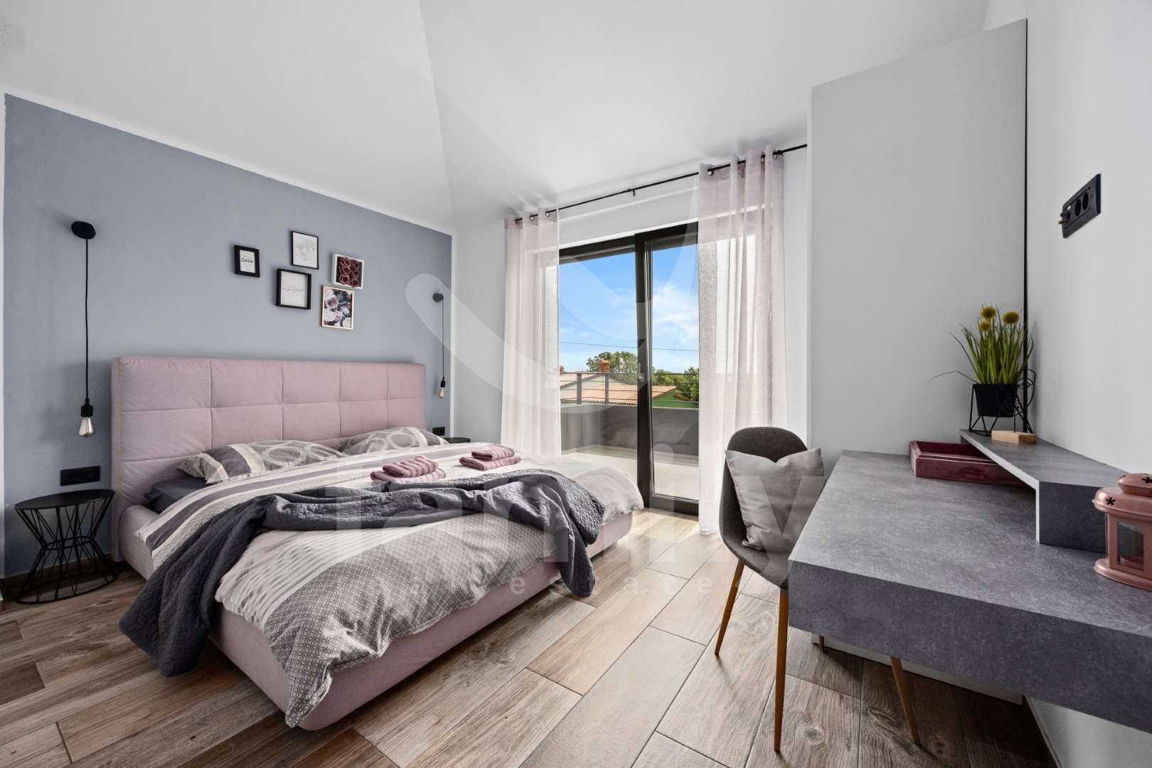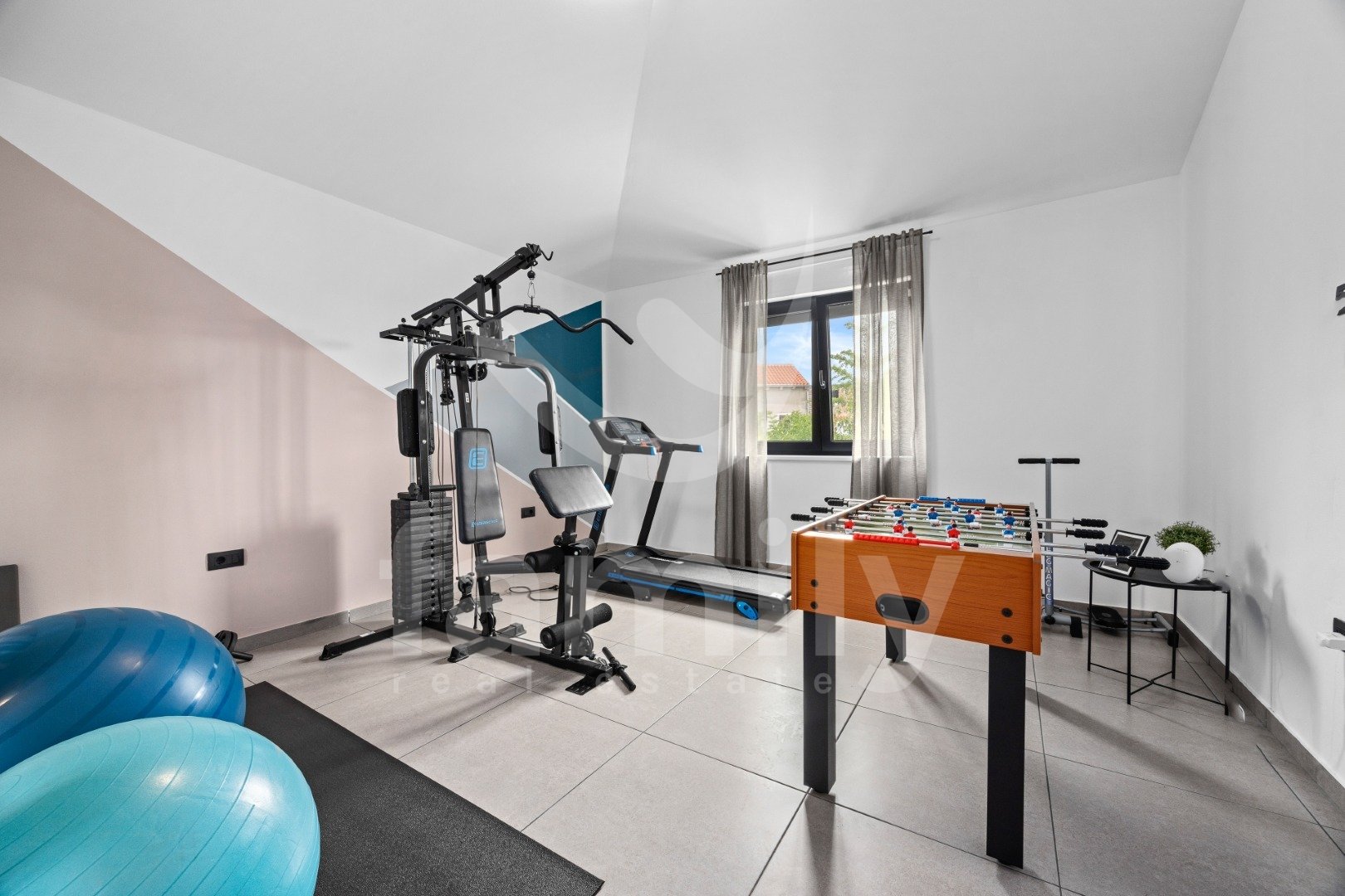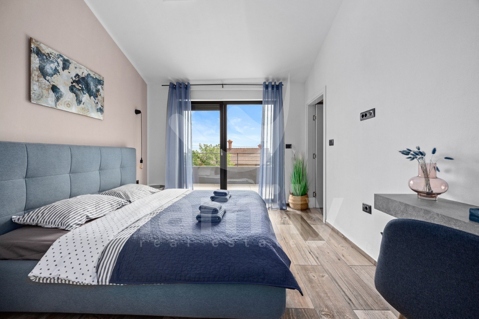 Vila s skupno bivalno površino 220 m2 se prodaja opremljena in opremljena z vsem, kar potrebujete za življenje ali za turizem. Vila je opremljena z modernim, lepim pohištvom s prostornimi sobami. Vhodni prostor je prostoren in vse sobe so povezane - jedilnica, dnevni prostor, ena spalnica in stranišče. Moderno stopnišče vodi v prvo nadstropje, ki je edino, ki nima vgrajenega talnega ogrevanja. V zgornjem nadstropju imamo tri prostorne spalnice z lastnimi kopalnicami in velikimi dnevnimi odprtinami z antracitno obarvanim aluminijastim pohištvom v vseh sobah. Vse sobe in kopalnice so lepo in dobro opremljene. Iz sob imamo dostop do zelo velike terase s skupno površino 80 m2, s katere lahko uživamo v čudovitem razgledu, medtem ko se sproščamo in počivamo. Terase so zelo lepe in v celoti prekrite z moderno keramiko. Celotna hiša je prekrita s keramiko, v sobah in kopalnicah pa je talno ogrevanje. Vse je odprtega tipa, bodisi v prvem nadstropju bodisi v pritličju, z velikimi drsnimi PVC vrati, ki vodijo na teraso, kjer imate na voljo tudi ločene prostore za sprostitev, del z žarom ob nepremičnini, pa tudi del, kjer je pokrit prostor za sprostitev in prostor za prehranjevanje. Celotno spodnje nadstropje je povezano z vhodnim prostorom, zunanjim prostorom in parkiriščem, kjer imamo ob prihodu v hišo 3 parkirna mesta.