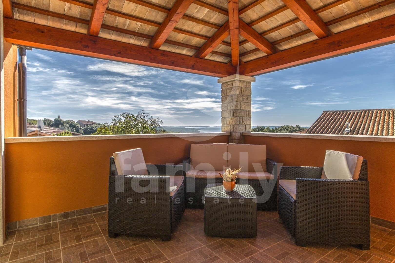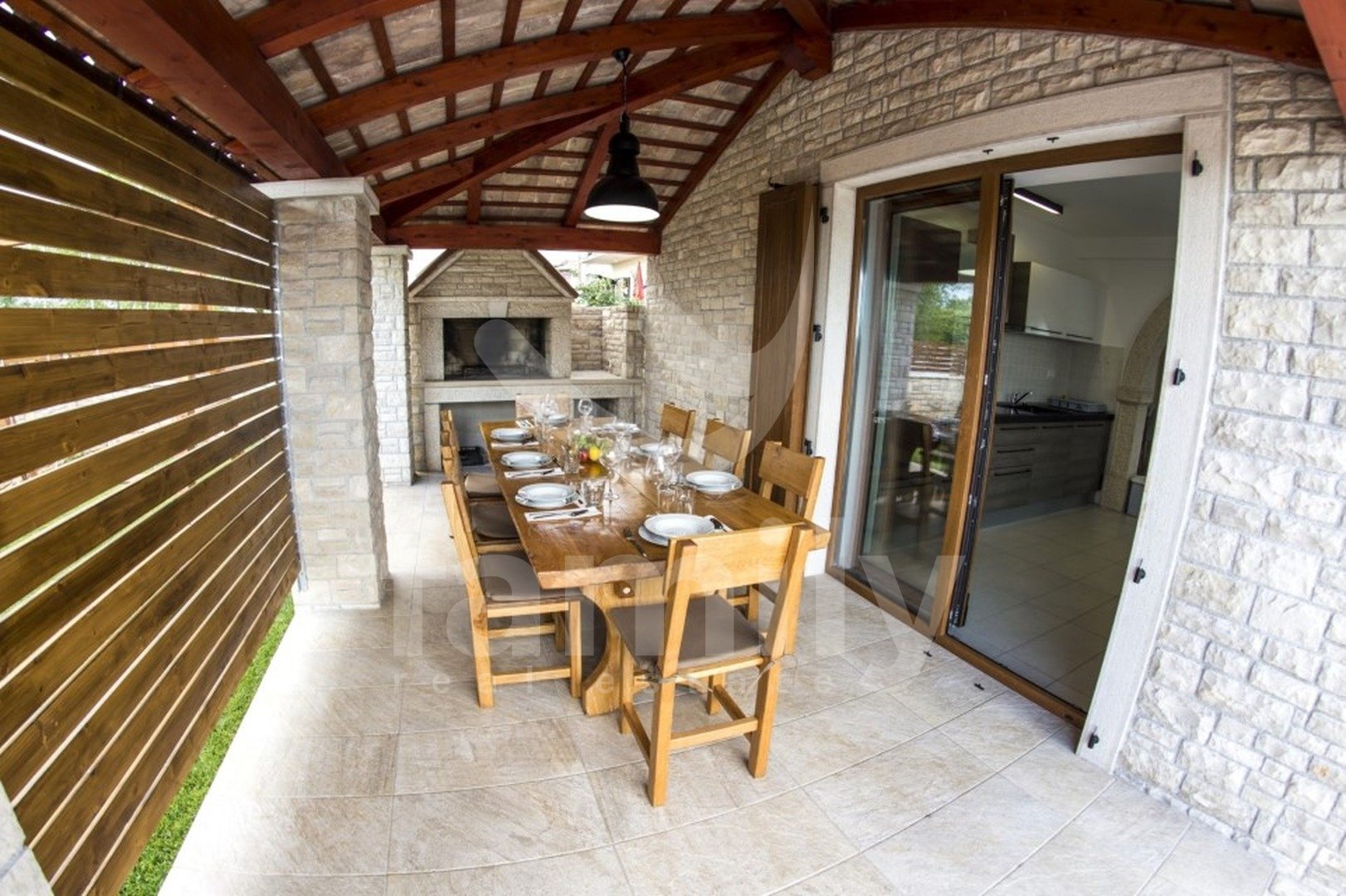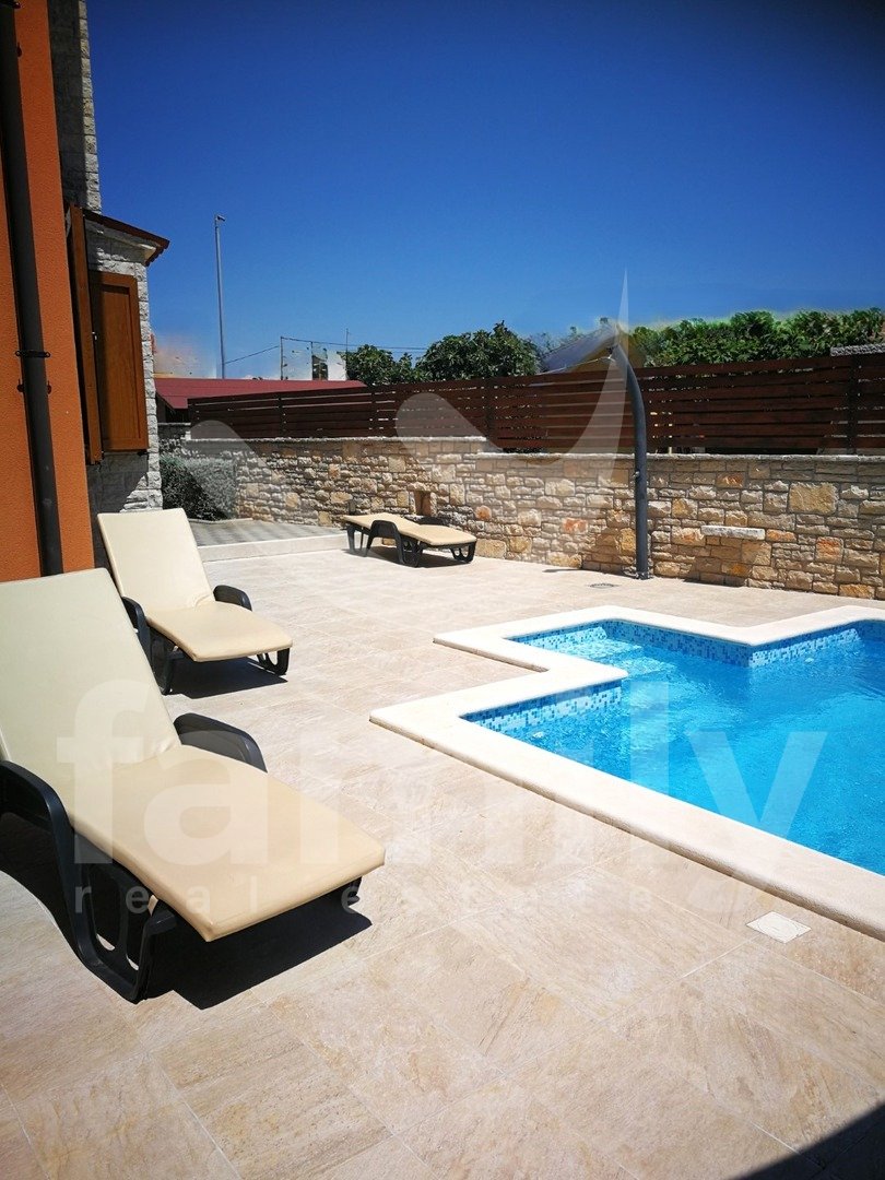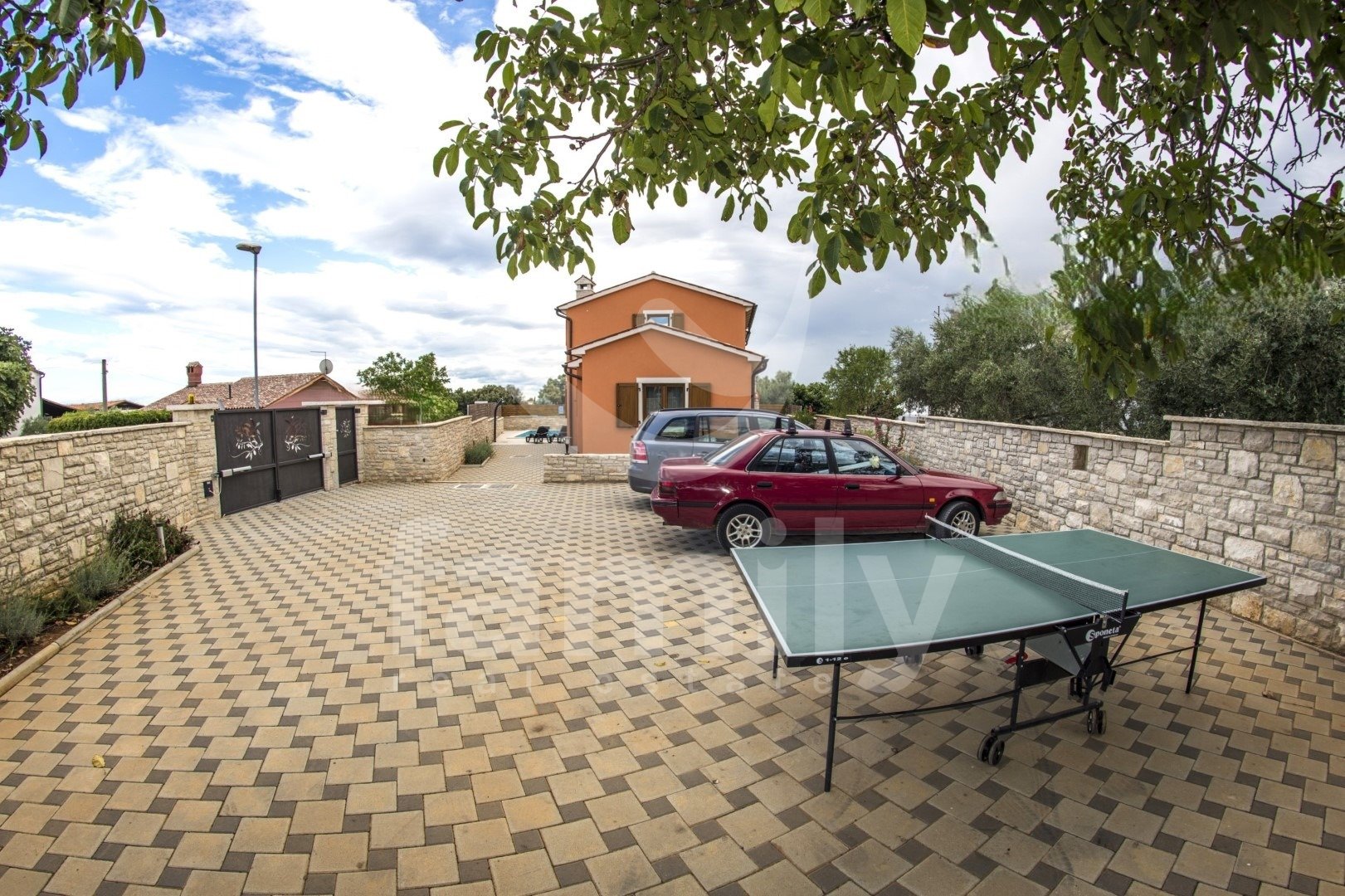 Nedaleč od središča Vodnjana in morja, v mirni vasici Barbariga, se nahaja ta kakovostna družinska hiša z bivalno površino 196 m2 in vrtom velikosti 460 m2. Hiša se razprostira na dveh nadstropjih, v pritličju se nahaja vhodna dvorana, stranišče za goste, prostorna in svetla dnevna soba z jedilnico in kuhinjo, skozi katero je dostop do terase, tlakovane s kamnom in opremljene z zunanjim vgradnim kaminom z istrsko jamo in jedilno mizo za 6 oseb, kurilnico, bazenom s prostorom za sončenje in zunanjim tušem. Drugo nadstropje oziroma prvo nadstropje sestavljajo tri udobne spalnice, vsaka s svojo kopalnico, pri čemer imata dve spalnici dostop do terase s čudovitim razgledom na morje. Hiša je opremljena s PVC stavbnim pohištvom, tla so prekrita s kakovostnim parketom in keramiko, medtem ko je sistem ogrevanja in hlajenja v celotni stavbi reguliran s 4 klimatskimi napravami. Nepremičnina je opremljena tudi s solarnim ogrevanjem, ki zagotavlja toplo vodo za 500-litrski bojler. Parkirna mesta so zagotovljena v nadstrešku z dvema pokritima parkirnima mestoma, medtem ko sta dve dodatni parkirni mesti na voljo v nepokritem delu.