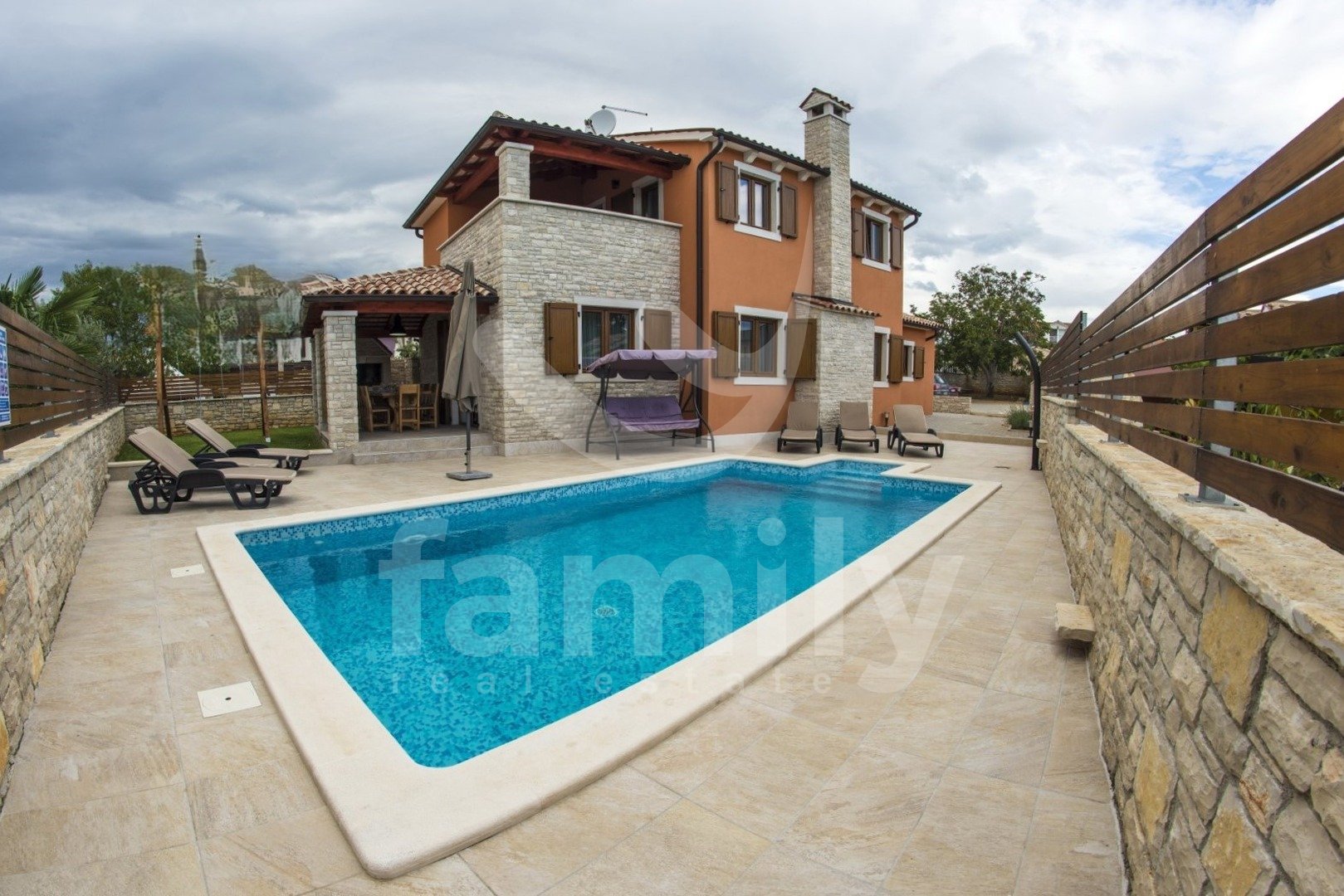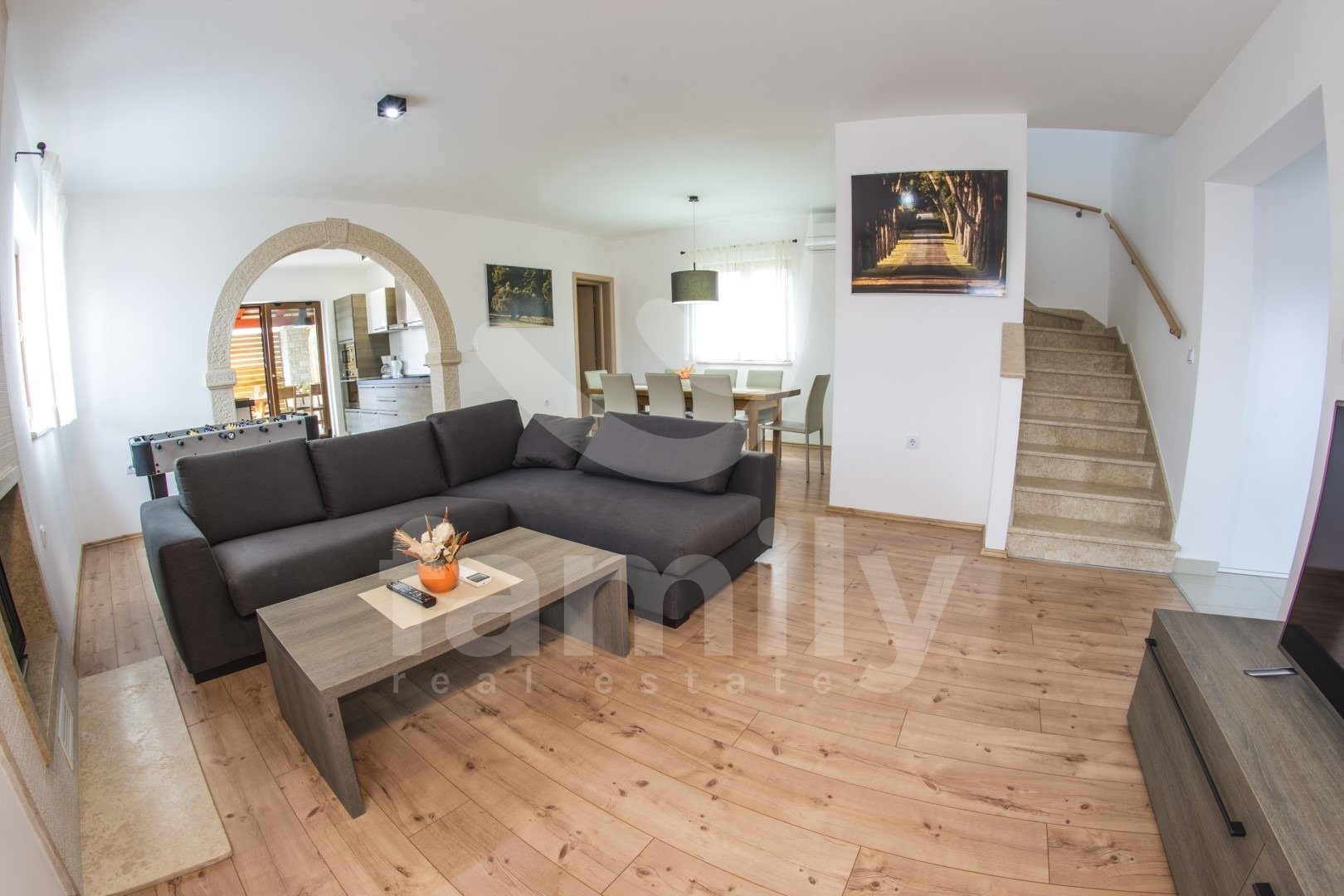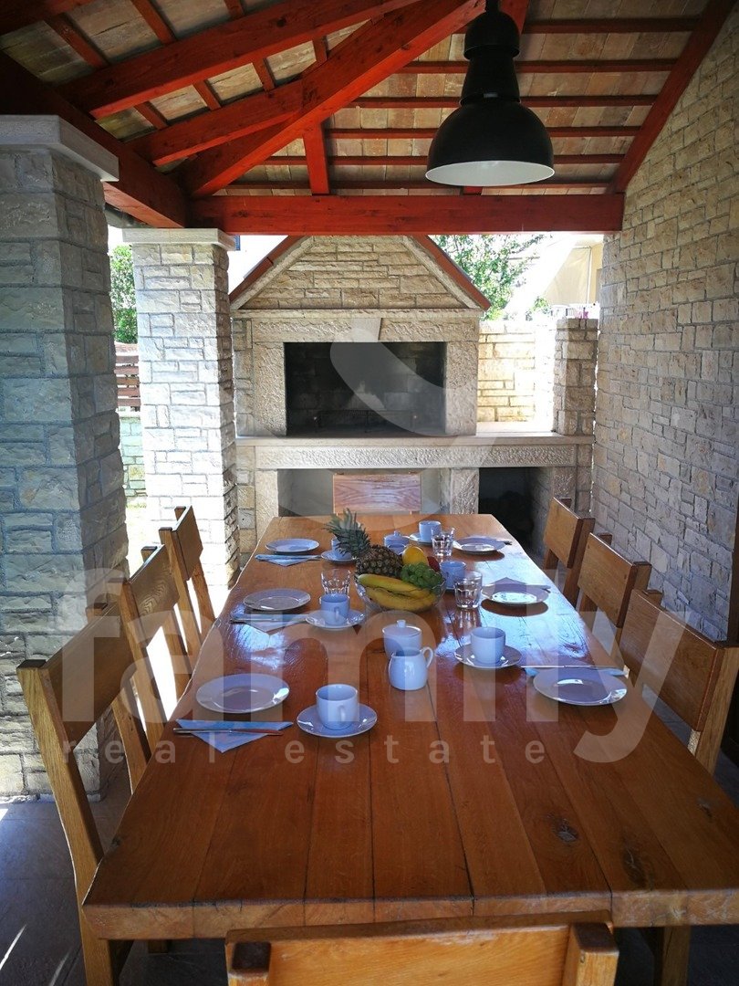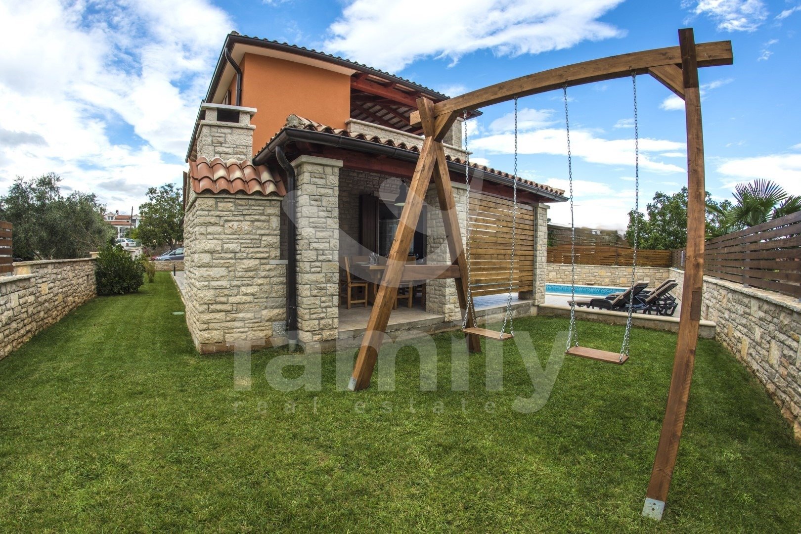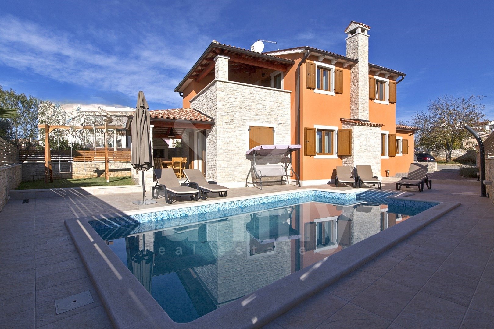 Nedaleč od središča Vodnjana in morja, v mirni vasici Barbariga, se nahaja ta kakovostna družinska hiša z bivalno površino 196 m2 in vrtom velikosti 460 m2. Hiša se razprostira na dveh nadstropjih, v pritličju se nahaja vhodna dvorana, stranišče za goste, prostorna in svetla dnevna soba z jedilnico in kuhinjo, skozi katero je dostop do terase, tlakovane s kamnom in opremljene z zunanjim vgradnim kaminom z istrsko jamo in jedilno mizo za 6 oseb, kurilnico, bazenom s prostorom za sončenje in zunanjim tušem. Drugo nadstropje oziroma prvo nadstropje sestavljajo tri udobne spalnice, vsaka s svojo kopalnico, pri čemer imata dve spalnici dostop do terase s čudovitim razgledom na morje. Hiša je opremljena s PVC stavbnim pohištvom, tla so prekrita s kakovostnim parketom in keramiko, medtem ko je sistem ogrevanja in hlajenja v celotni stavbi reguliran s 4 klimatskimi napravami. Nepremičnina je opremljena tudi s solarnim ogrevanjem, ki zagotavlja toplo vodo za 500-litrski bojler. Parkirna mesta so zagotovljena v nadstrešku z dvema pokritima parkirnima mestoma, medtem ko sta dve dodatni parkirni mesti na voljo v nepokritem delu.