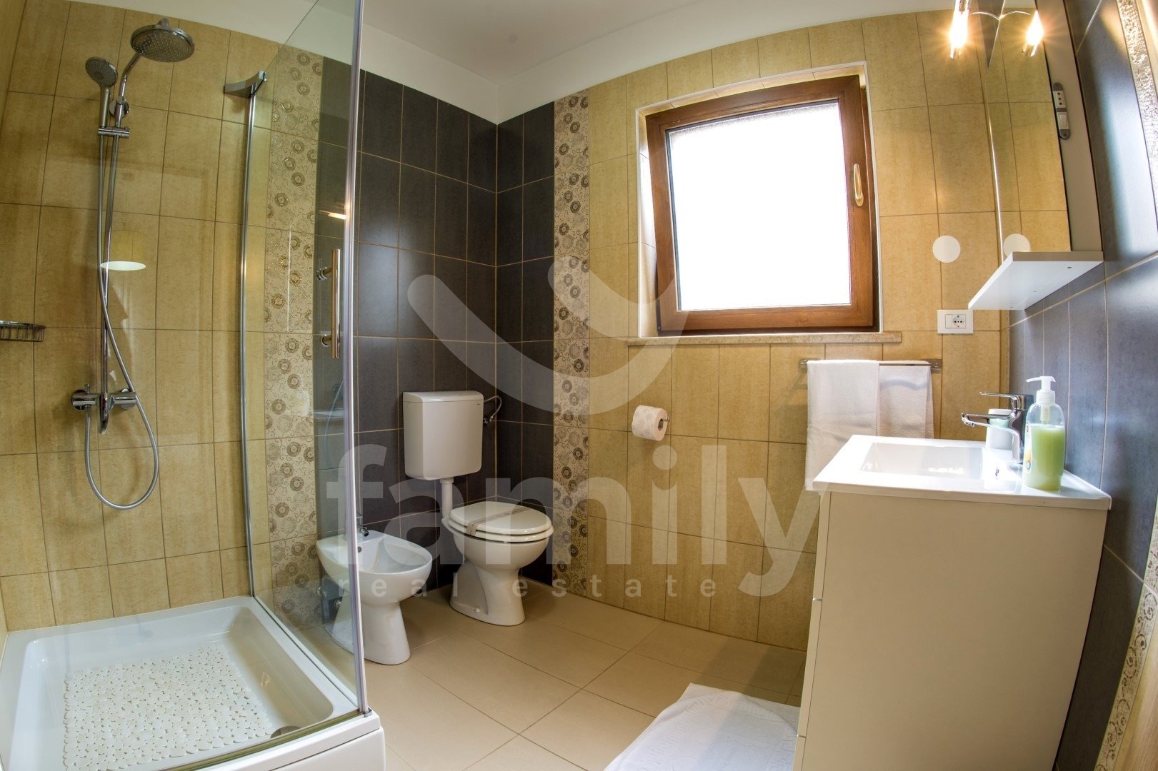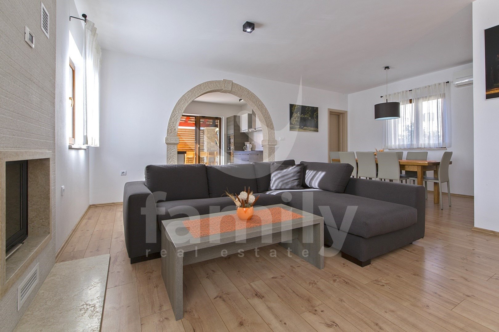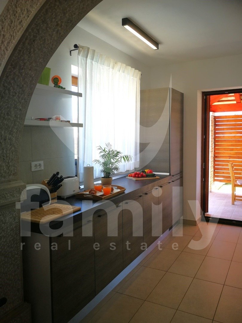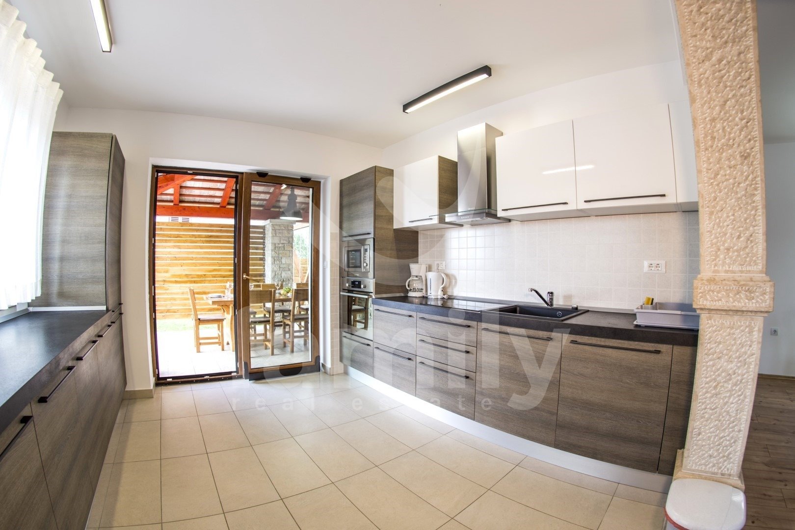 Nedaleč od središča Vodnjana in morja, v mirni vasici Barbariga, se nahaja ta kakovostna družinska hiša z bivalno površino 196 m2 in vrtom velikosti 460 m2. Hiša se razprostira na dveh nadstropjih, v pritličju se nahaja vhodna dvorana, stranišče za goste, prostorna in svetla dnevna soba z jedilnico in kuhinjo, skozi katero je dostop do terase, tlakovane s kamnom in opremljene z zunanjim vgradnim kaminom z istrsko jamo in jedilno mizo za 6 oseb, kurilnico, bazenom s prostorom za sončenje in zunanjim tušem. Drugo nadstropje oziroma prvo nadstropje sestavljajo tri udobne spalnice, vsaka s svojo kopalnico, pri čemer imata dve spalnici dostop do terase s čudovitim razgledom na morje. Hiša je opremljena s PVC stavbnim pohištvom, tla so prekrita s kakovostnim parketom in keramiko, medtem ko je sistem ogrevanja in hlajenja v celotni stavbi reguliran s 4 klimatskimi napravami. Nepremičnina je opremljena tudi s solarnim ogrevanjem, ki zagotavlja toplo vodo za 500-litrski bojler. Parkirna mesta so zagotovljena v nadstrešku z dvema pokritima parkirnima mestoma, medtem ko sta dve dodatni parkirni mesti na voljo v nepokritem delu.
