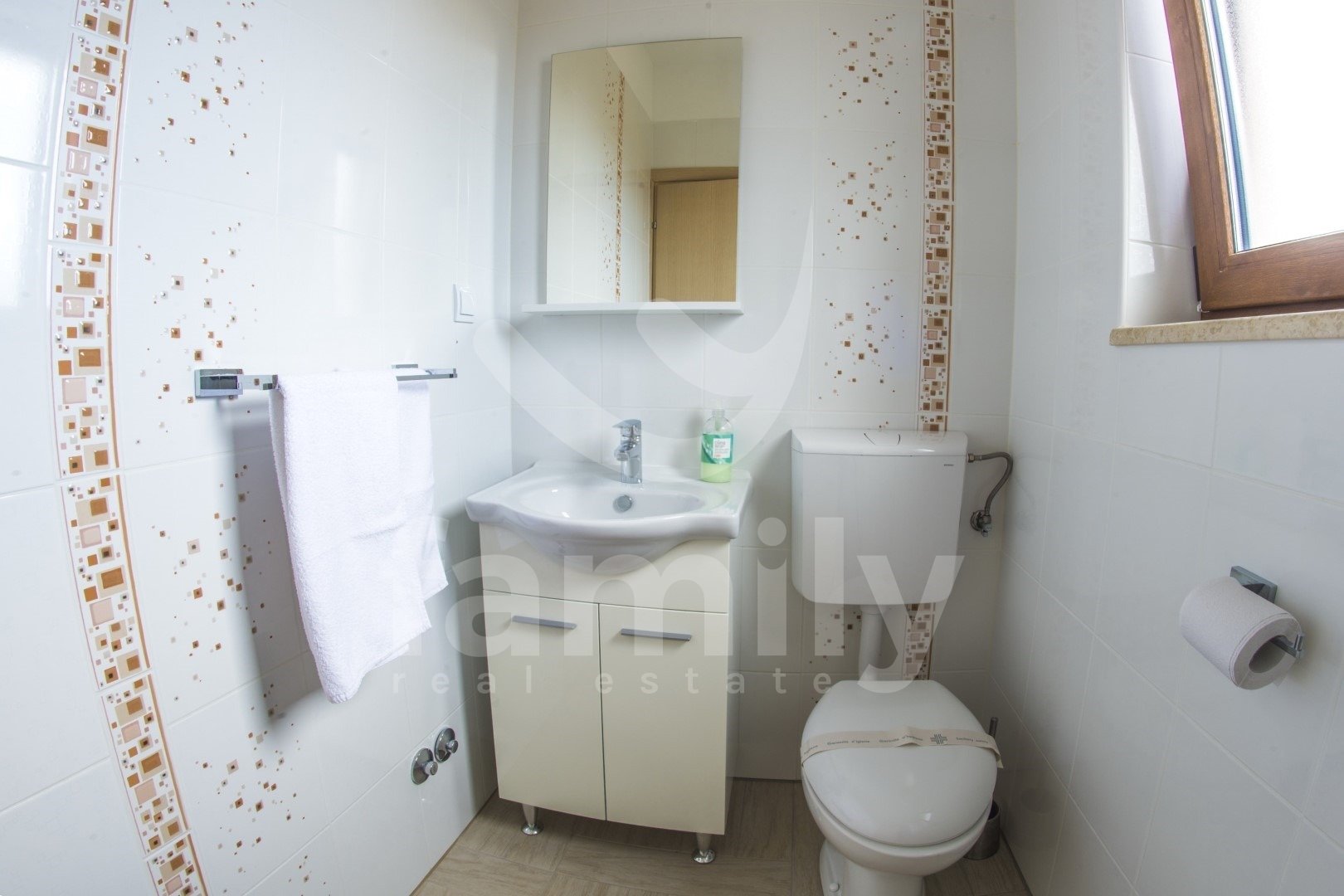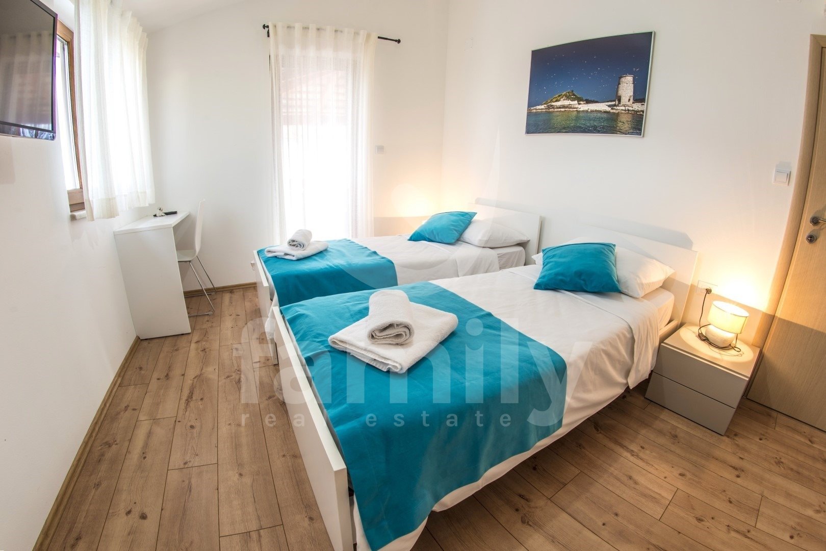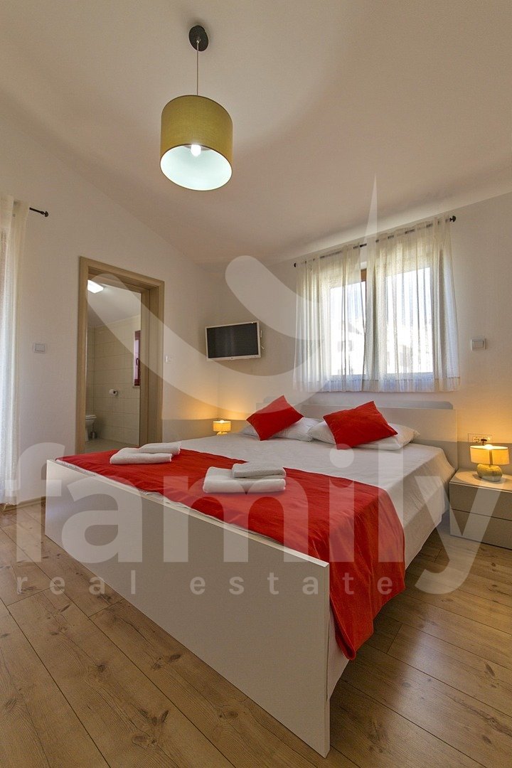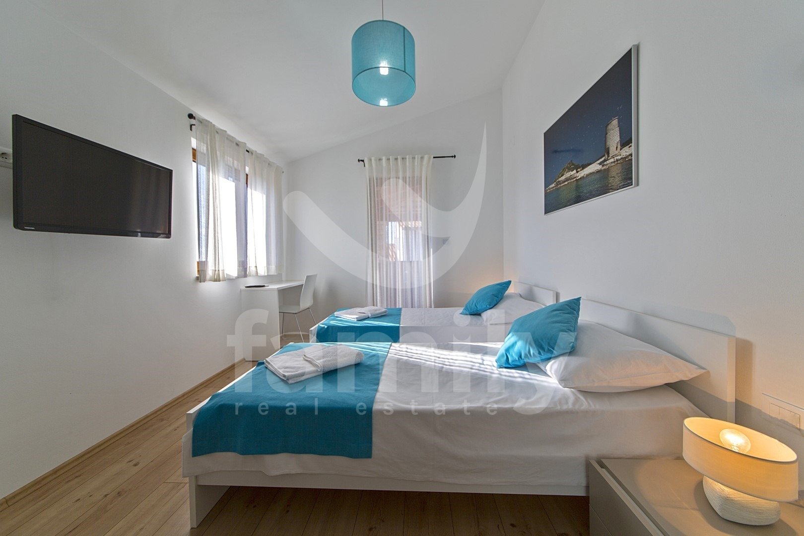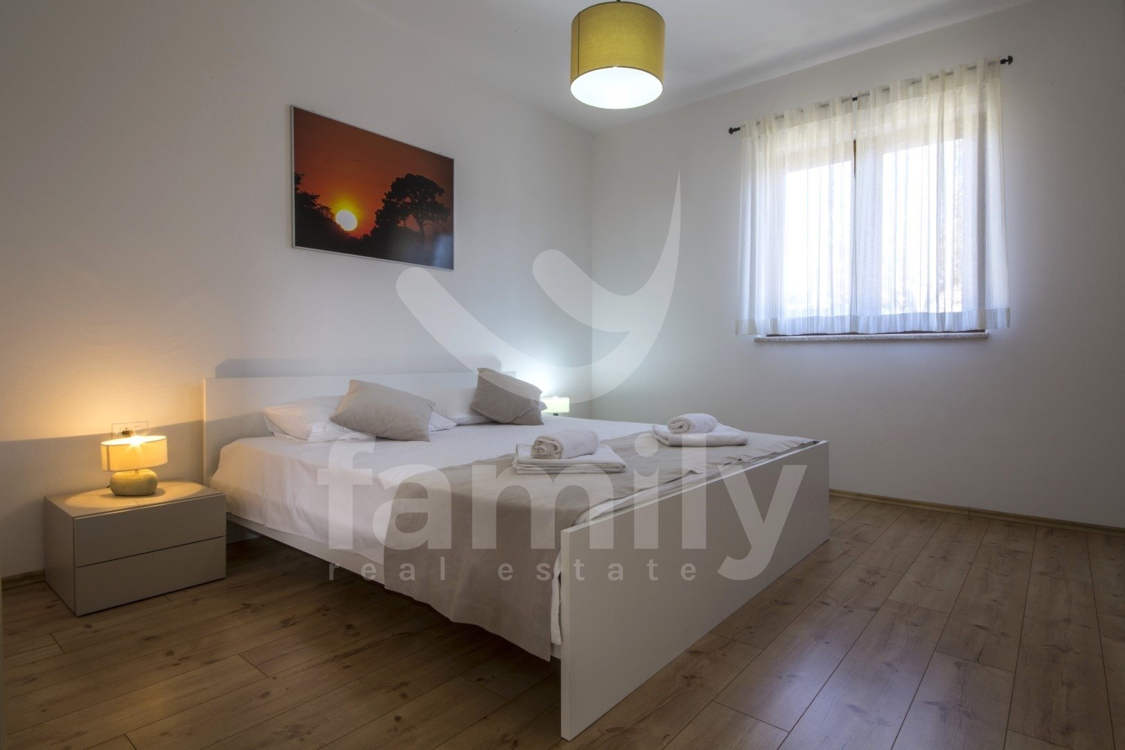 Nedaleč od središča Vodnjana in morja, v mirni vasici Barbariga, se nahaja ta kakovostna družinska hiša z bivalno površino 196 m2 in vrtom velikosti 460 m2. Hiša se razprostira na dveh nadstropjih, v pritličju se nahaja vhodna dvorana, stranišče za goste, prostorna in svetla dnevna soba z jedilnico in kuhinjo, skozi katero je dostop do terase, tlakovane s kamnom in opremljene z zunanjim vgradnim kaminom z istrsko jamo in jedilno mizo za 6 oseb, kurilnico, bazenom s prostorom za sončenje in zunanjim tušem. Drugo nadstropje oziroma prvo nadstropje sestavljajo tri udobne spalnice, vsaka s svojo kopalnico, pri čemer imata dve spalnici dostop do terase s čudovitim razgledom na morje. Hiša je opremljena s PVC stavbnim pohištvom, tla so prekrita s kakovostnim parketom in keramiko, medtem ko je sistem ogrevanja in hlajenja v celotni stavbi reguliran s 4 klimatskimi napravami. Nepremičnina je opremljena tudi s solarnim ogrevanjem, ki zagotavlja toplo vodo za 500-litrski bojler. Parkirna mesta so zagotovljena v nadstrešku z dvema pokritima parkirnima mestoma, medtem ko sta dve dodatni parkirni mesti na voljo v nepokritem delu.