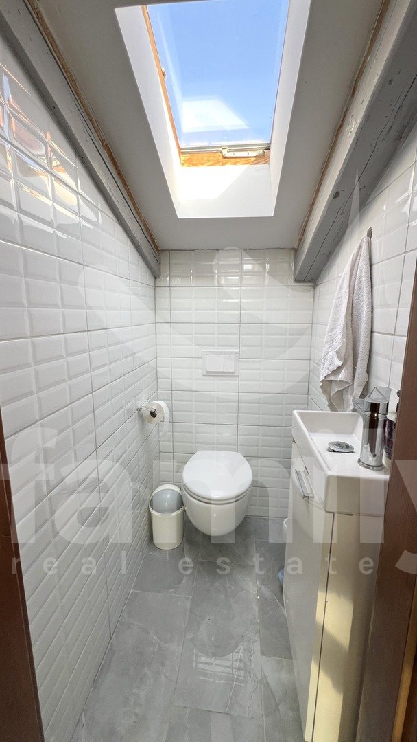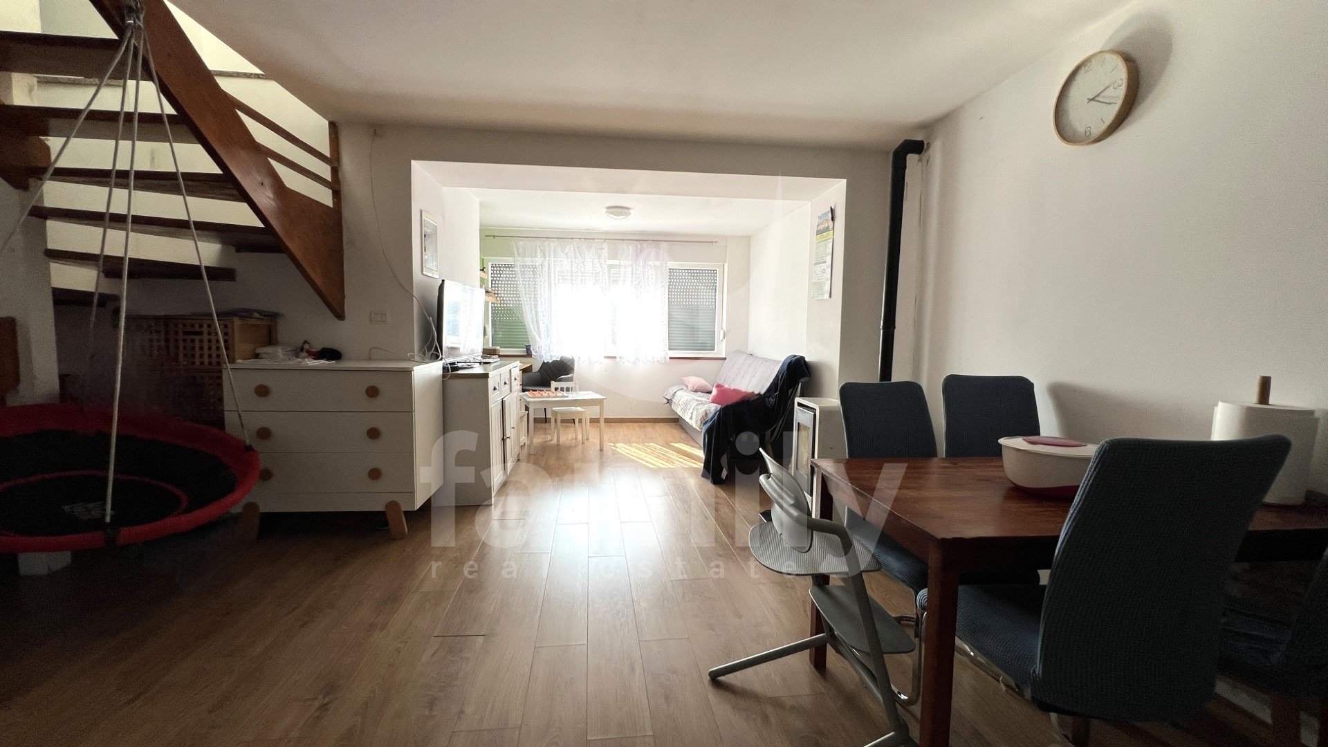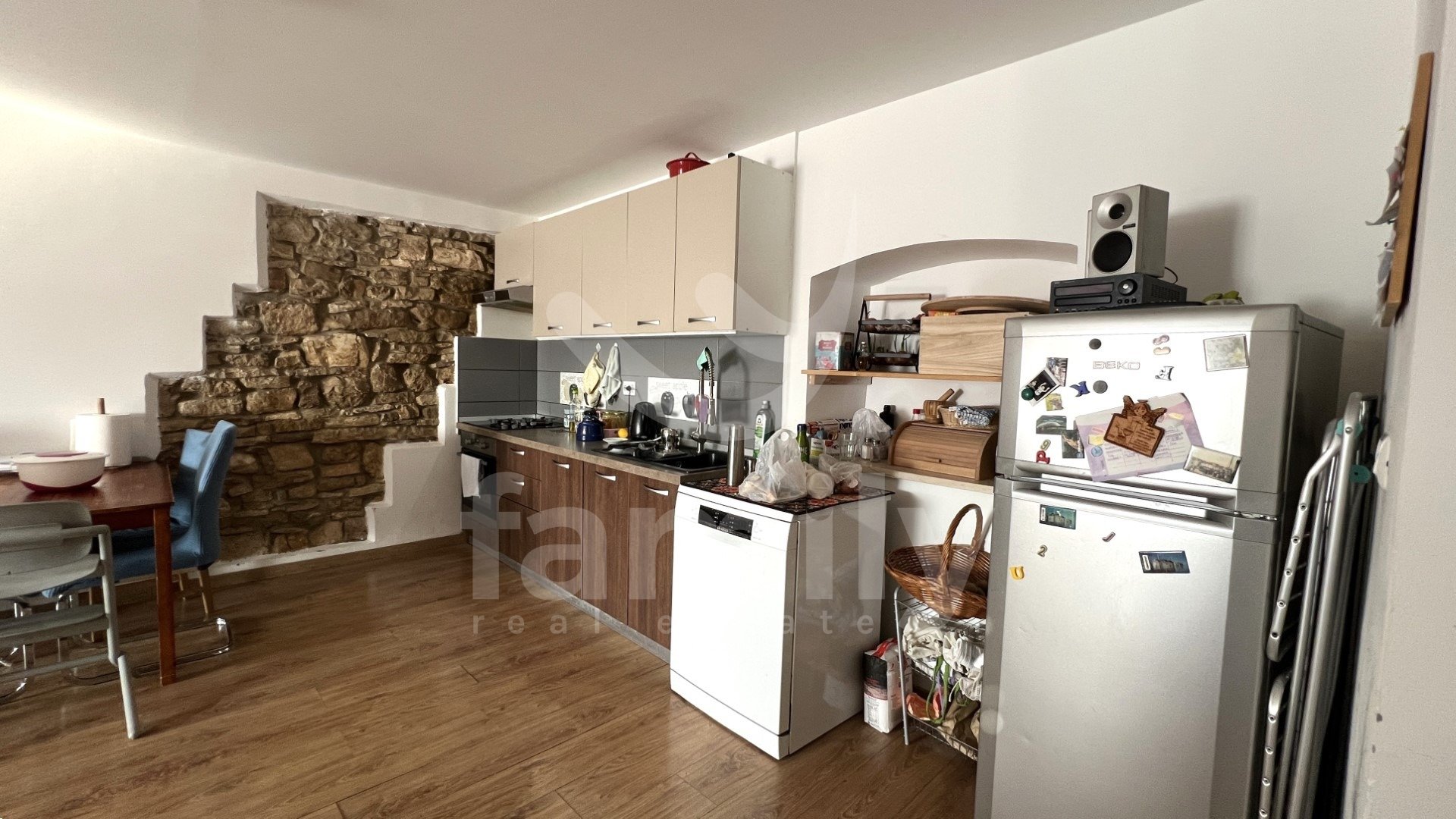 Gre za vrstno hišo s skupno bivalno površino 105 m2, ki je funkcionalno razdeljena na več stanovanjskih enot. V pritličju sta dva ločena manjša apartmaja, vsak opremljen s kuhinjo, jedilnico, dnevno sobo in kopalnico, zaradi česar sta idealna za turistični najem ali nastanitev gostov. Zunanje stopnice vodijo v prvo nadstropje, kjer se nahaja prostornejše stanovanje, ki ga sestavljajo kuhinja, jedilnica, svetla dnevna soba in kopalnica. Iz stanovanja notranje stopnice vodijo v podstrešje, kjer sta dve udobni spalnici in dodatno stranišče. Tla v hiši so prekrita s kombinacijo keramike in laminata. Vgrajeno je leseno in PVC stavbno pohištvo, ogrevanje v prvem nadstropju pa je regulirano s pečjo na drva.